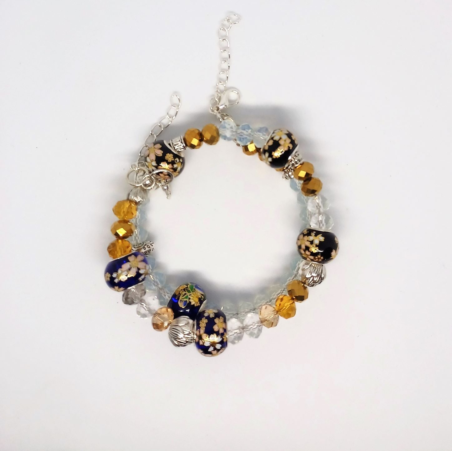 A beautiful statement piece with blue and black Murano beads with gold, white and green hand painted flower buds. White Opal crystal, clear crystal and gold Czech crystal beads nicely accent this piece. Soft opal with deep blue and black Murano beads make this piece suitable for special as well as any and all occasions The bracelet is secured with oyster shell terminators on both ends, two extensions and two lobster clasps for a comfort fit and security. Beaded with memory wire the bracelet conforms to the wrist and keeps its shape.