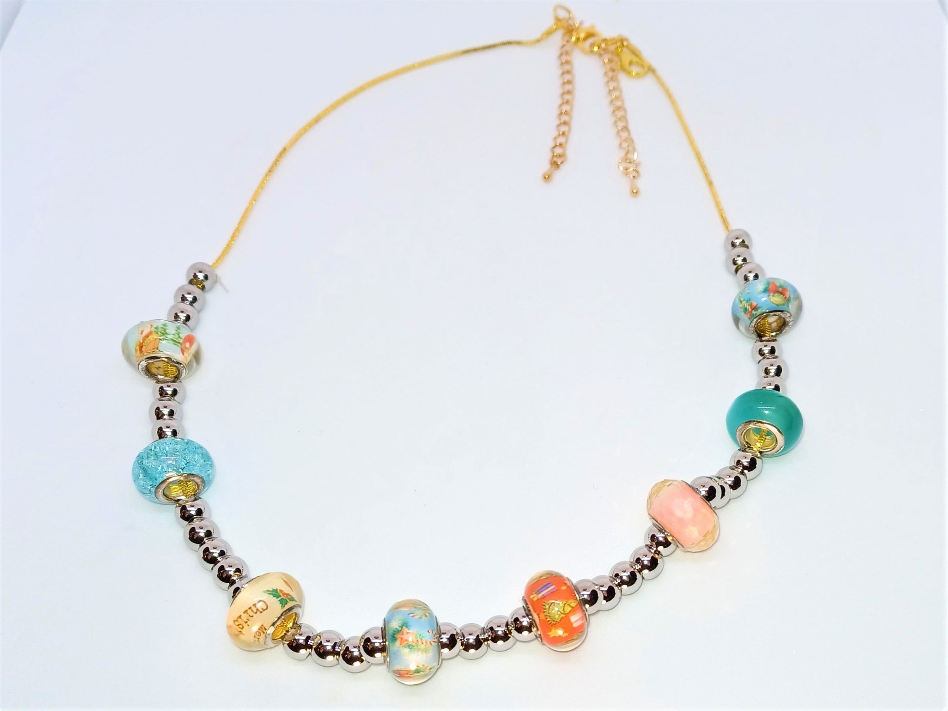 A colorful necklace with lampwork beads and round silver beads. Three shade of blue, white, and pink beads on a gold snake chain necklace, mixed with silver beads shines in the sunlight. The necklace is 16in in length with two gold lobster clasps and two gold extensions for adjustments in sizing and comfort.