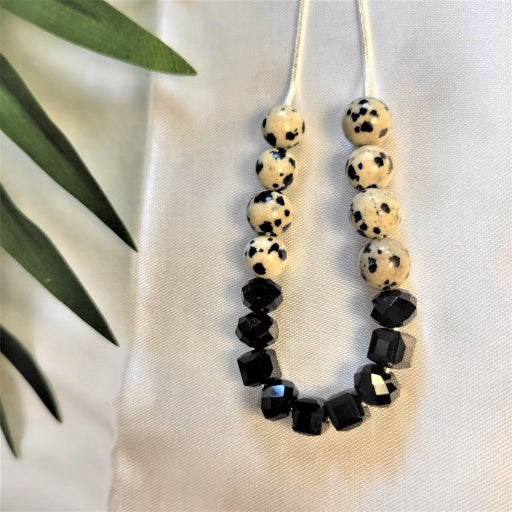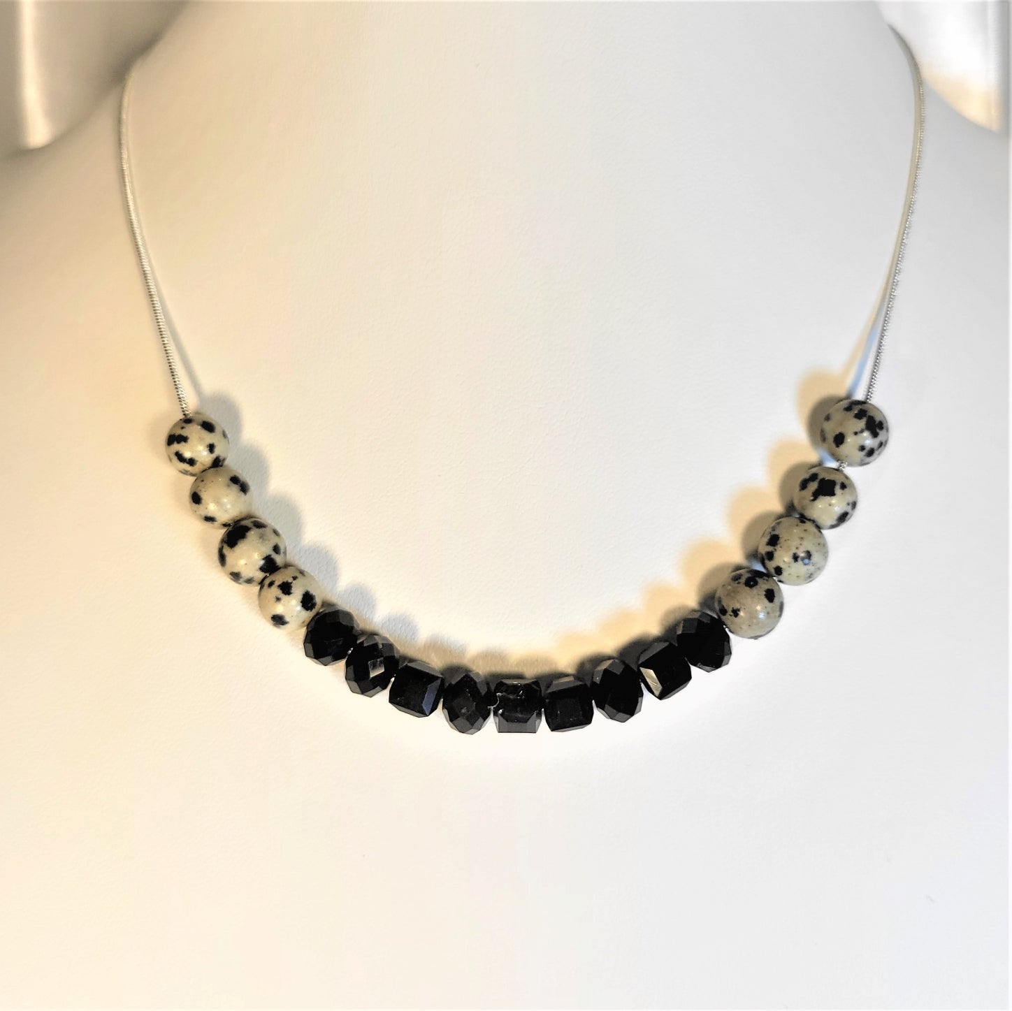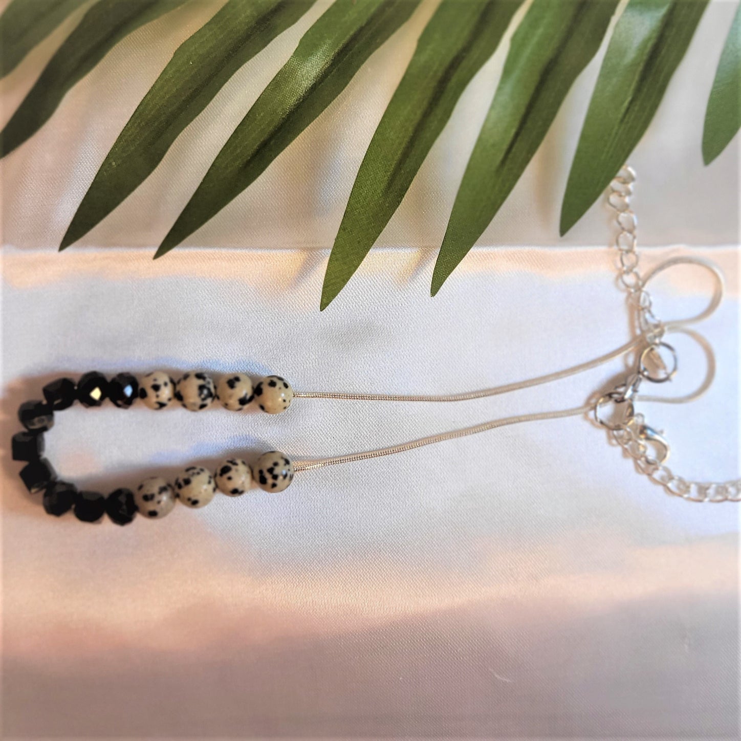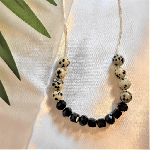 This Dalmation Spot gemstone bead necklace is 16" in length with two extensions for sizing and comfort. In addition, there are Czech crystal beads and cubed black beads for added effect. It is beaded on a silver plated chain with a silver lobster clasp.