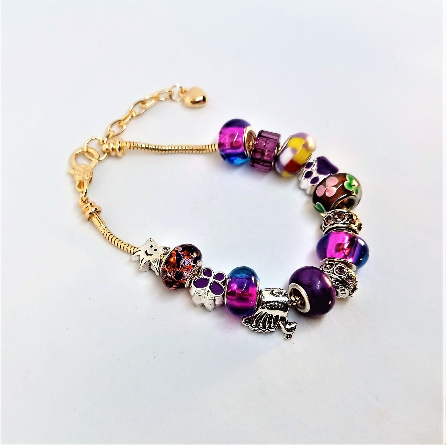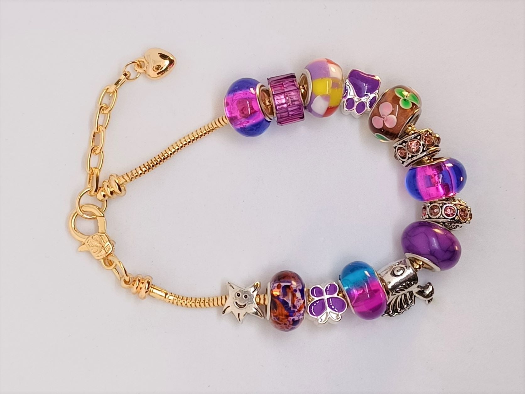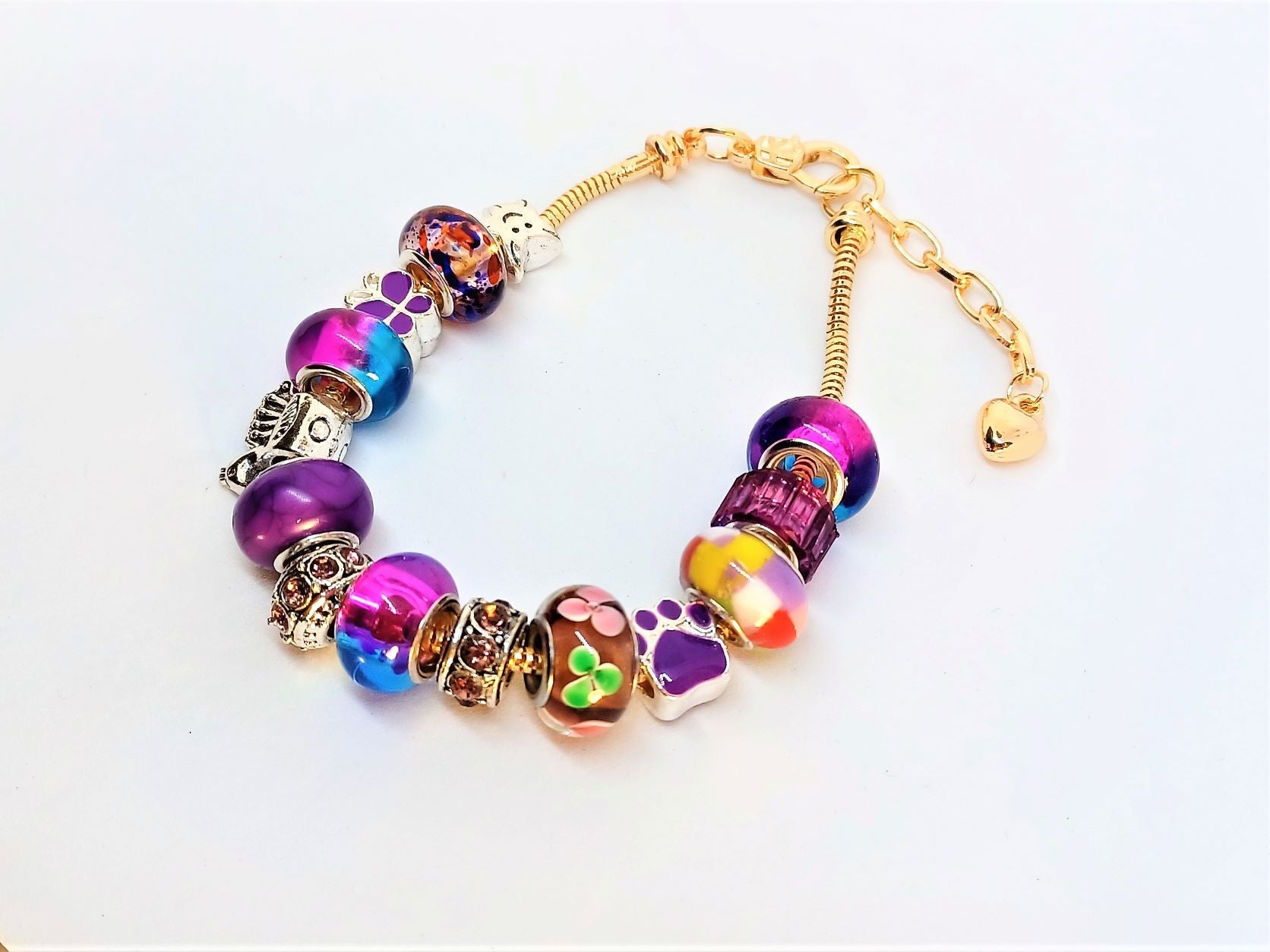 A lampwork beaded bracelet in purple, blue and fuschia with accents of green, pink, red, white and yellow. There are also silver beads, one with a purple paw print and a butterfly in purple along with a smiling face on a star. In addition, there are silver beads with purple rhinestones. This colorful bracelet is 7.5inches in length. It is beaded on a gold snake chain bracelet with a gold extension, a gold heart and a gold lobster clasp.