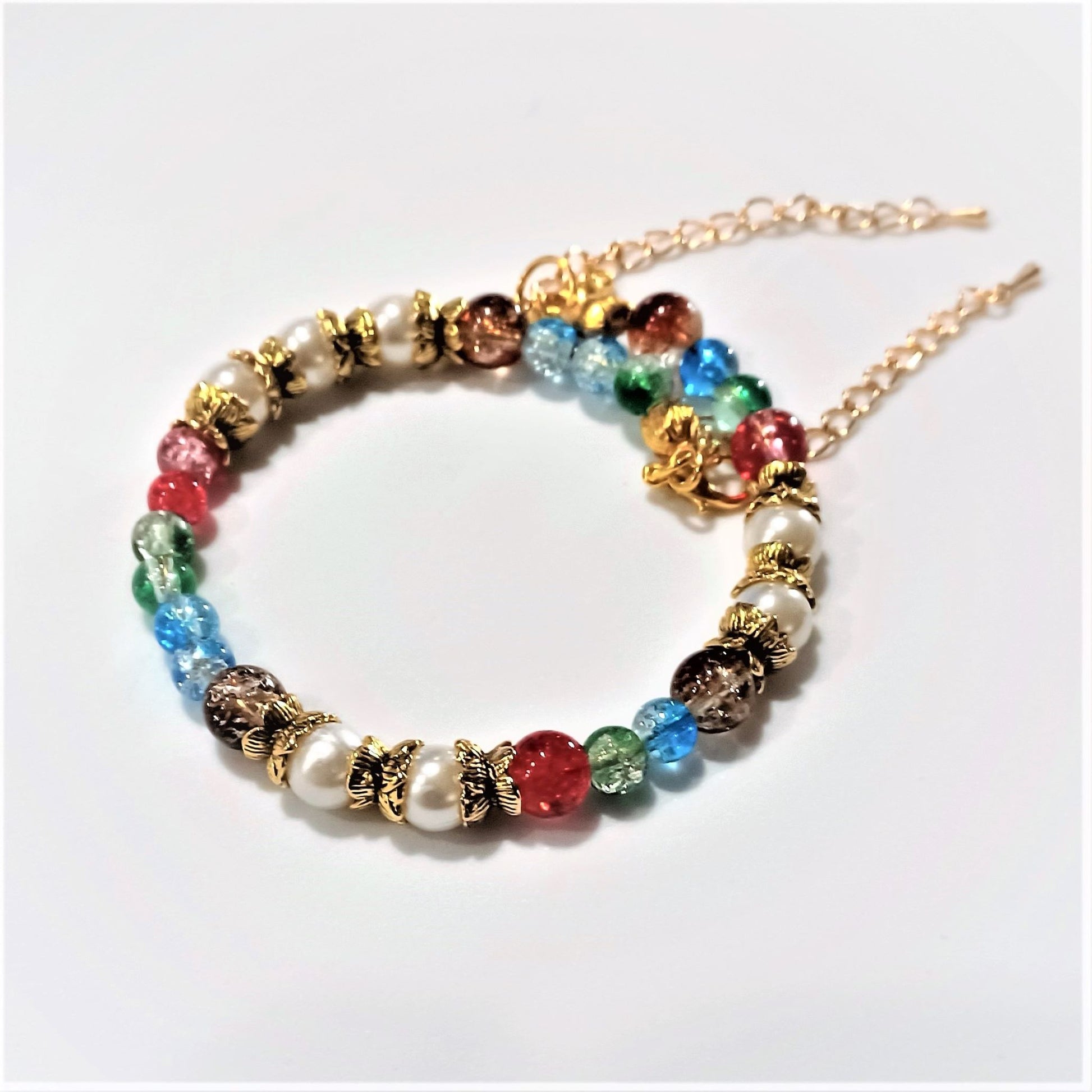 A bracelet that shines, this single strand multicolored piece is comprised of white glass pearl beads mixed with cracked glass beads. Gold dual end bead caps add even more shine and luster. Gold oyster shell terminators on both ends secure the beads. Two extensions and two lobster clasps allow for adjustments in fit and a secure bracelet. Memory wire conforms to the wrist and maintains the bracelets shape.
