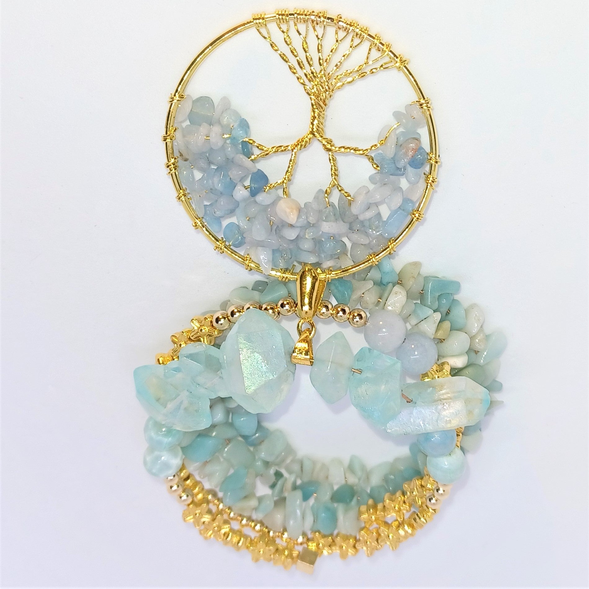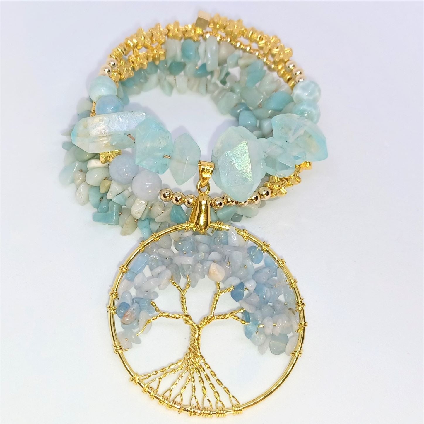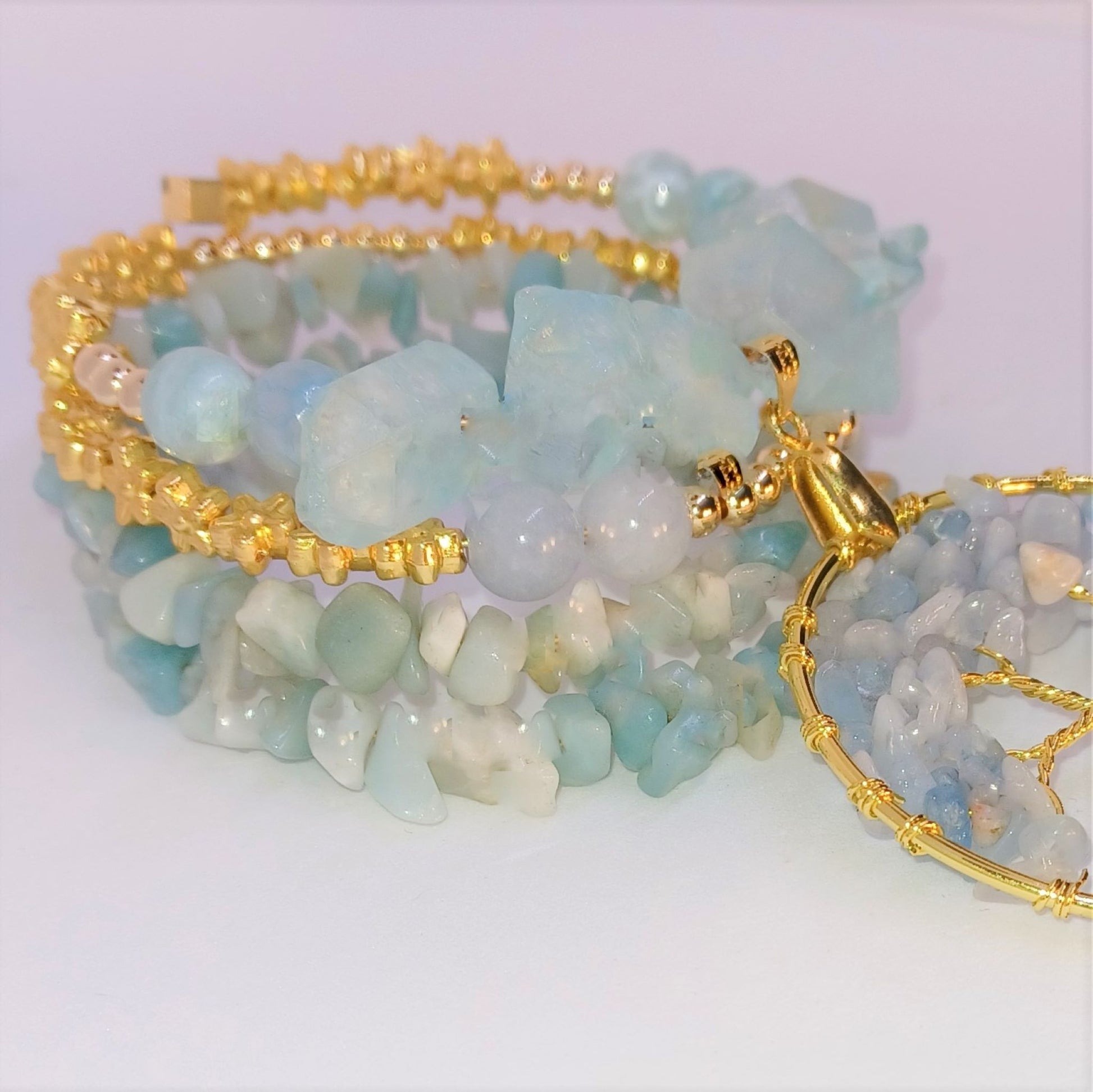 A beautiful wrap bracelet with genuine stones and a Tree of Life pendant. We are thrilled to offer this piece. The Tree of Life pendant is wrapped beautifully in gold with light blue amazonite chip stones. Comprised of Natural gemstones the bracelet is accented with two different sizes of round gold accent beads. The bracelet is beaded using memory wire which conforms to the wrist and keeps its shape. The end terminators, on both ends of the bracelet, are gold cubed. This bracelet, with it's soft effects, can be worn on any and all occasions and is a statement piece to be admired.