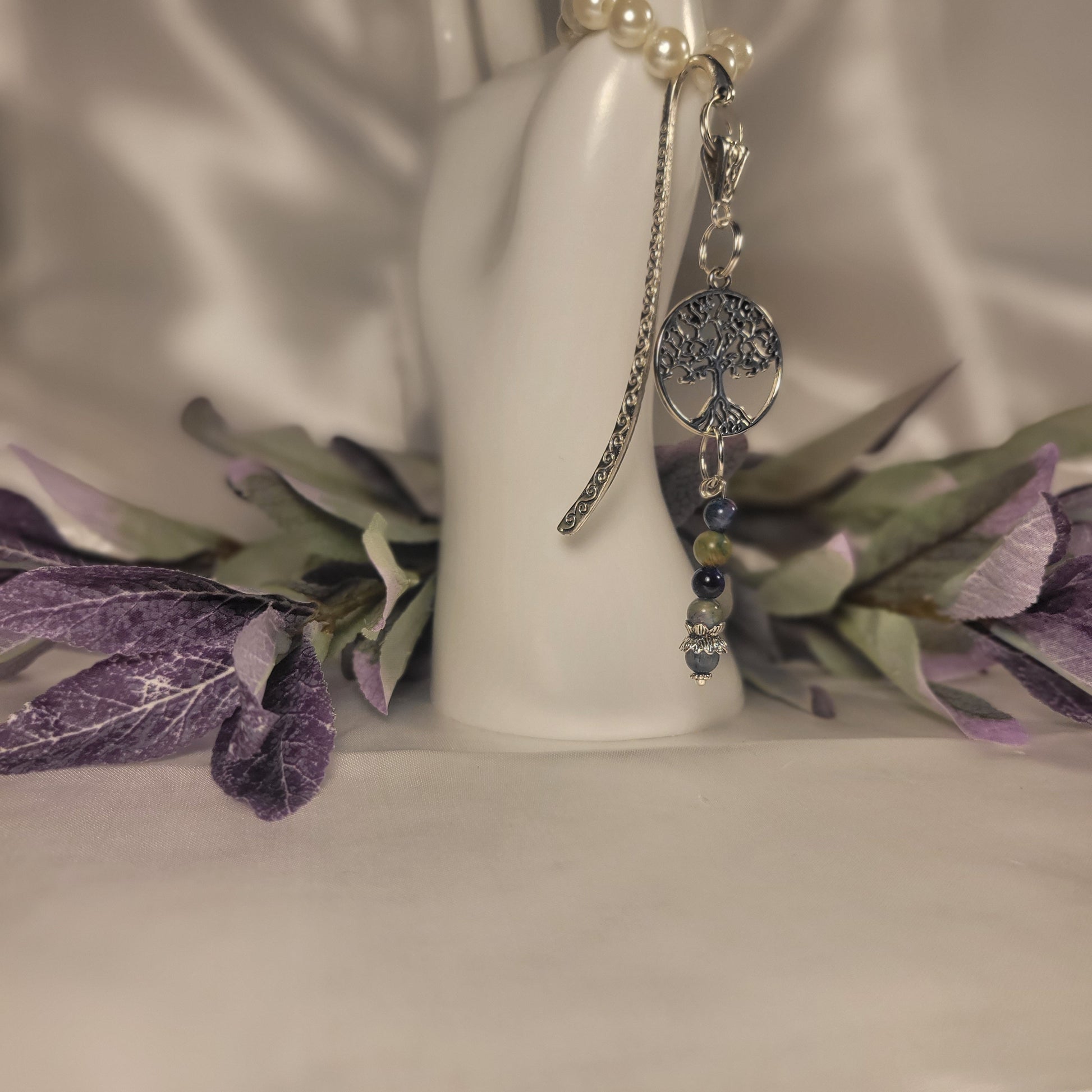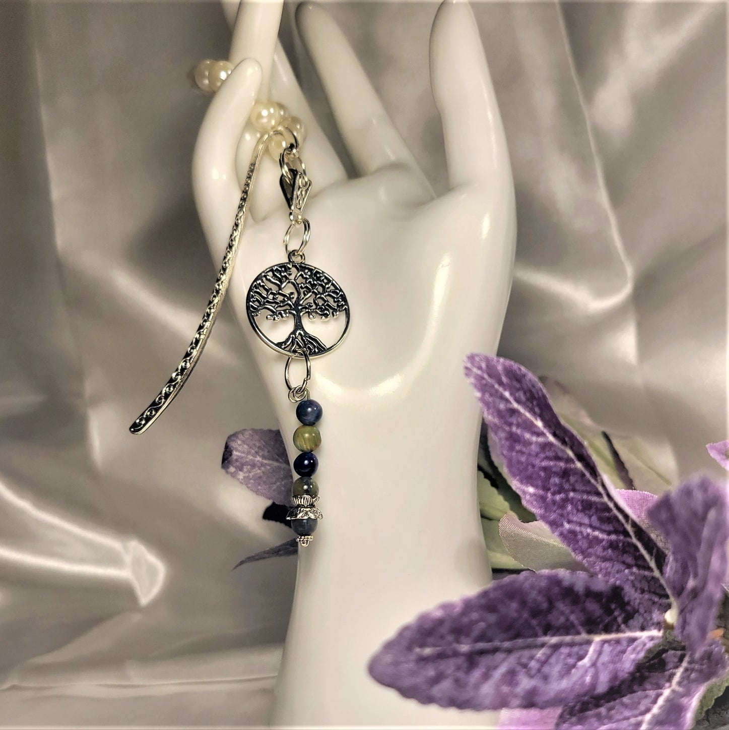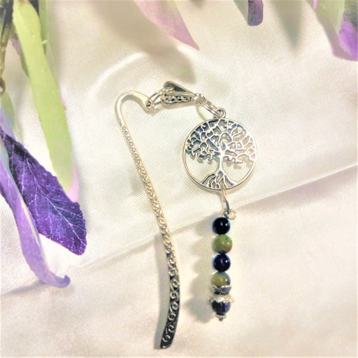 This bookmark is unique for the enthusiastic reader. This is Violet Jade, the Sea Sediment Ocean Jade in beautiful purples, blues and violets. The multiple colors are fascinating. These stones bring peace and wellbeing to everyone that reads with their assistance. Also, there is a Tree of Life charm which gives reflection on one's life and family in an instant. This pendant charm bookmark is a must for the avid reader, student or anyone who wants to "mark their page". The bookmark hook itself is made of steel and will last a lifetime.