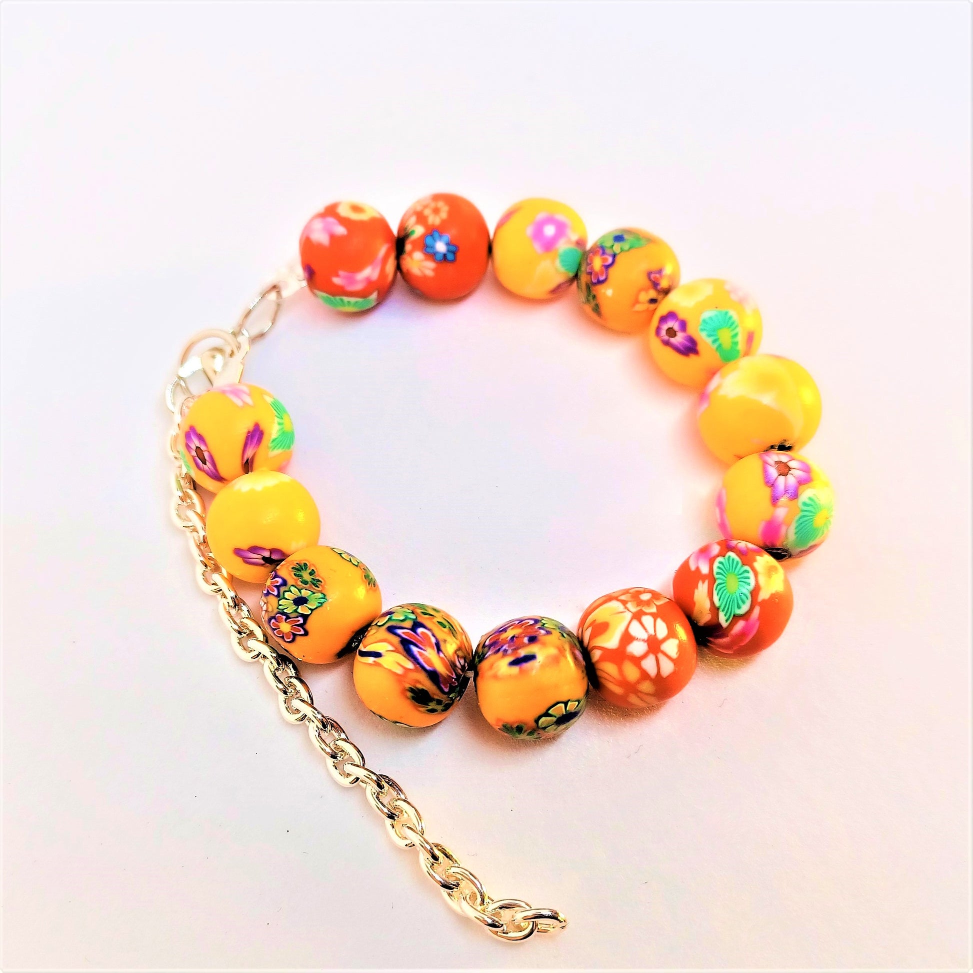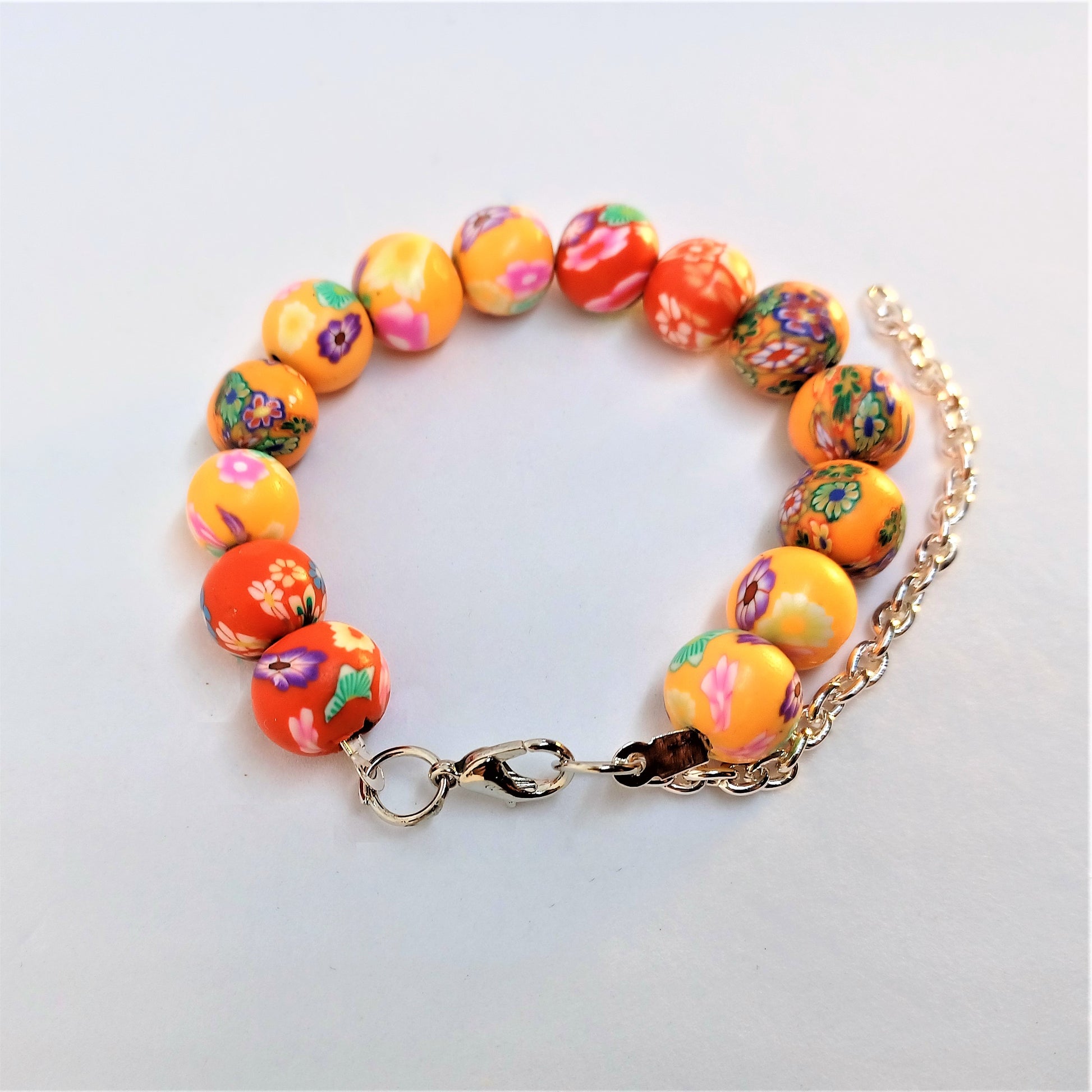 A clay bracelet with green, pink, blue and purple vibrant colors. In addition there are shining gold cubed beads that add to the color. The bracelet is 6 to 6.5 inches in length and is beaded on an elastic rope chain. There is a gold extension and gold lobster clasp for any adjustments needed.