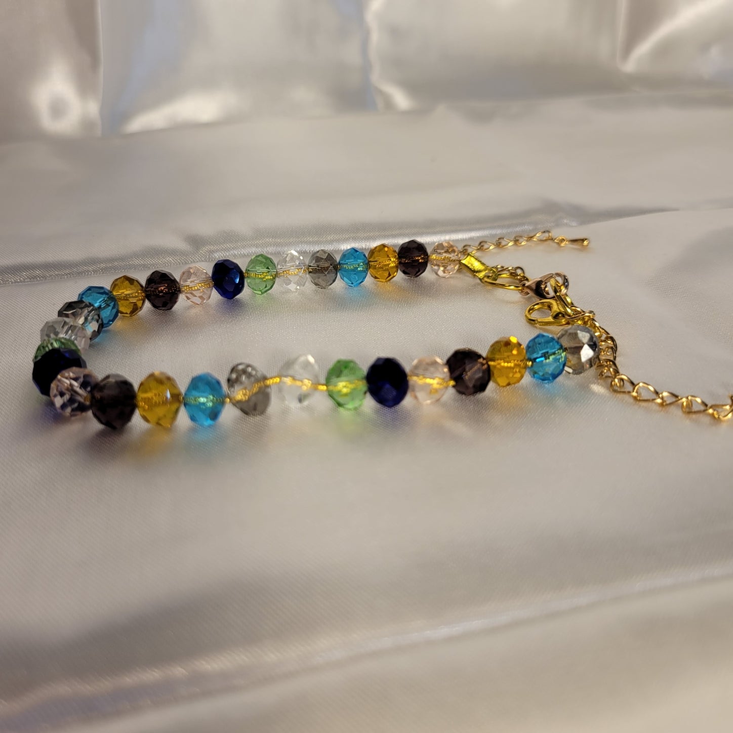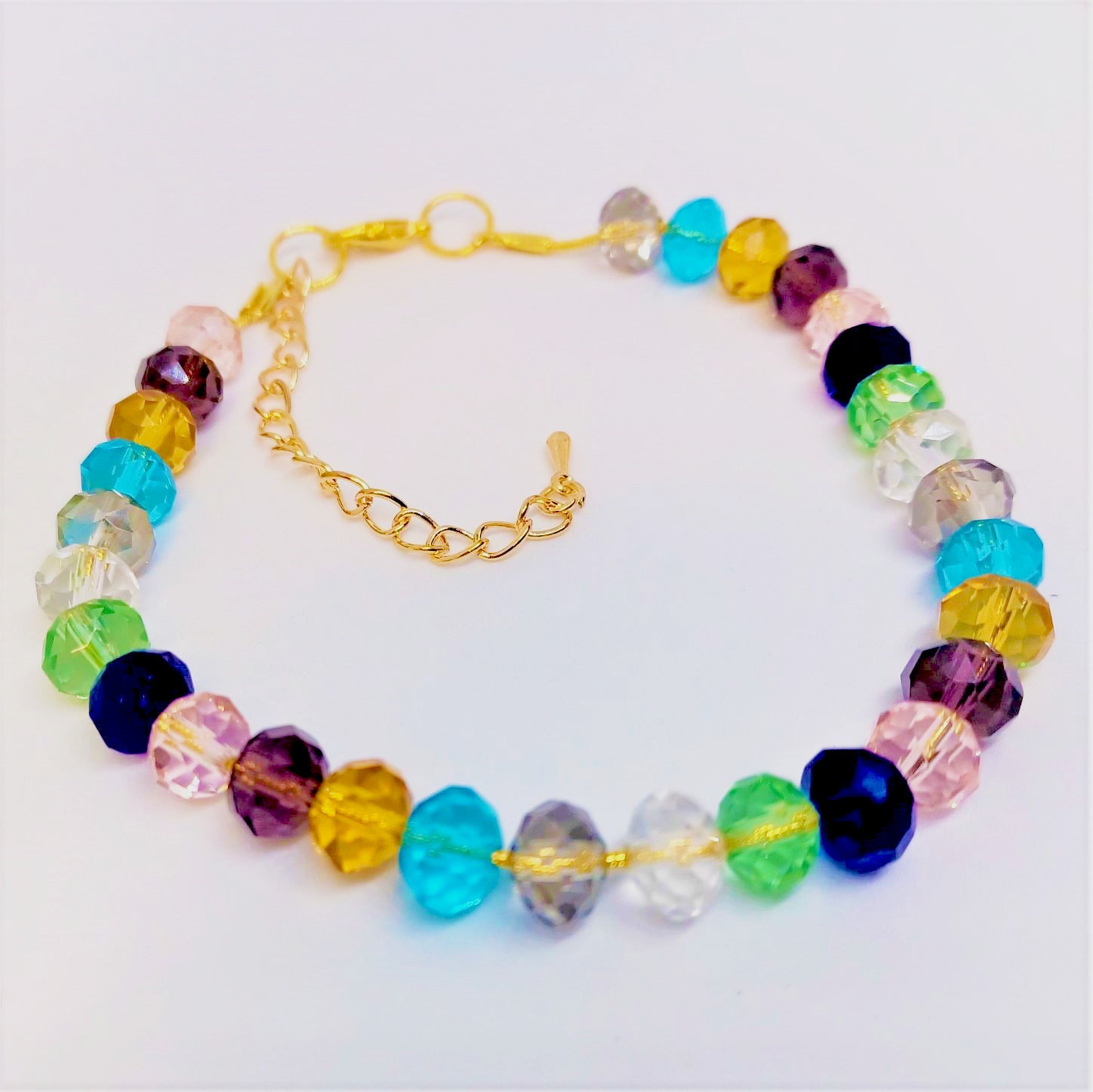 A single layer bracelet on a gold plated chain with multicolored crystal faceted beads of crystal glass. With brilliant color this bracelet can be worn for any and all occasions. The beads are secured with an oyster shell chain at each end with two extensions and two lobster clasps for adjustments in size.