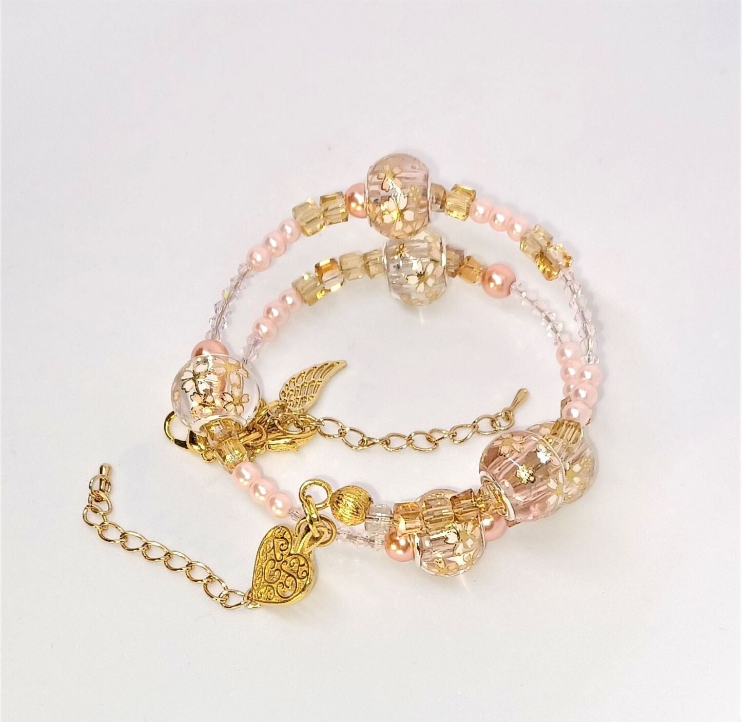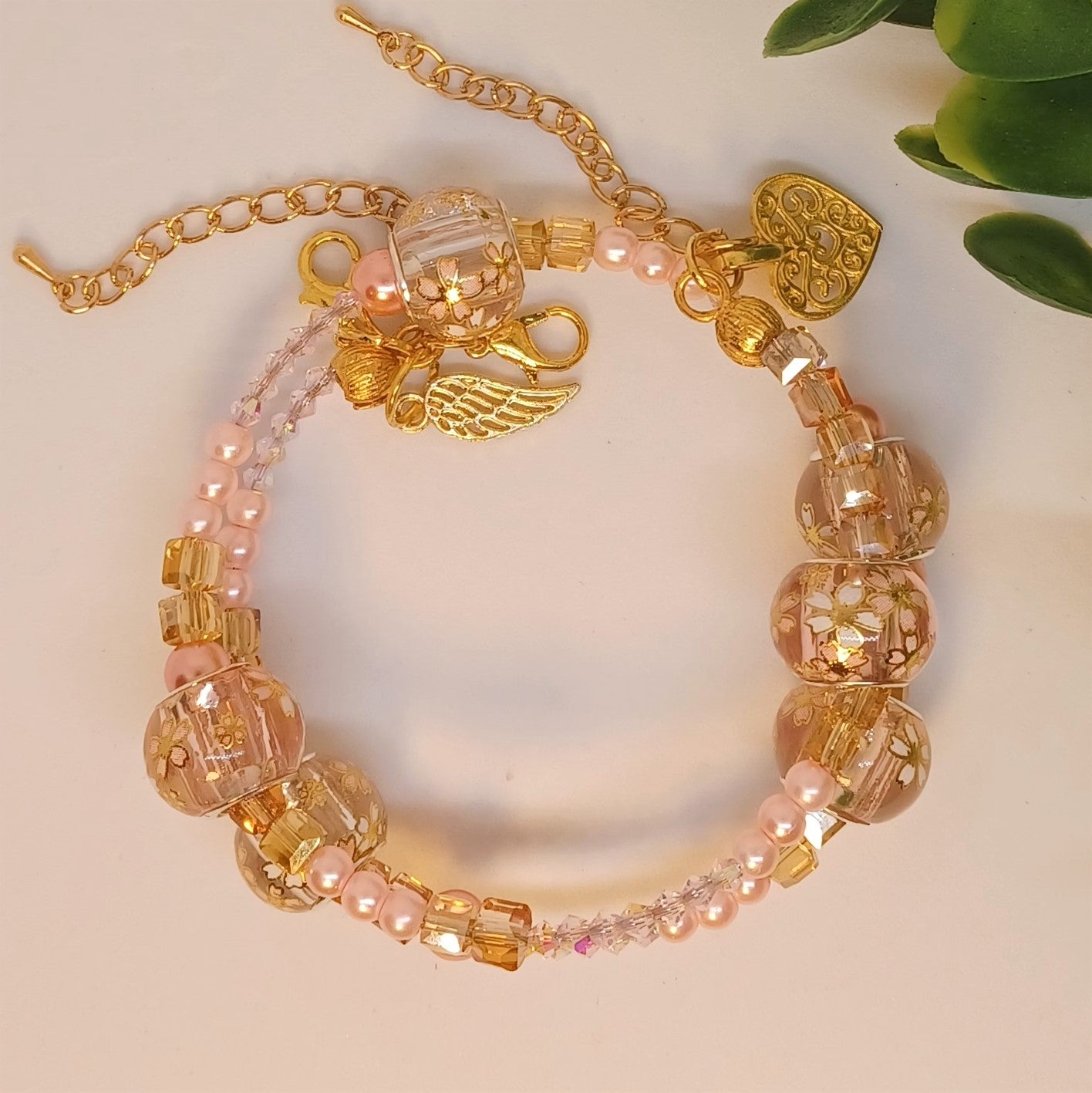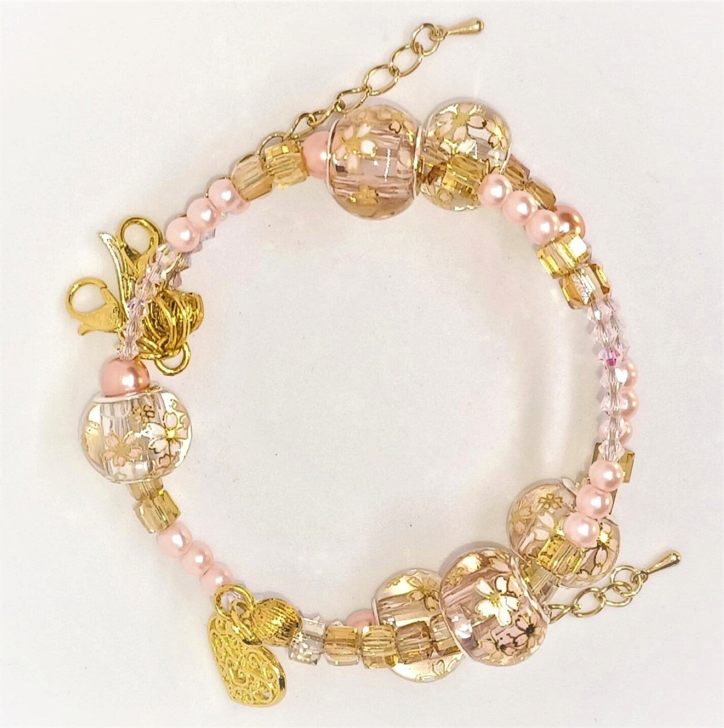A two layer bracelet comprised of clear gold tinted Murano beads, pink glass pearl beads, cubed crystal gold beads, and beautiful tiny preciosa pink beads. There are two charms, a gold leaf and a gold heart.. Two gold extensions and two gold lobster clasps are attached for sizing and a secure fit. A piece that can be worn on any and all occasions.