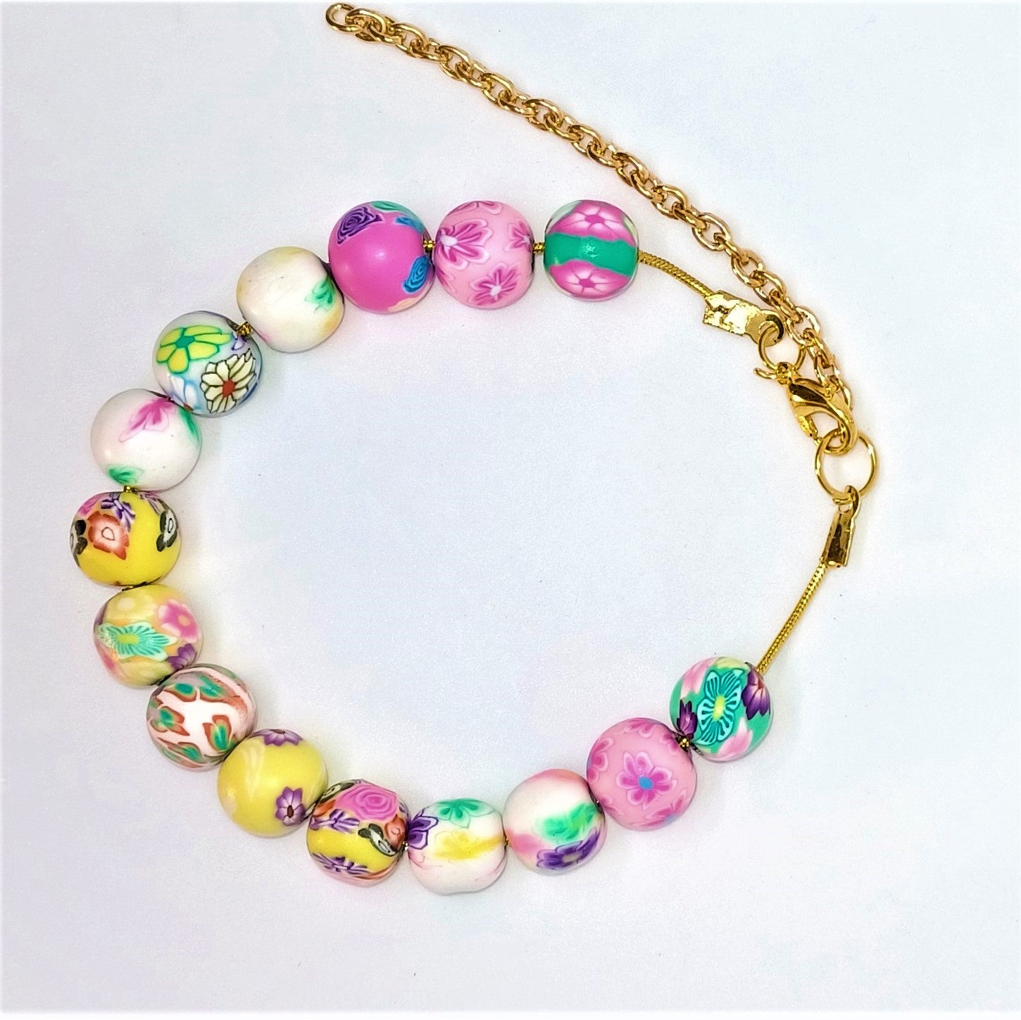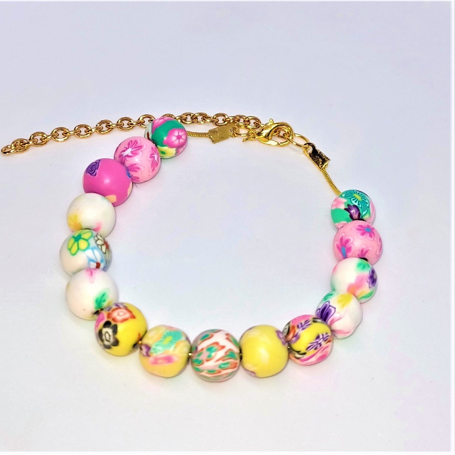 A cute clay bead bracelet with pink, green, white and yellow beads. This is a gold snake chain bracelet that is approximately 7-8inches in full length and has an approximate diameter of 4inches when placed on the wrist. The bracelet has a lobster clasp and gold extension for adjustment of fit. Care of the bracelet includes not wearing when swimming or bathing and avoiding exposure to lotions. Remove the piece at bedtime and store in a dry envoronment.