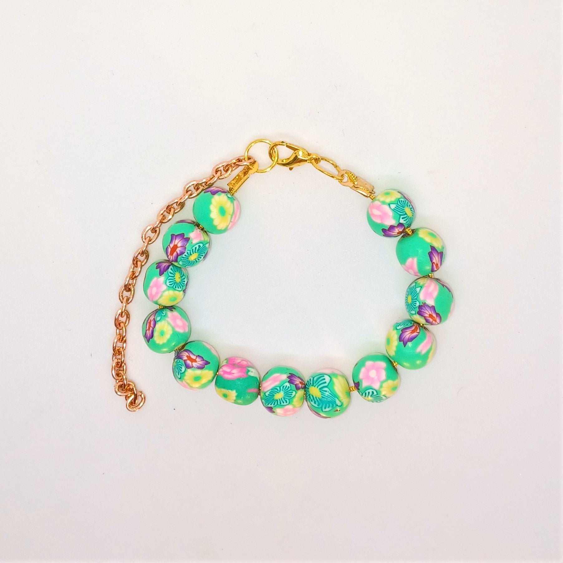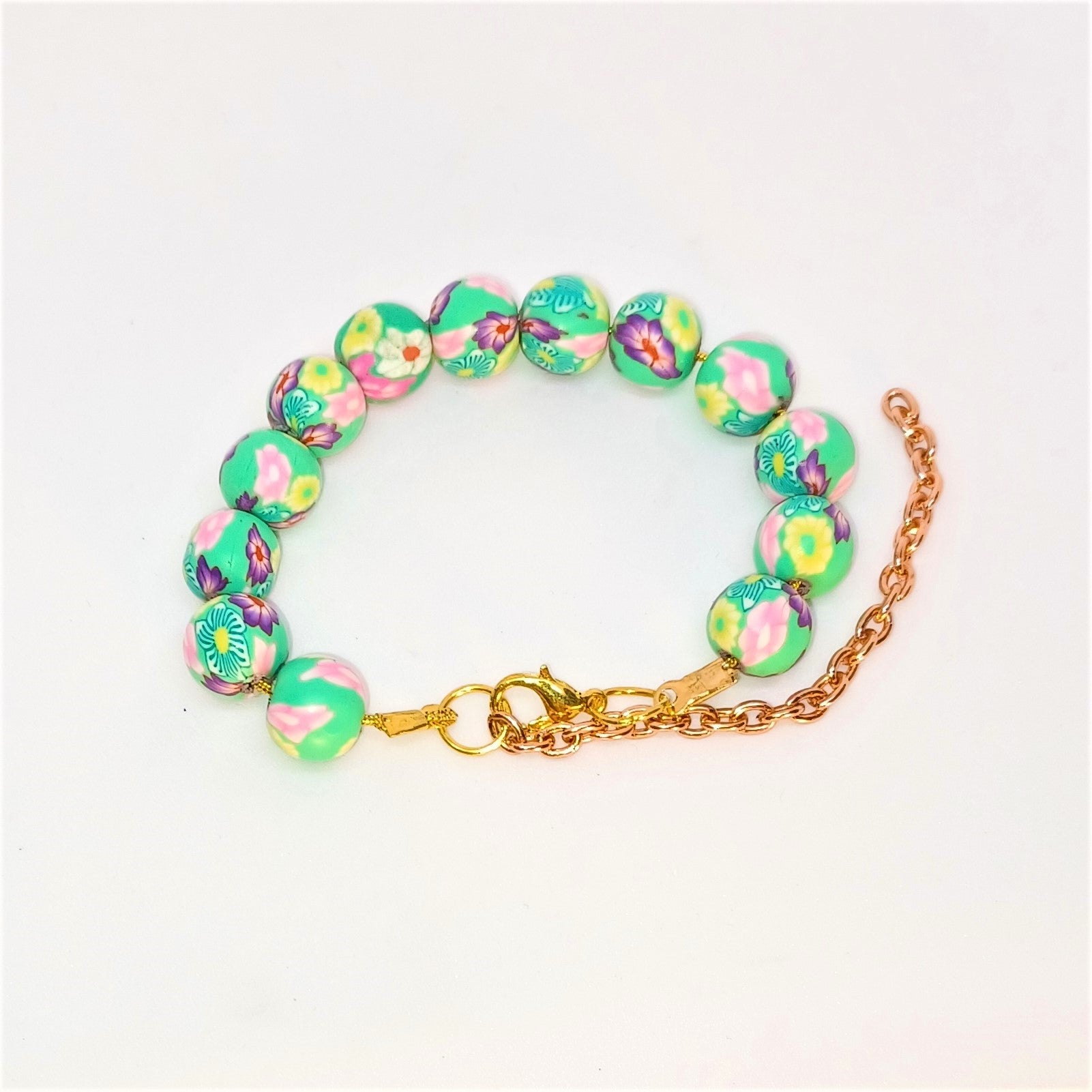 A cute bracelet with green, pink and yellow clay beads. Beaded with a gold snake chain bracelet with a lobster clasp and extension the bracelet is 5.5-6inches in length and has an approximate diameter of 1.5 to 2inches.
