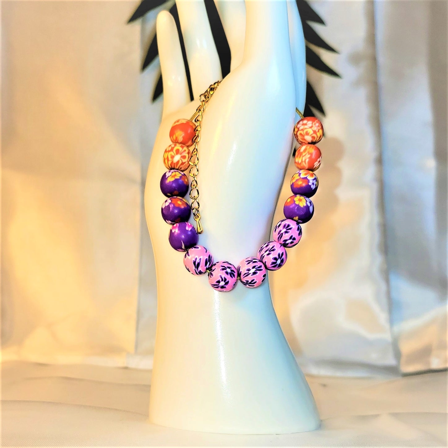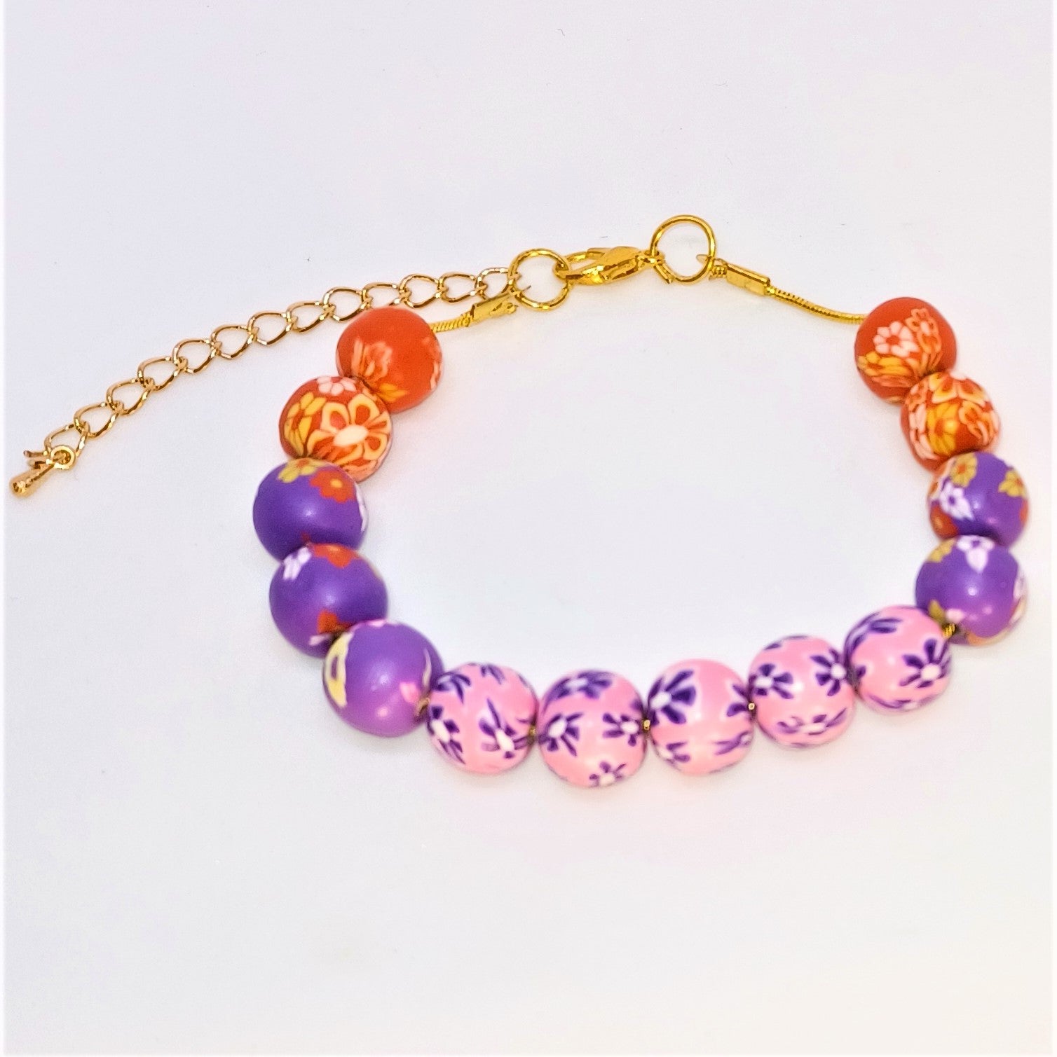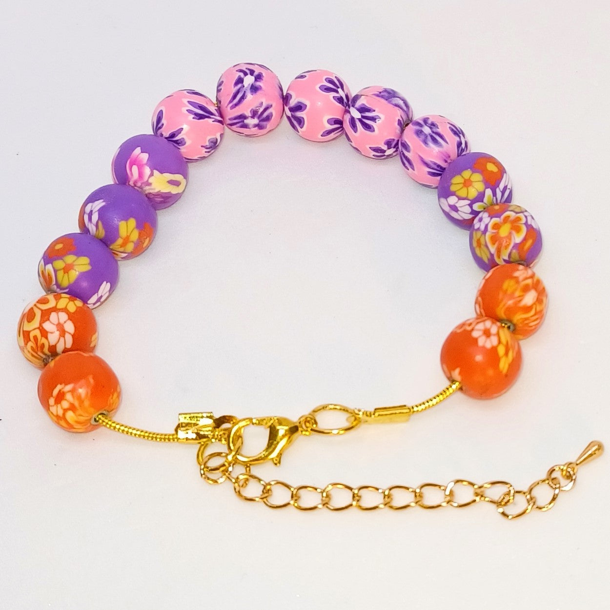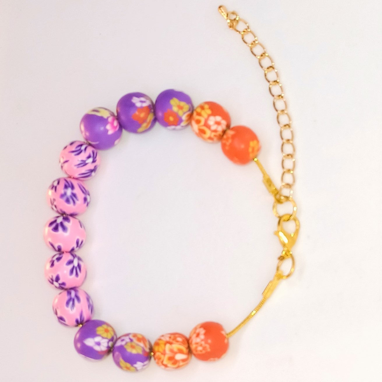 A colorful bracelet with pink, purple, orange and yellow mixed color clay beads. The bracelet is 7inches in length and does not stretch. Beaded on a gold snake chain bracelet with a gold lobster clasp and gold extension for adjustment and sizing the bracelet is secure.