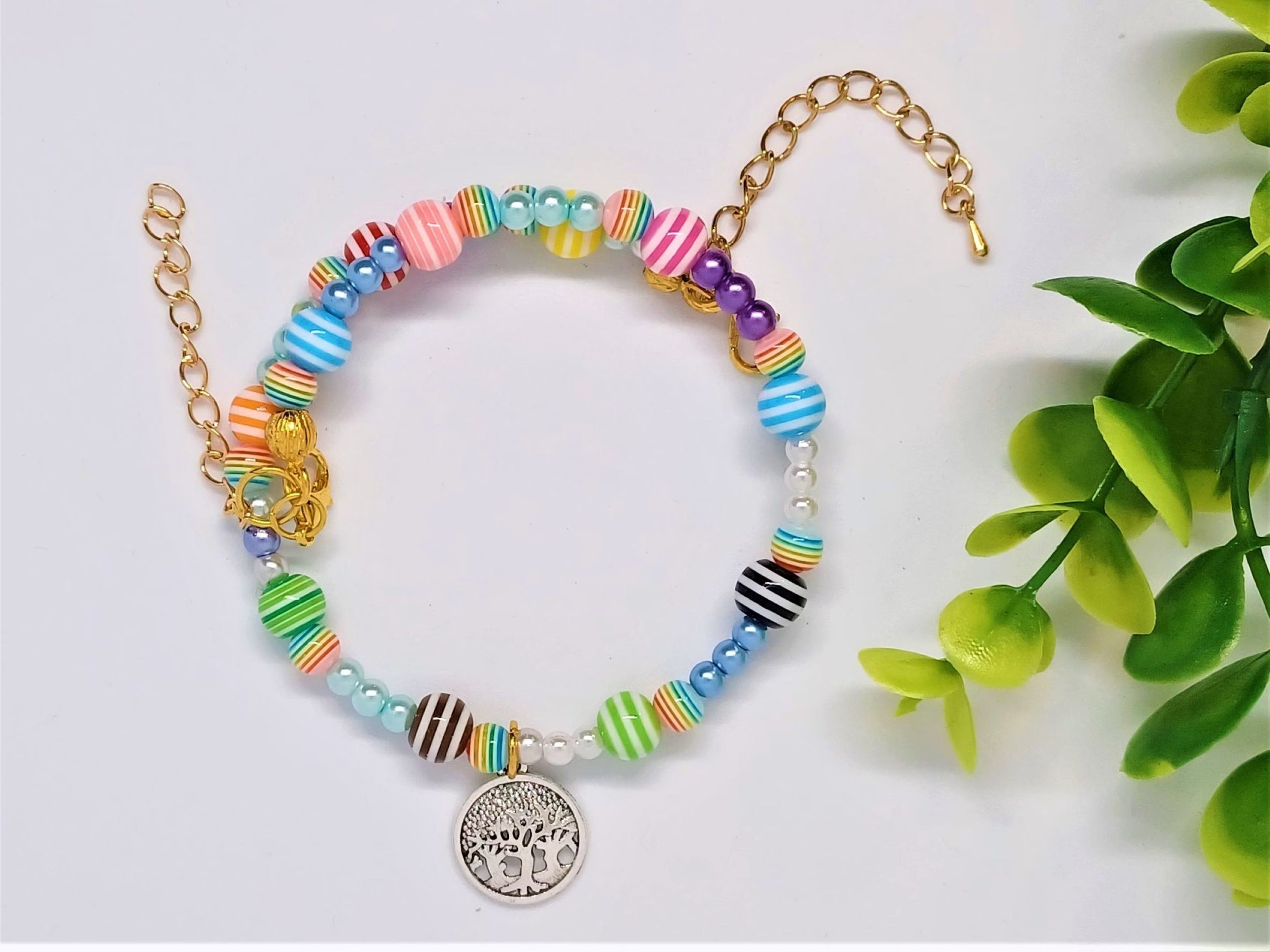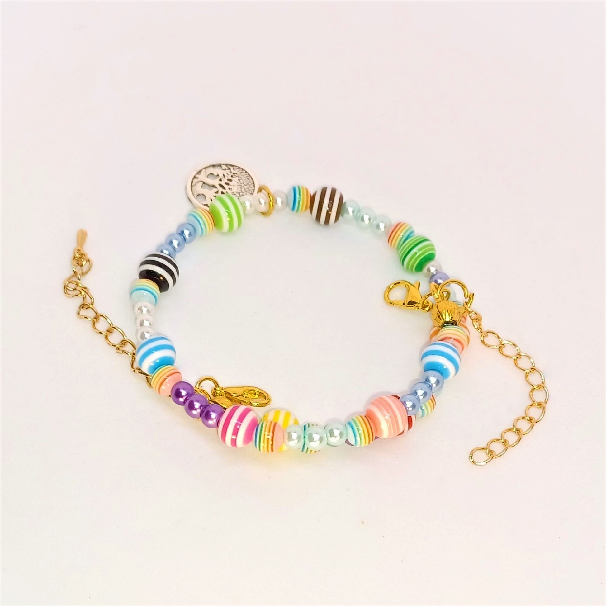 A cute bracelet made for kids. There are striped acrylic beads and pearls in multiple colors. The beading is done with memory wire and is not elastic. There are two lobster clasps and two extensions for security and a nice fit. The bracelet should conform to the wrist and keep it's shape. It is 2 to 2.5 inches in diameter and approximately 9in. long. The bracelet is intended to wrap around the wrist and the beads are secured with two oyster shell terminators at each end. There is a Tree of Life charm attached.