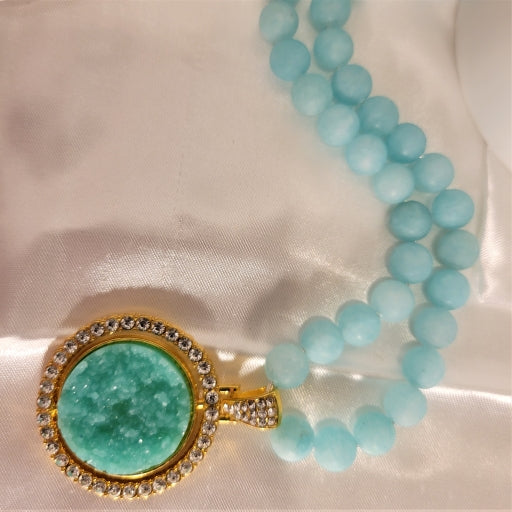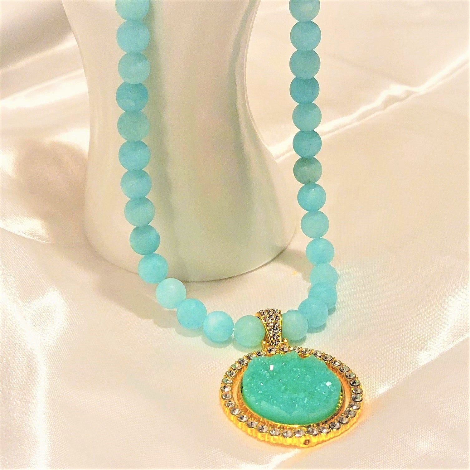A 26in pendant necklace comprised of light blue Amazonite Matte Jade stone beads with a 25mm nugget fauz druzy. The druzy, in a sky blue color, is held in a round pendant setting of braided edge in antique gold surrounded with rhinestones. This pendant is unique. The braided edge pendant has a reverse side for a picture or other applique. The round glass dome for the reverse side is included. An elegant pendant necklace, full of color, for any and all occasions.