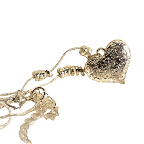 | A silver plated 16in chain necklace with a silver finished double sided heart pendant. The pendant has decorative swirl etching. It is accented with round silver beads that give the pendant a nice shine. "The Silver Heart always shines." |