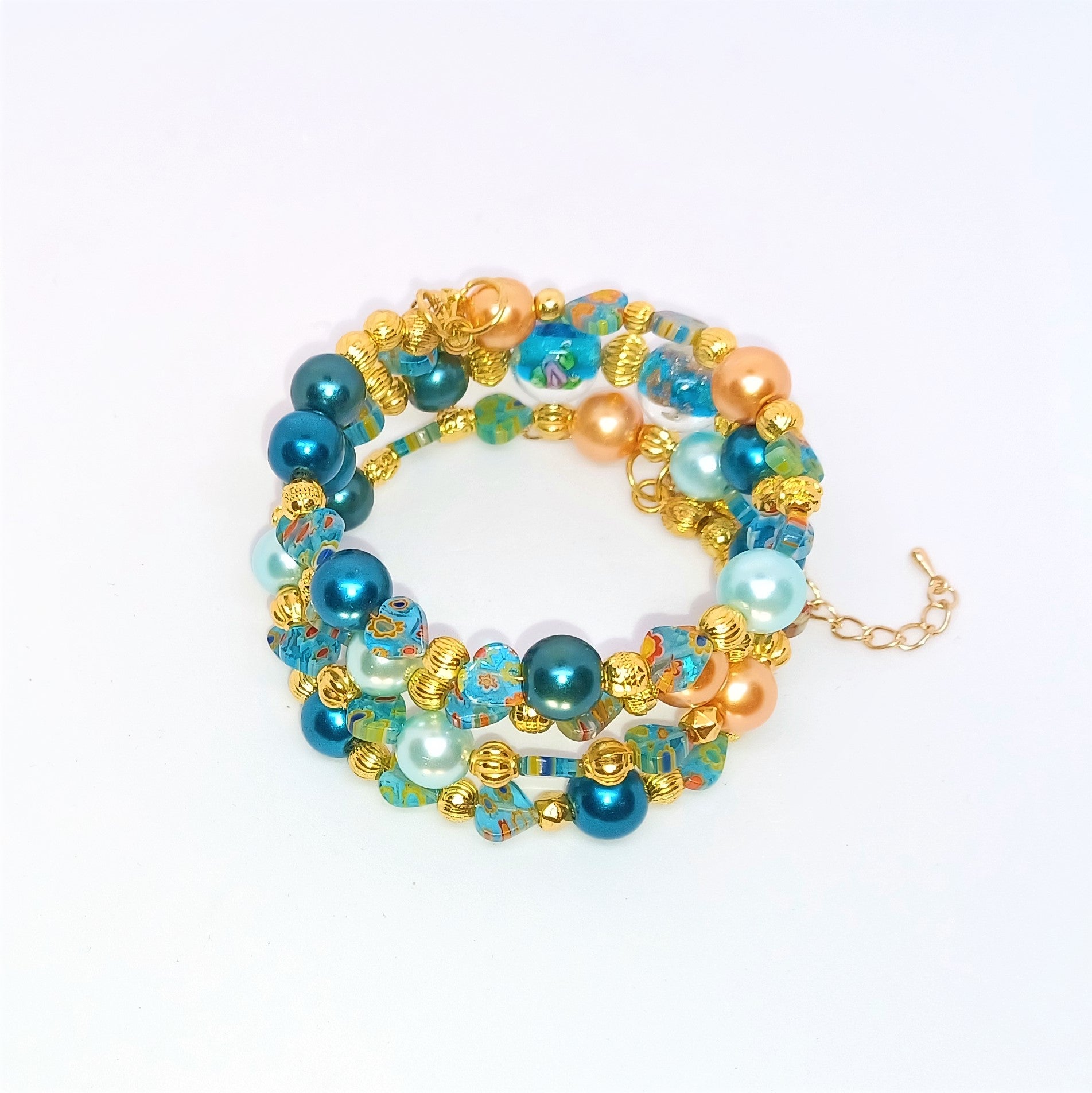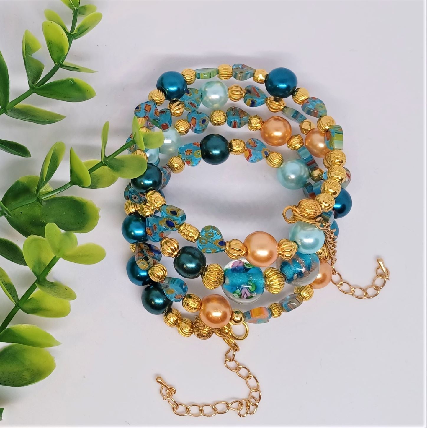 A four strand beauty this bracelet is comprised of pearls in two shades of blue and a coral shade. In addition, there are heart shaped glass Millefiori beads and two large glass beads on the front of the bracelet. Accented with gold beads this is a statement bracelet with charm. Oyster shell bead terminators secure the beads, additionally there are two extensions and two lobster clasps for adjustment. Memory wire beading conforms the bracelet to the wrist and maintains the bracelets shape.