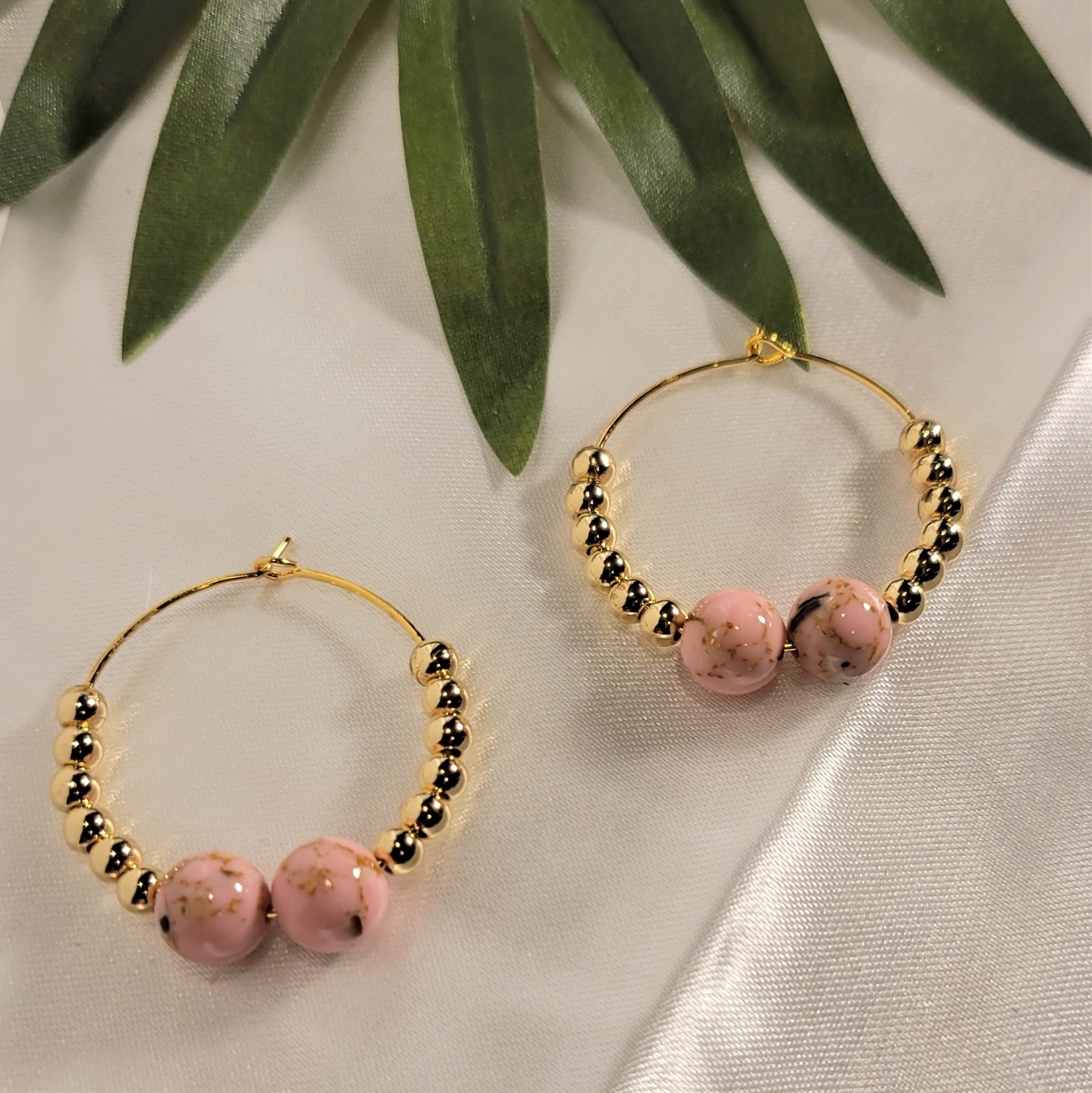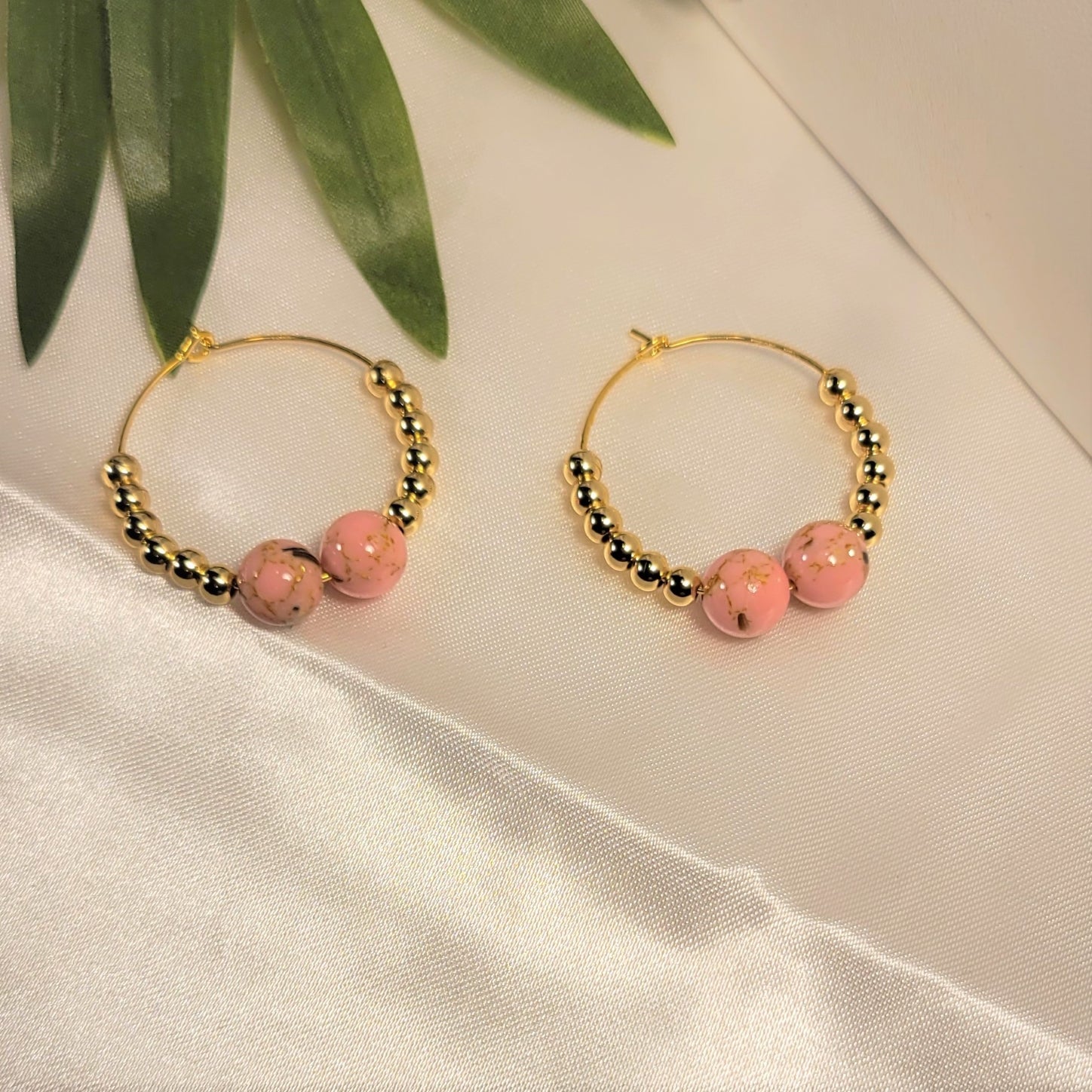 A set of 18K gold plated hoop earrings, 25mm in size, with pretty pink 8mm Howlite stones surrounded by gold round beads. Earrings that will make anyone feel like a million and looking great.