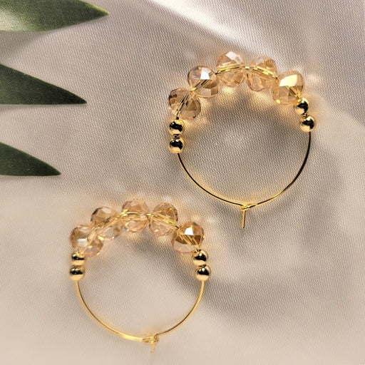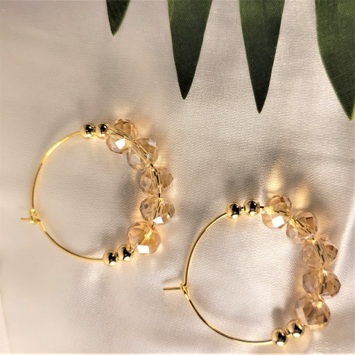 18K Gold plated 25mm hoop earrings with gold shadow Czech crystal beads attached, and round gold accent beads surrounding. This is a shining set of earrings for any and all occasions.