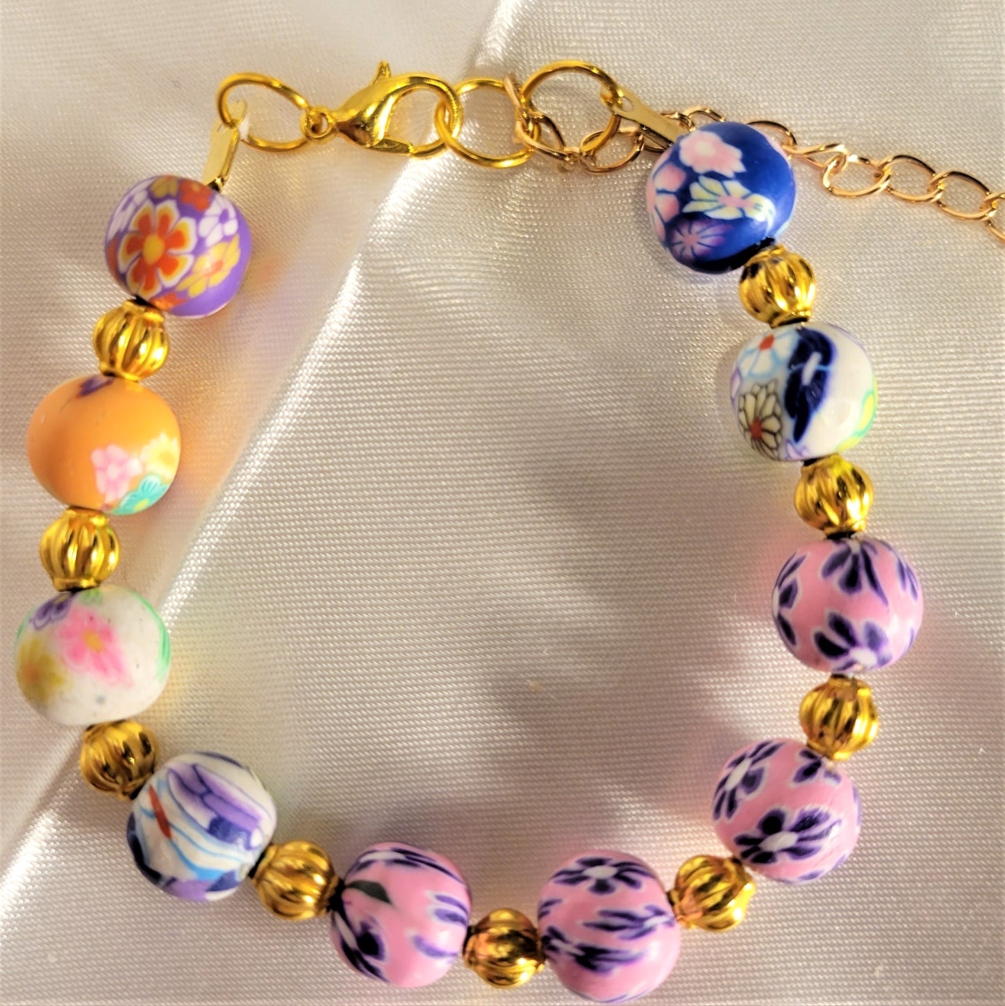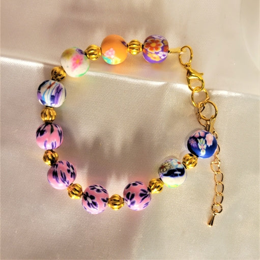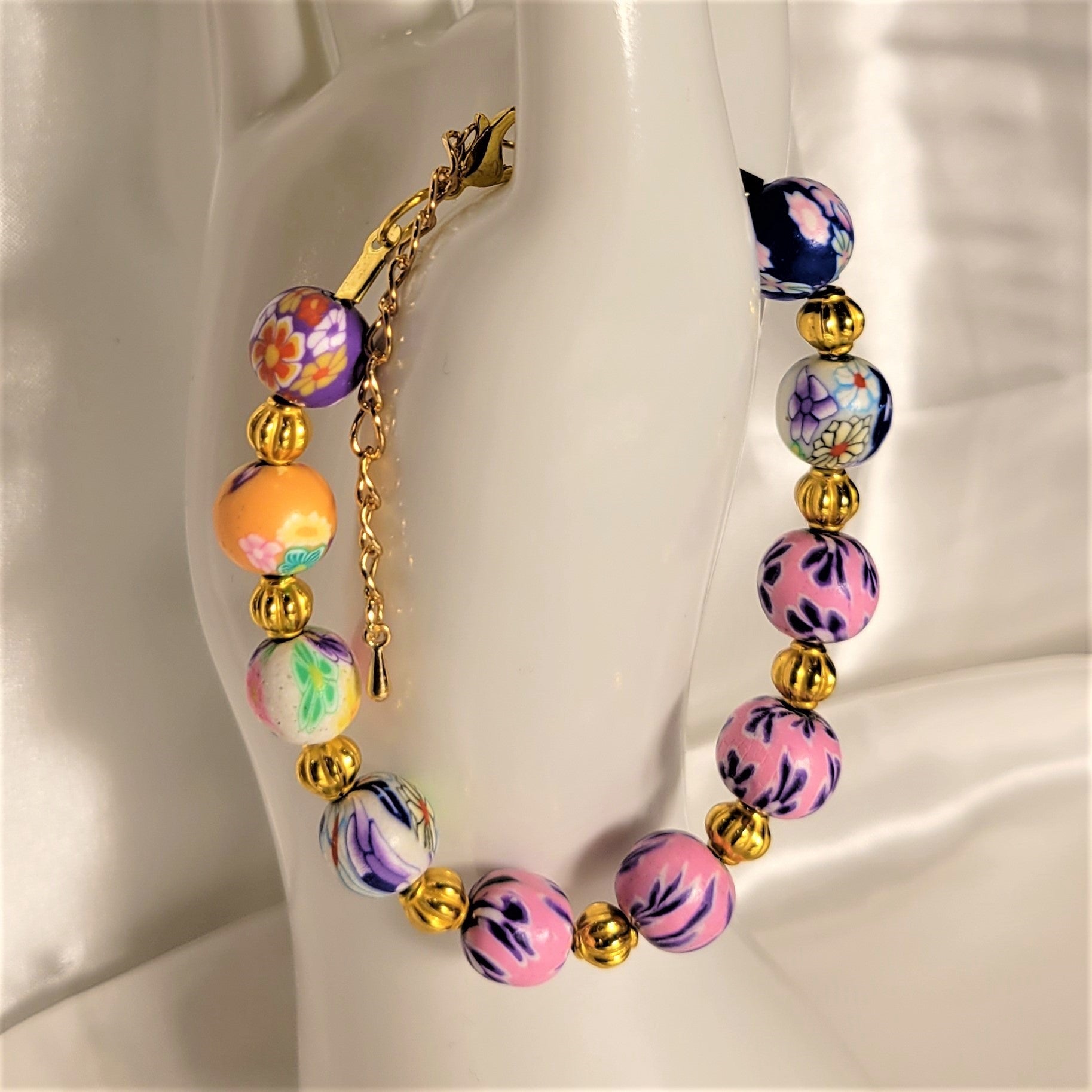 A pretty bracelet made with brightly colored clay beads. The piece is accented with gold beads which enhance the color. This is an elastic beaded bracelet made with strong elastic cord. There is a lobster clasp for security and an extension at one end for a secure fit. The bracelets total length is 7in. and the diameter is approximately 2 to 2.5 inches.