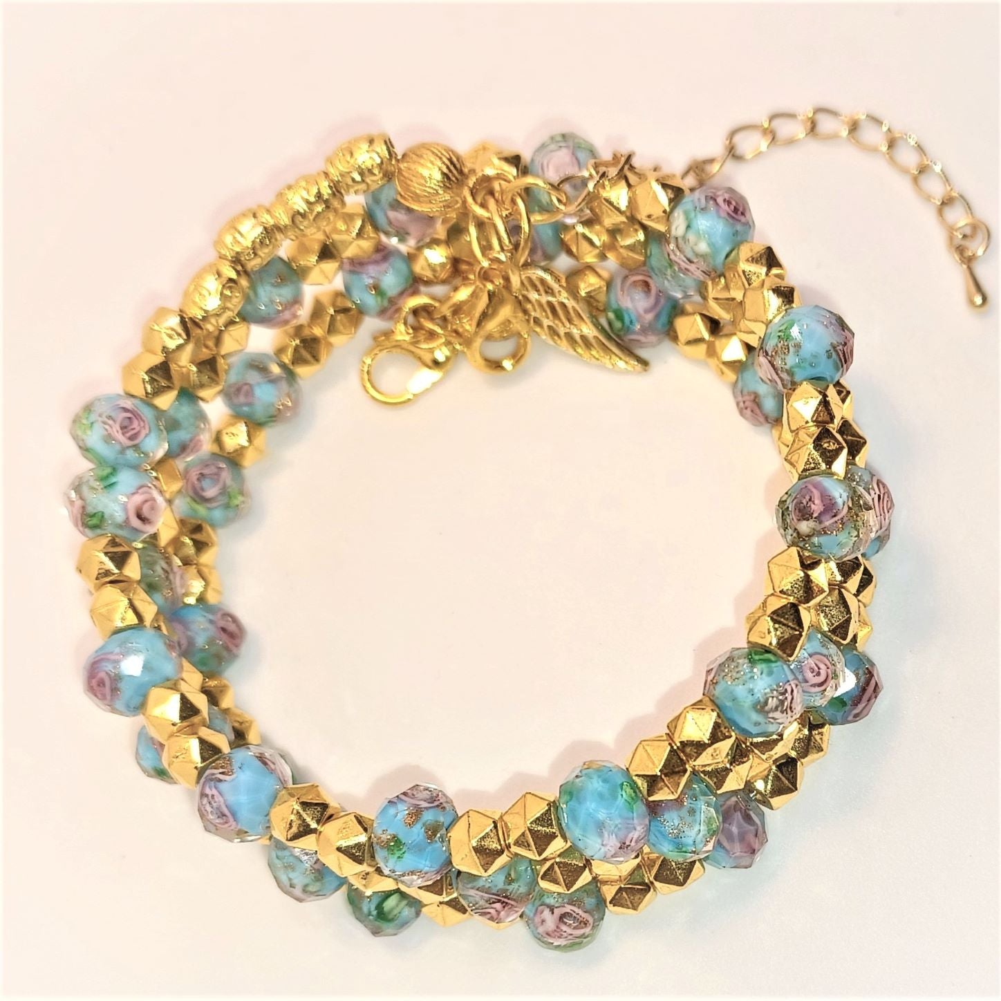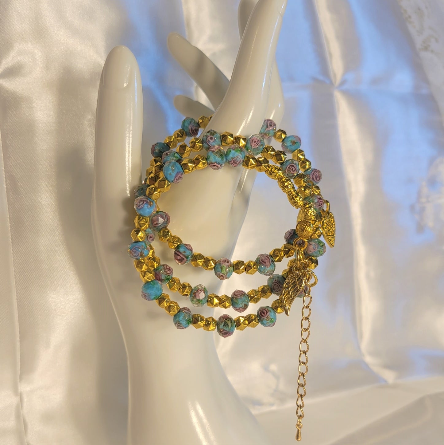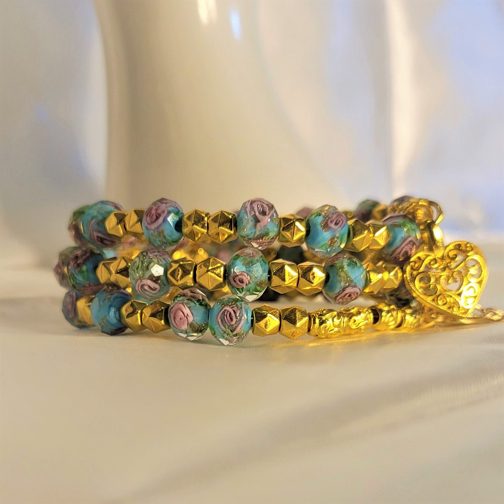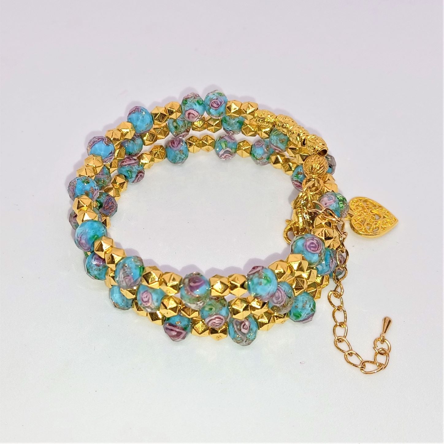 A bracelet with another statement to be made. This is a three layer beauty loaded with sand lampwork beads in a sky blue color. Accented with gold beads that accentuate the lamp work beads this bracelet is lovely. There are two oyster shell terminators that hold the beads in place along with two extensions and lobster clasps. Beading is done with memory wire which conforms to the wrist and maintains the bracelets shape. This piece is perfect for any and all occasions.