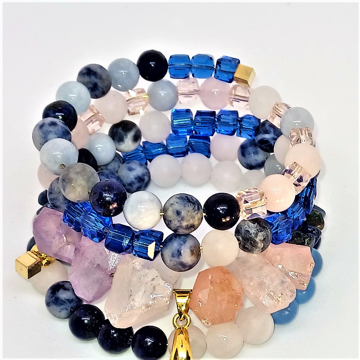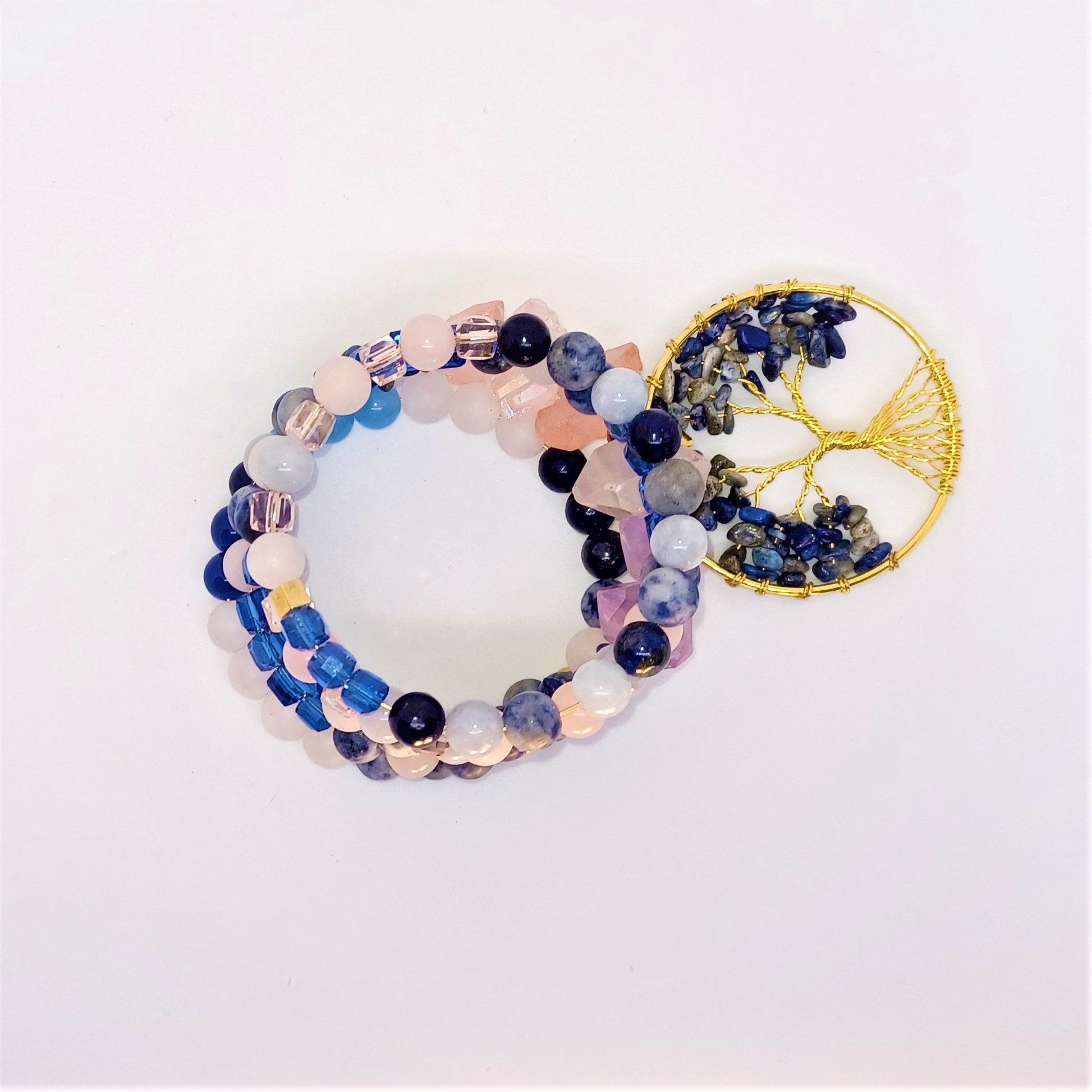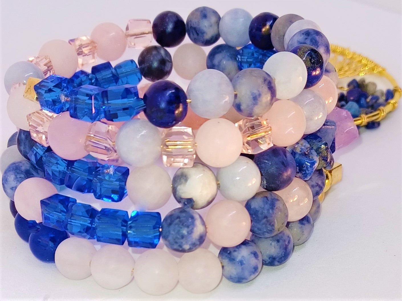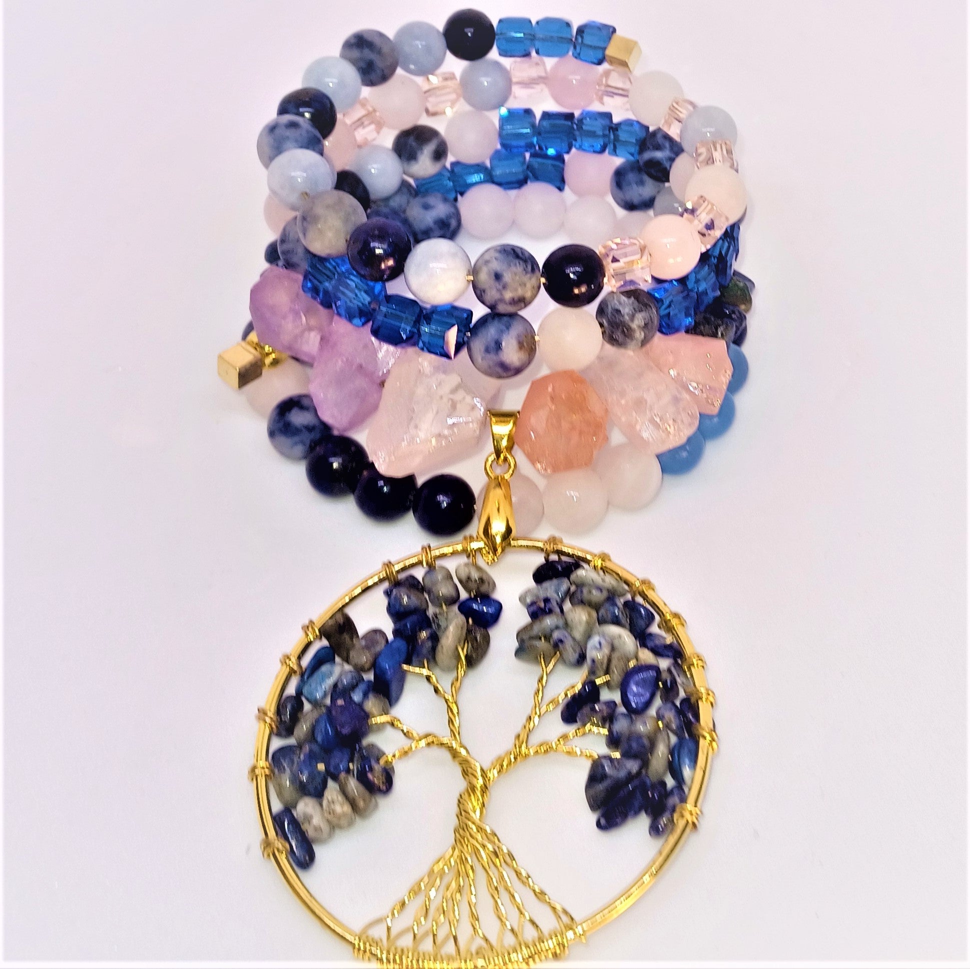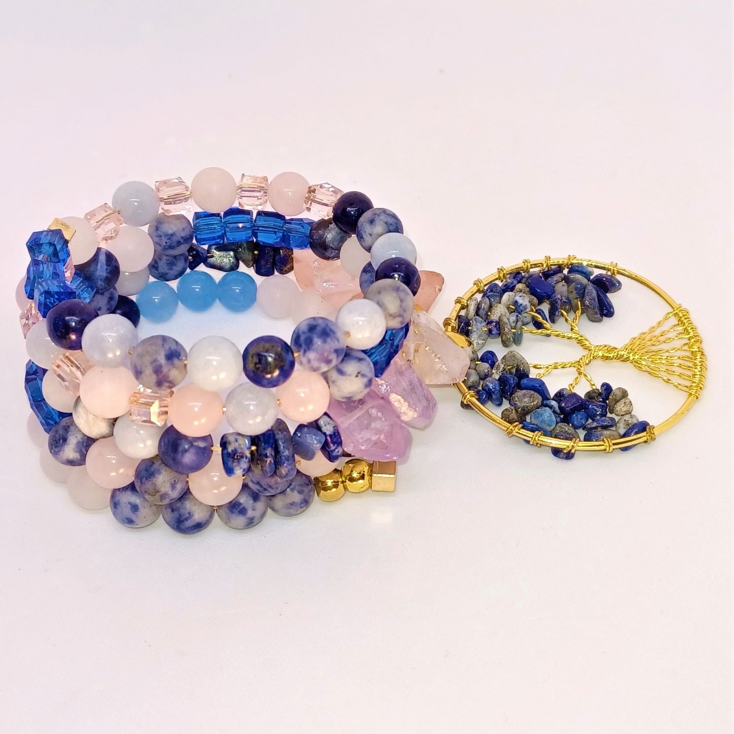 Four plus layers this multilayered bracelet with natural stones of Lapis, Amethyst, Blue Sponge Quartz, Rose Quartz, White Jade and others. These stones have accents of cubed gold, pink and blue crystal beads with Lapis nuggets. Attached to the front of this piece are six pink, white and purple Himalayan Reike crystals along with a gold laced Tree of life Pendant with Lapis nugget stones entwined. A unique piece that we are proud to present.