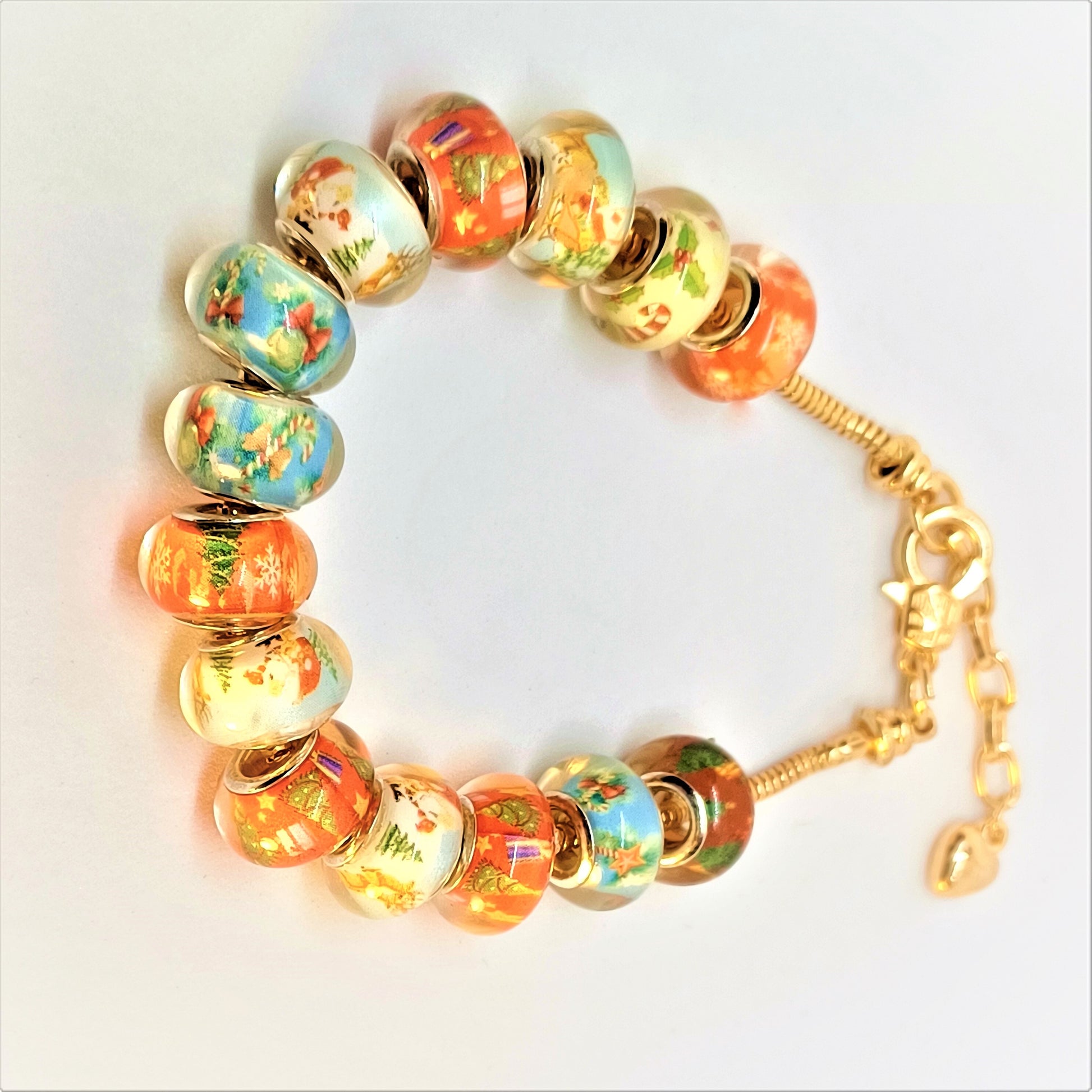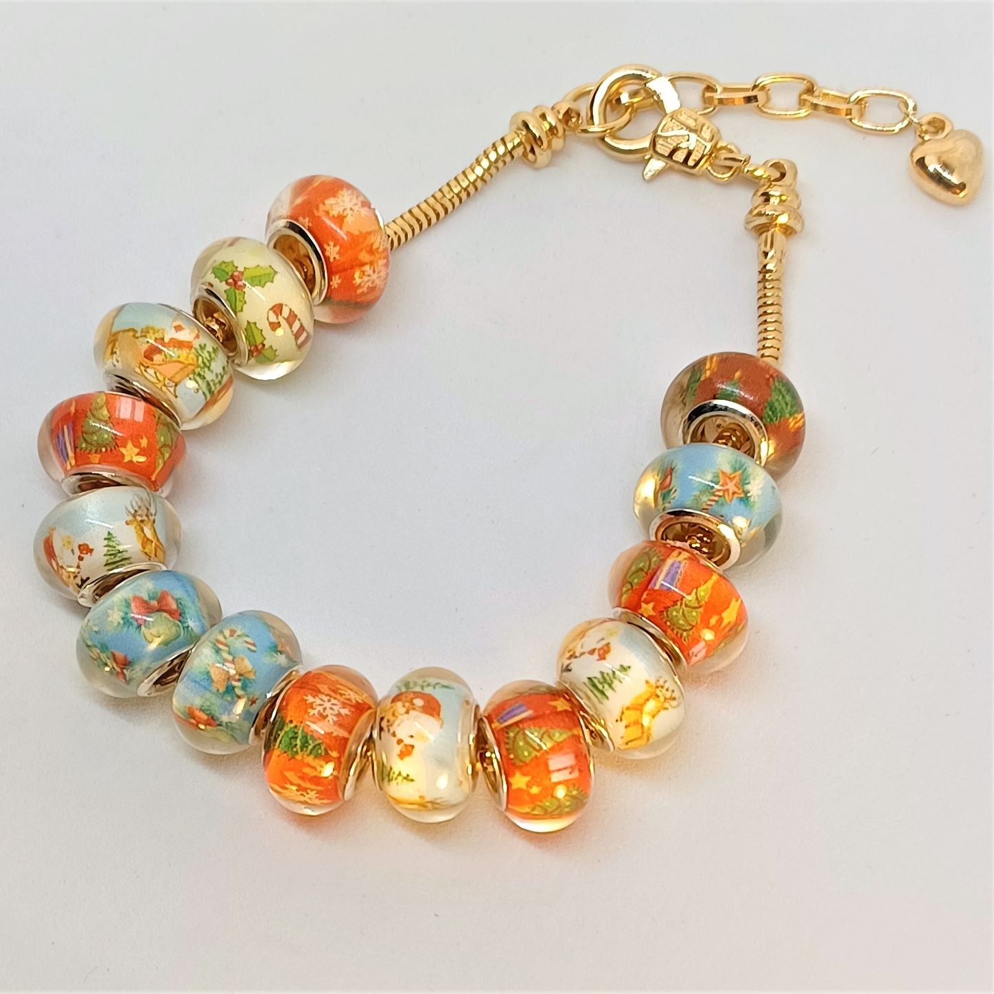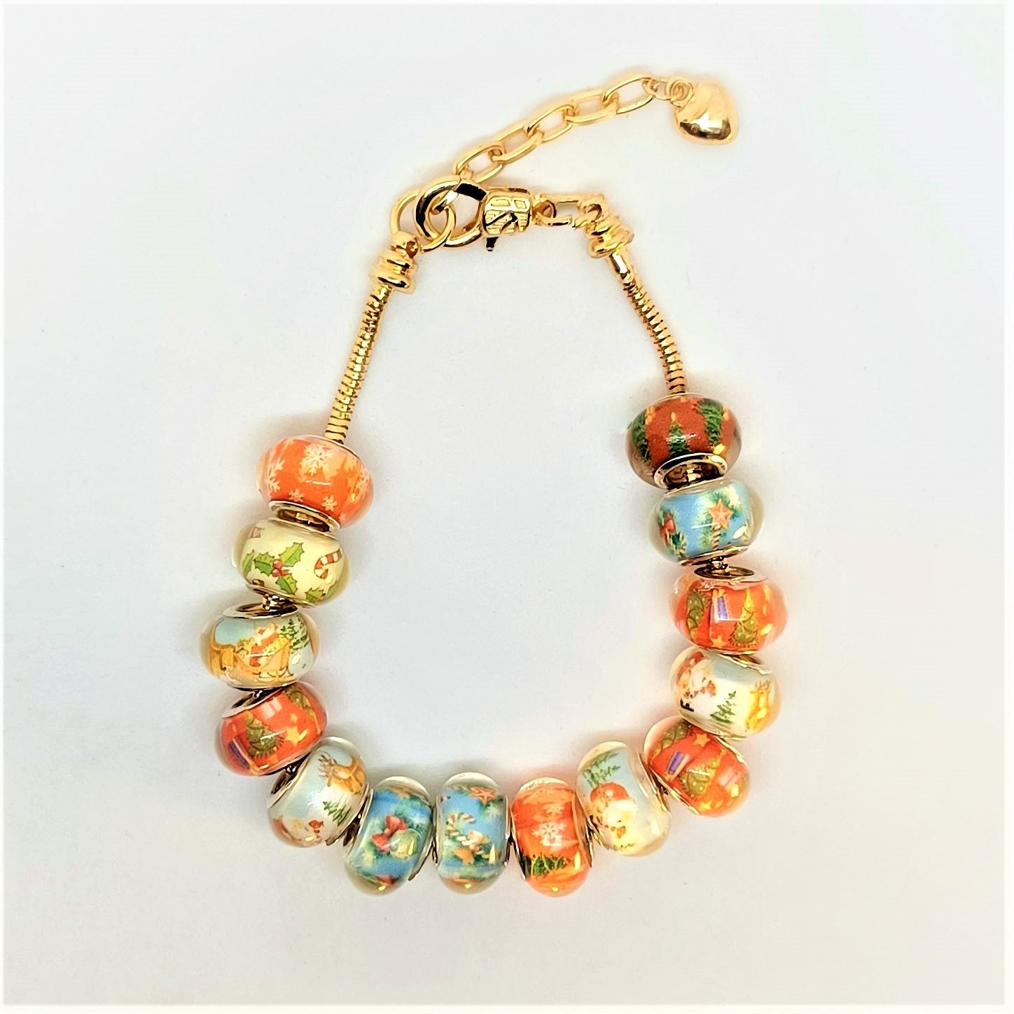 A Lampwork bead bracelet with a winter Christmas theme. Snow and Santa with his gifts, sleds, holly, candy canes and fur trees. Colors of winter with blue, dark blue, green, orange and red on fourteen pretty lampwork beads on a gold snake chain bracelet. In addition, there is a gold lobster clasp and extension for adjustments if needed. The bracelet is 8inches in length.