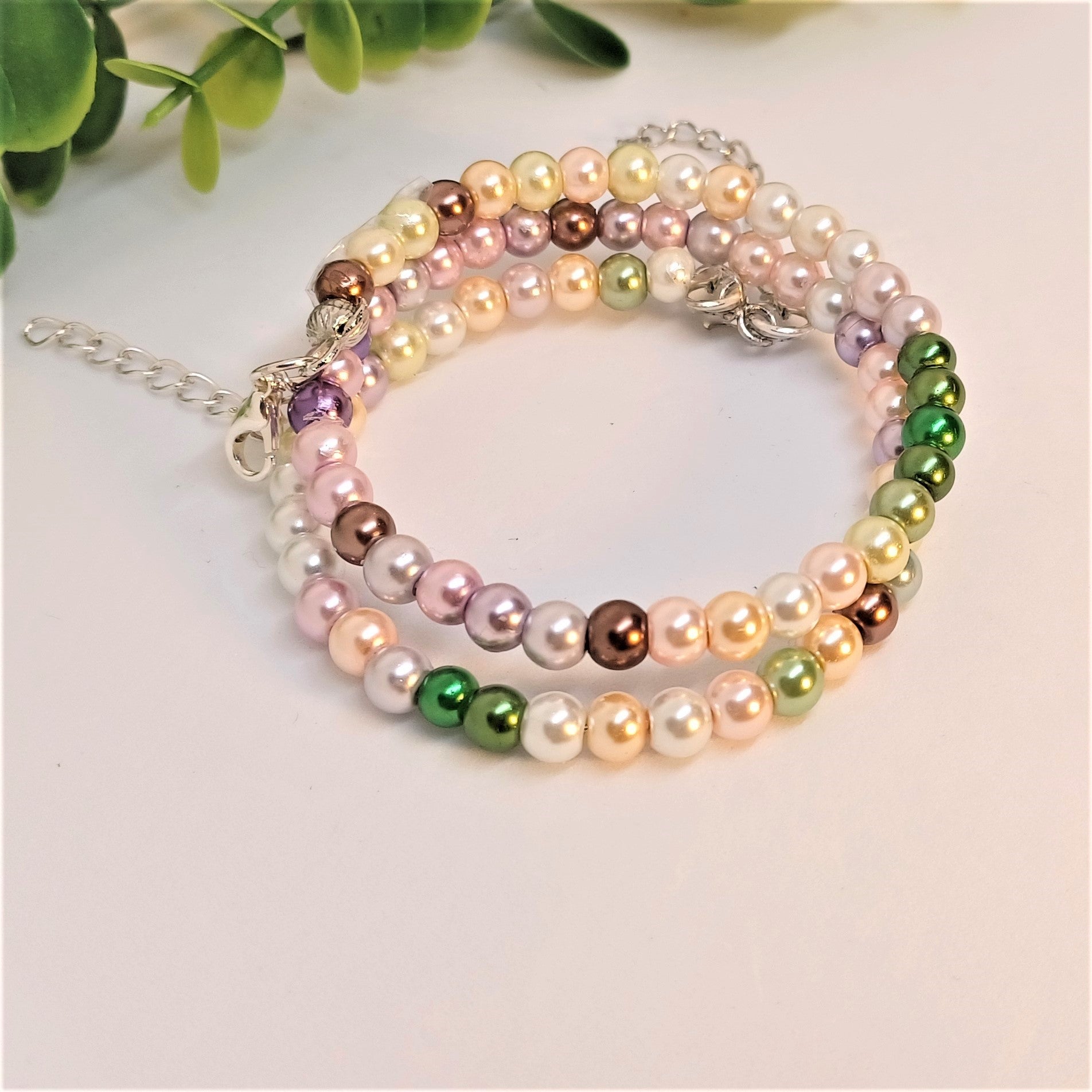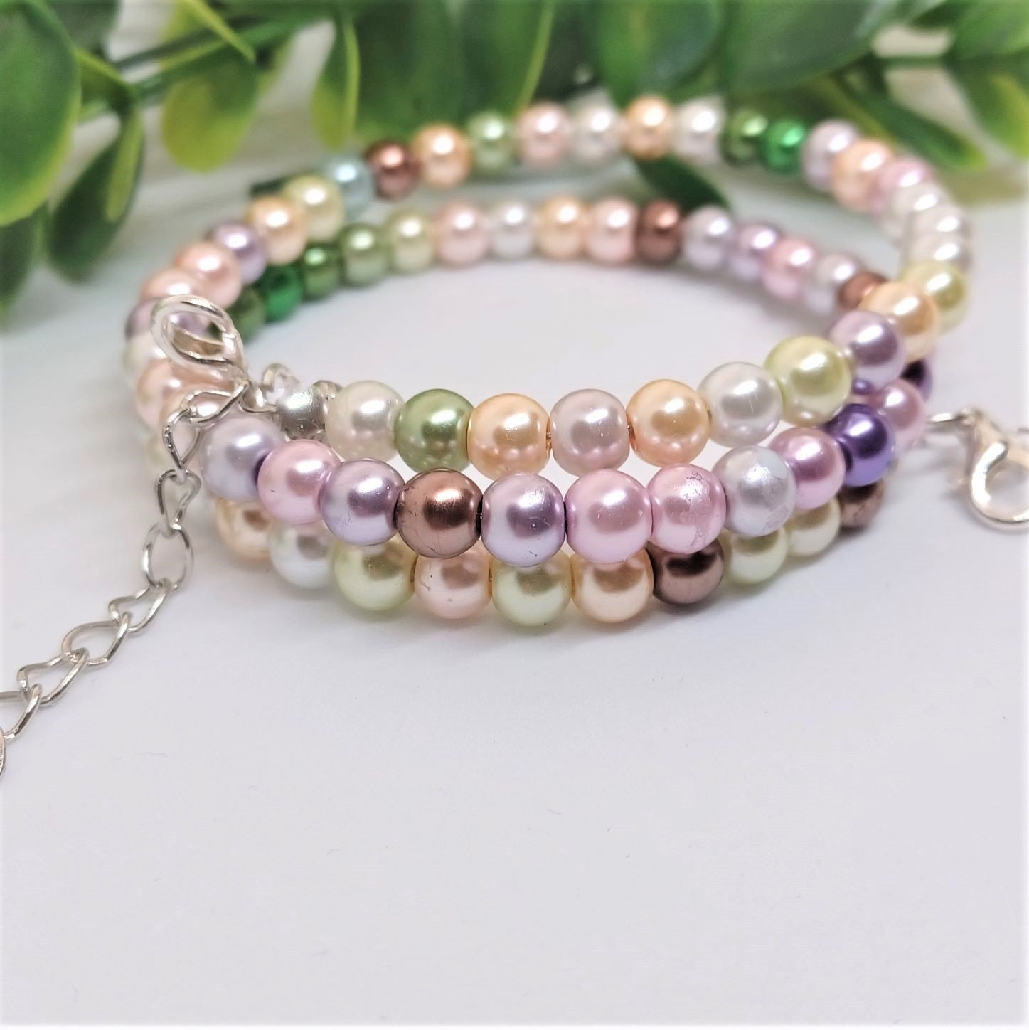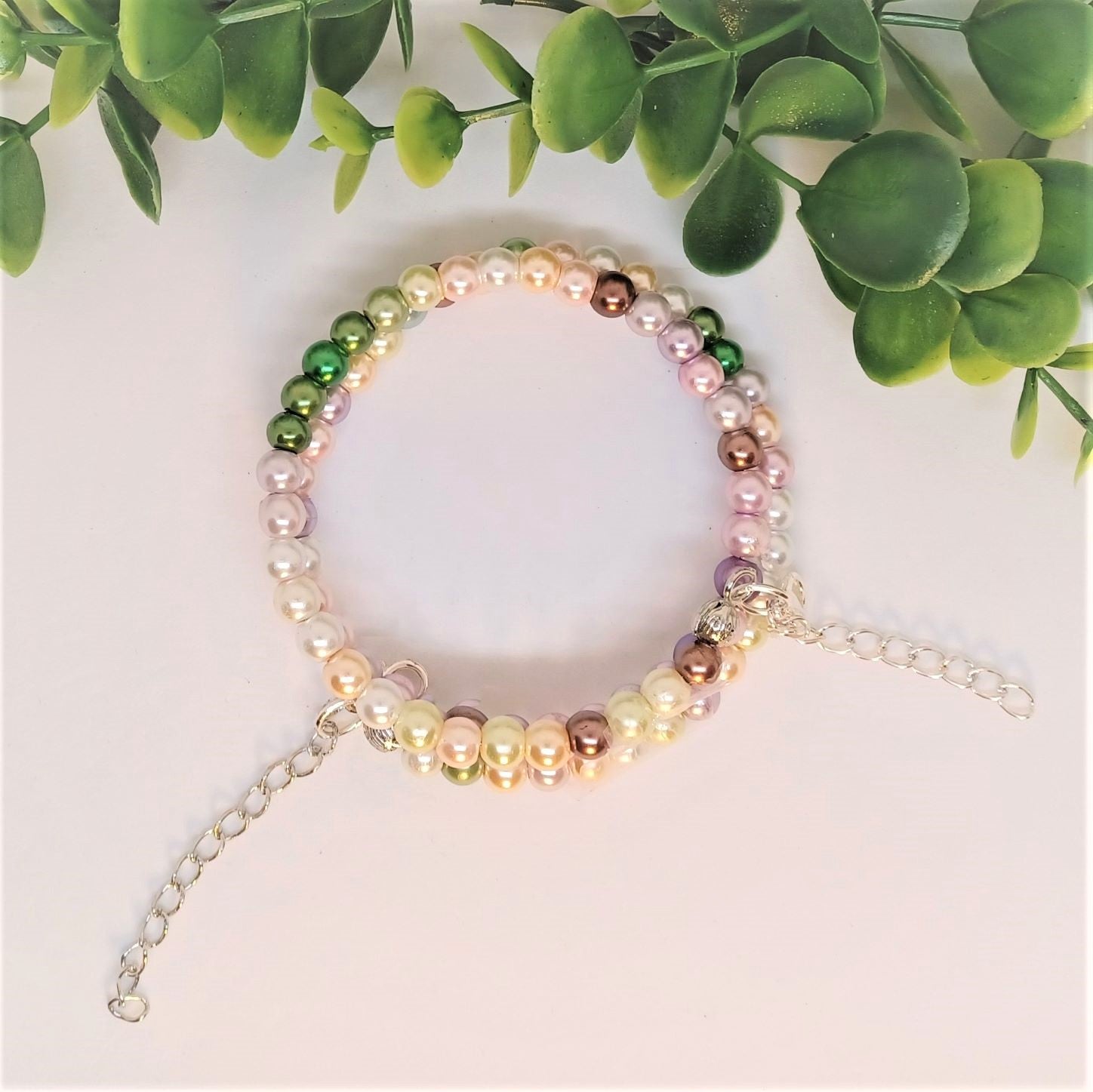 A two strand bracelet comprised of layers of glass pearls in many colors. This soft piece has oyster shell terminators on each end with two extensions and two lobster clasps. There are two oyster shell terminators on each end to secure the bracelet. In addition there are two extensions and two lobster clasps to secure the piece and allow for adjustments if needed. Memory wire is used for beading which allow the bracelet to conform to the wrist and maintain it's shape.