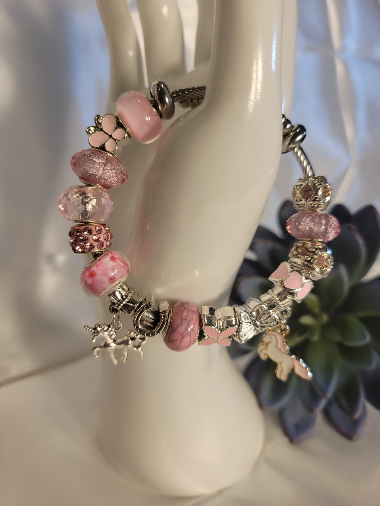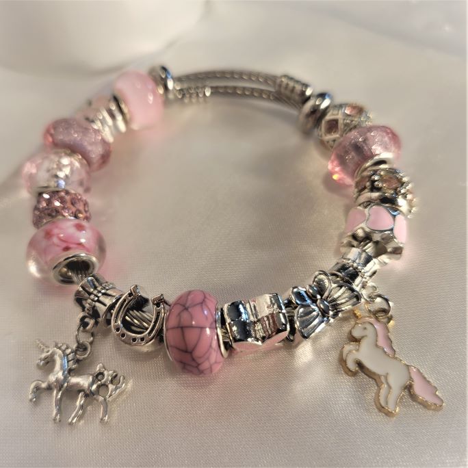 A girls pretty in pink bracelet with pink lampwork beads accented with pink and purple. It is also comprised of silver beads and two unicorns, one silver and one pink and white with gold accents. Beaded on a snake chain bracelet it also includes stopper beads that keep the beads in place and from falling. The bracelet is 2inches in diameter but does stretch approximately 0.5 to 1.0 inch.