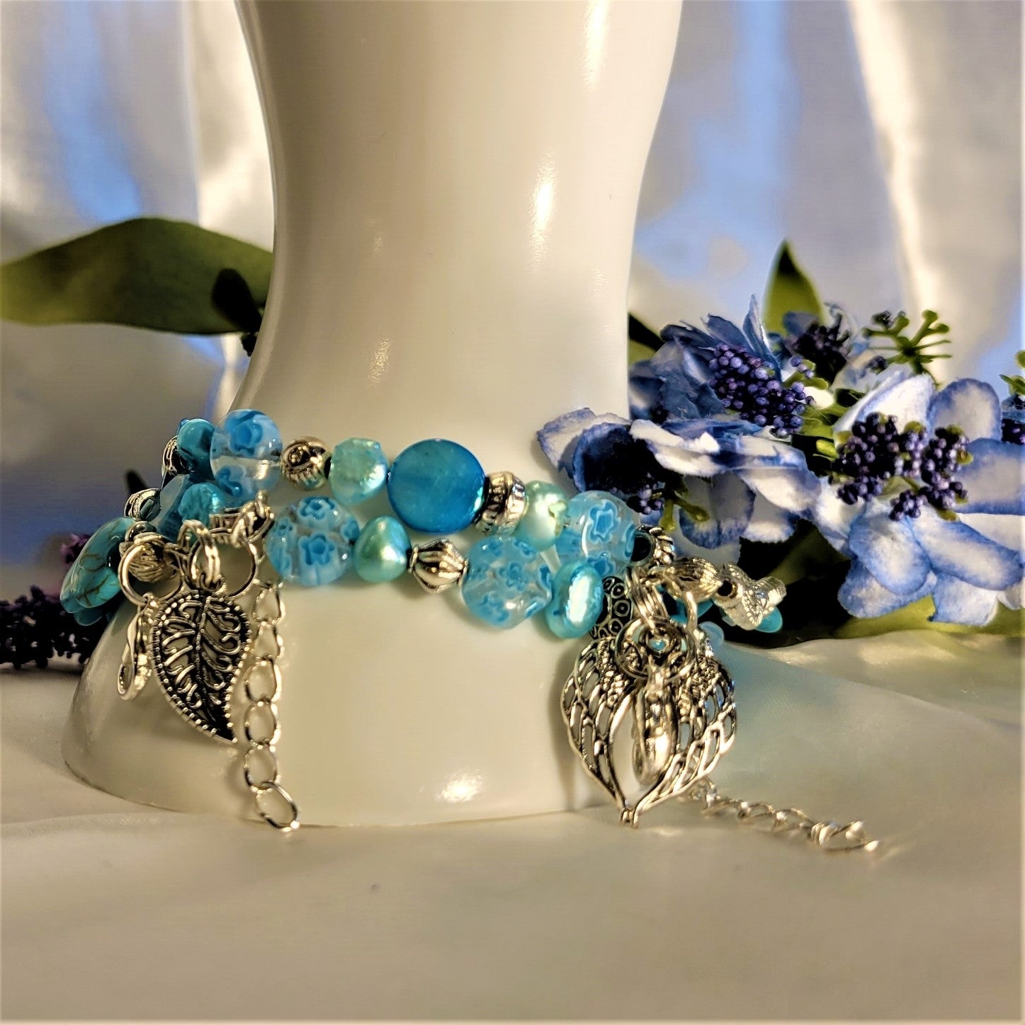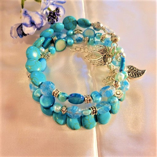 A very trendy bracelet with blue egg shaped freshwater cultured pearls, Millefori translucent blue glass beads and Magnesite blue green stones. Accented with silver beads for an added touch this piece can be worn to any and all occasions. Beading done with memory wire secures the beads. There are two extensions and two lobster clasps for size adjustment and comfort. The blue and silver mixture of beads gives way to a soft look that will be admired.