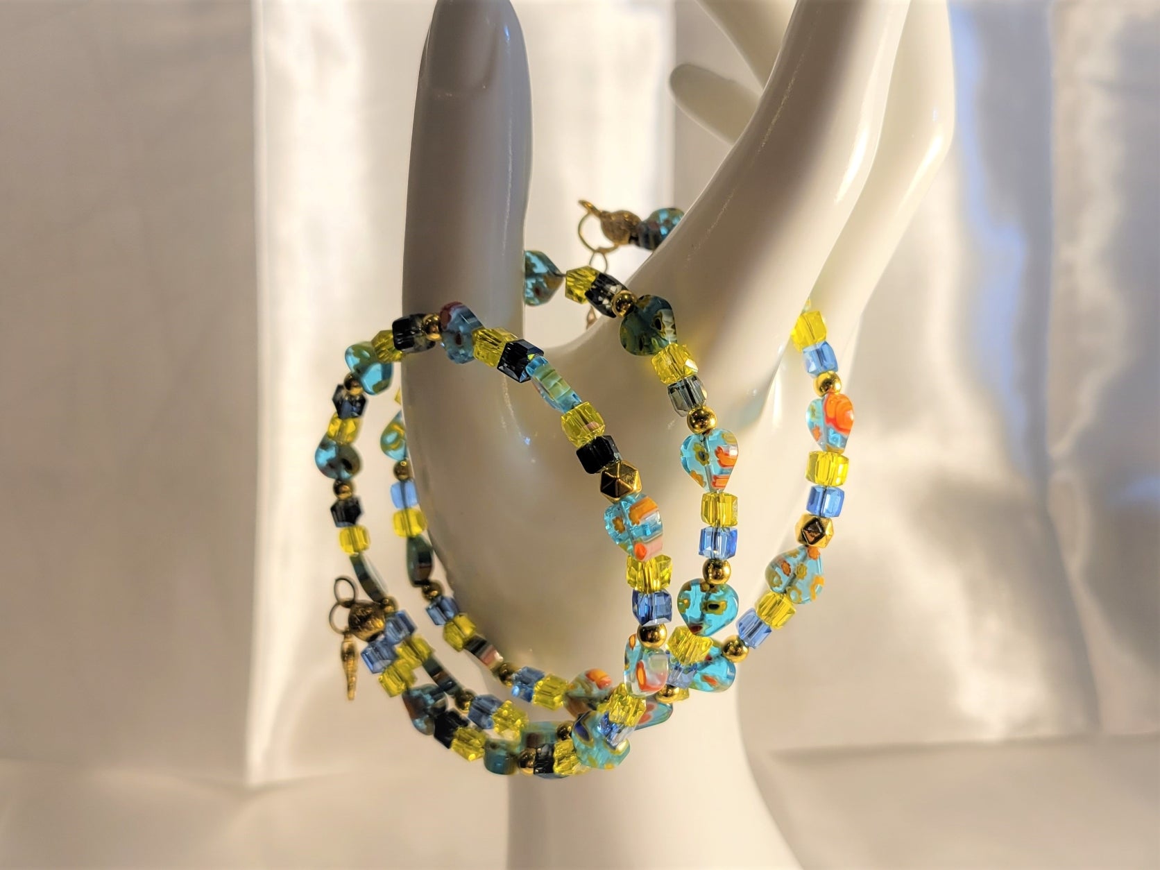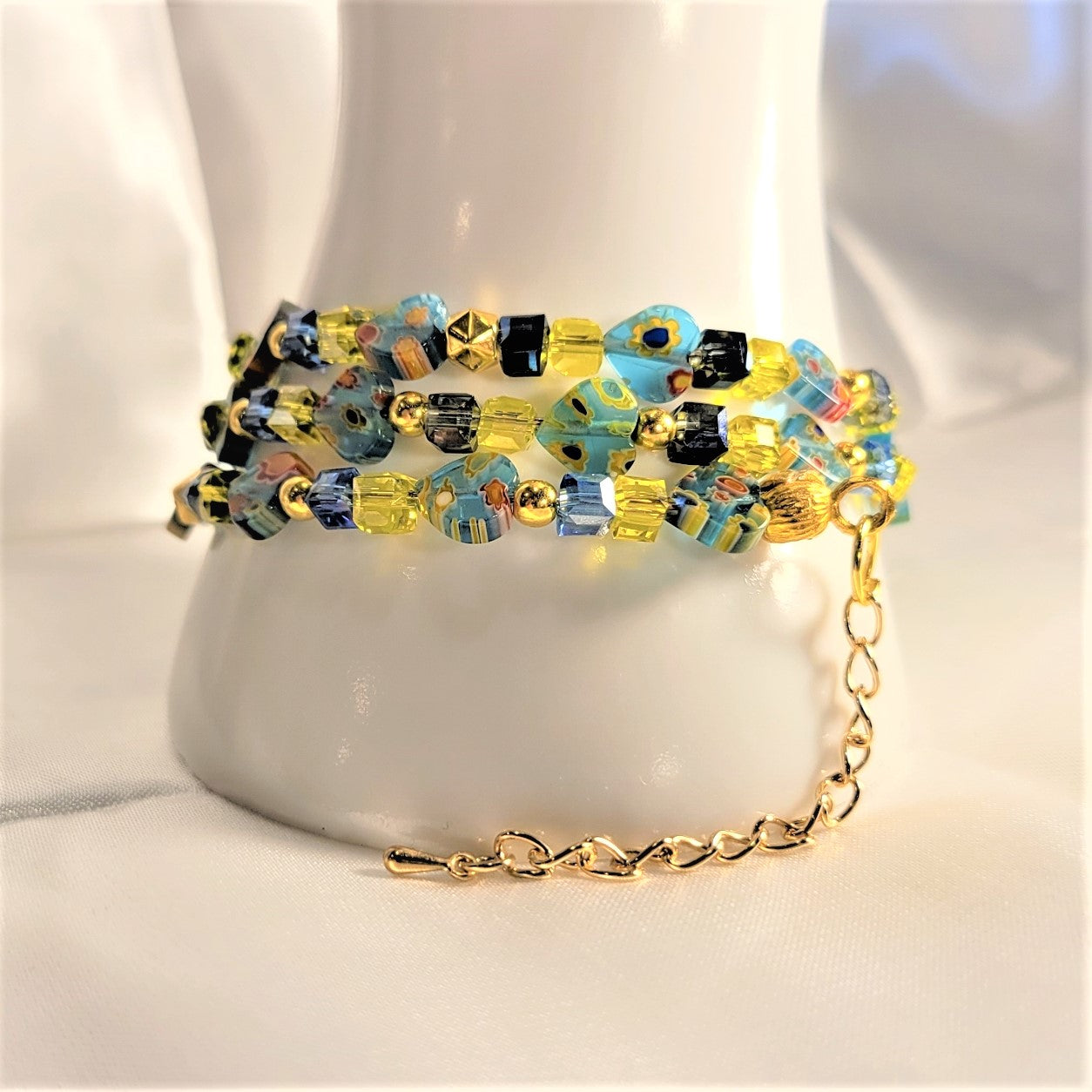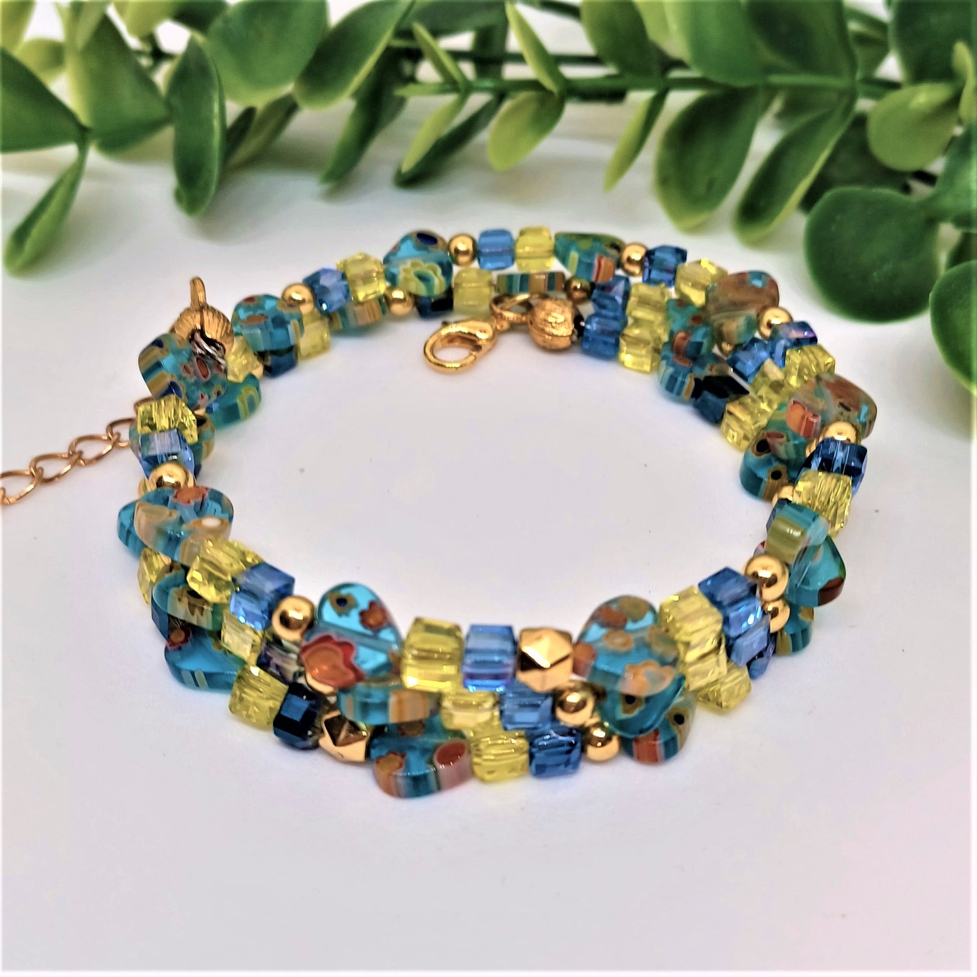 This is a three strand multilayer bracelet with very pretty beads. These Millefori heart shaped glass beads are gorgeous with any mix of beads and their color is stunning. They are mixed here with blue and yellow crystal cube shaped beads that shine. Accented with gold beads this bracelet sparkles. There are two oyster shell terminators that secure the beads, an extension and a lobster clasp for adjustment if needed. Beaded with memory wire this piece conforms to the wrist and holds it's shape.