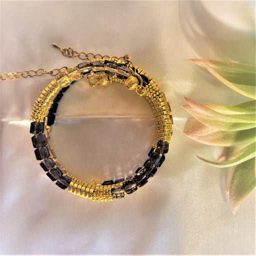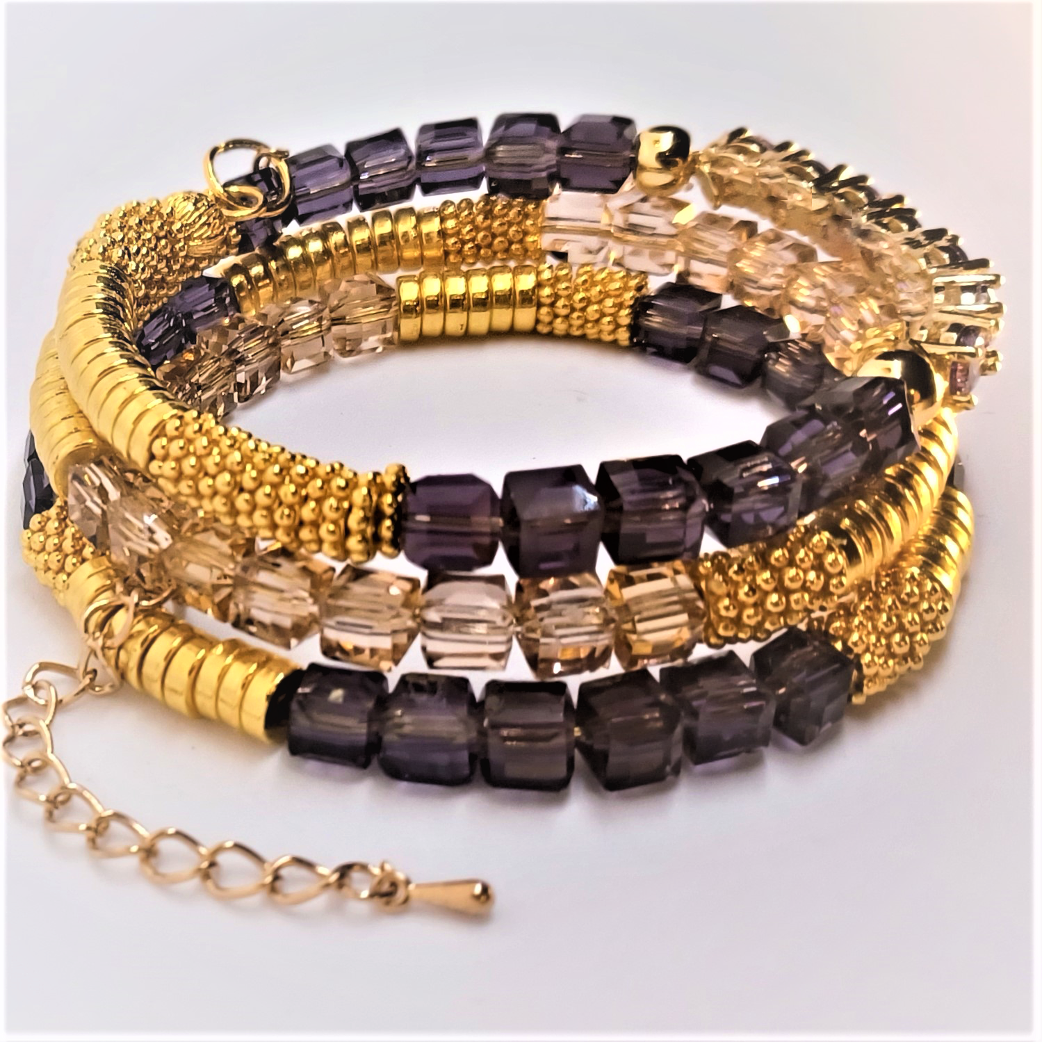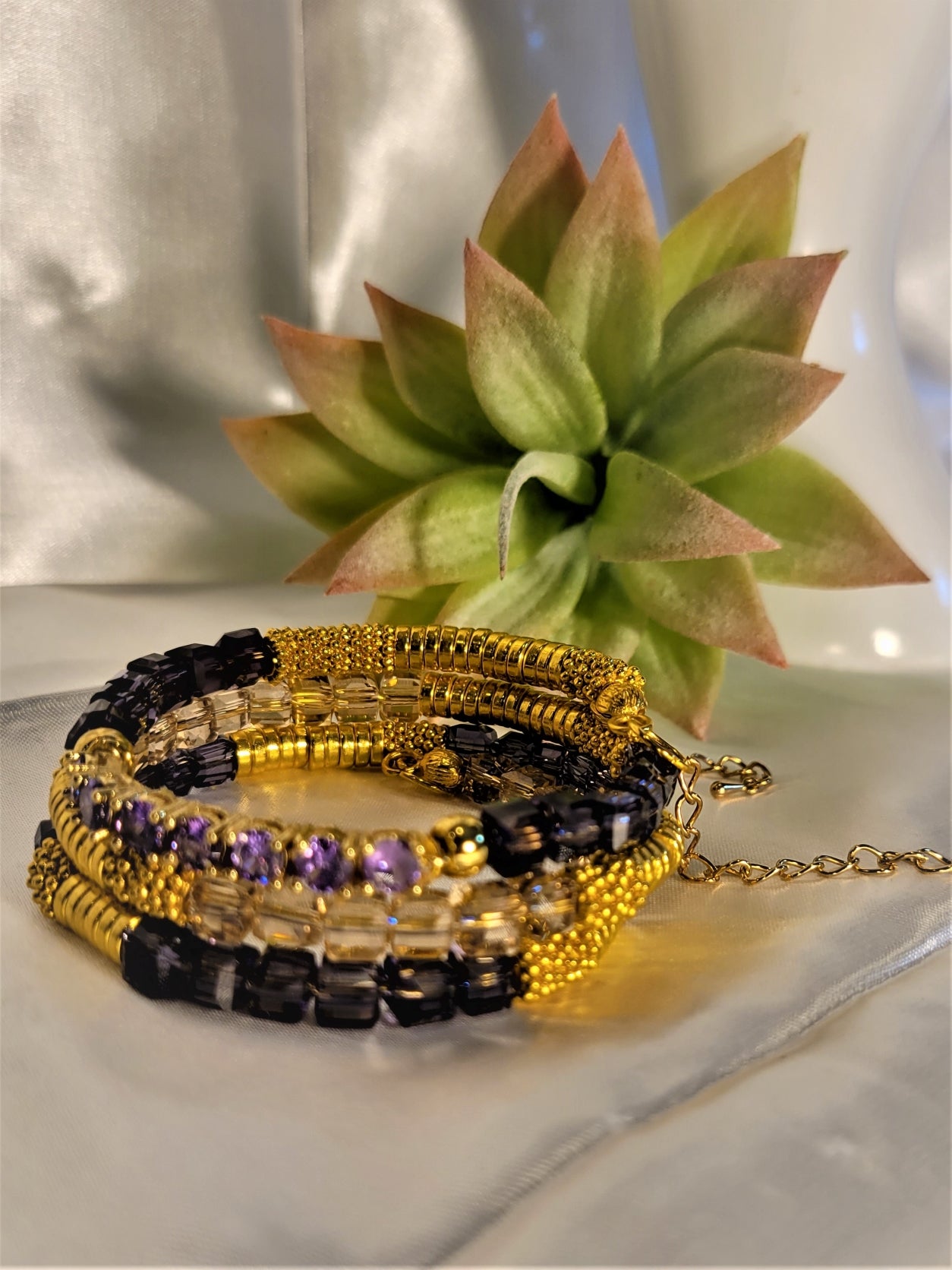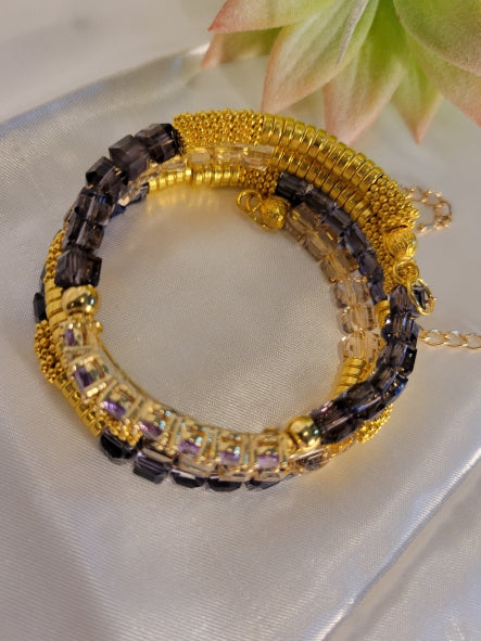 A classy multilayer bracelet with Amethyst Cubed crystal, Amethyst crystal embedded in gold, and filled with pretty gold accent beads. It is secured with two gold oyster shell terminators, two gold extensions and lobster clasps. This is a stunning piece and can be worn on any and all occasions. Beaded with memory wire it will conform to the wrist and maintain it's shape. We are happy to bring this bracelet to the community.