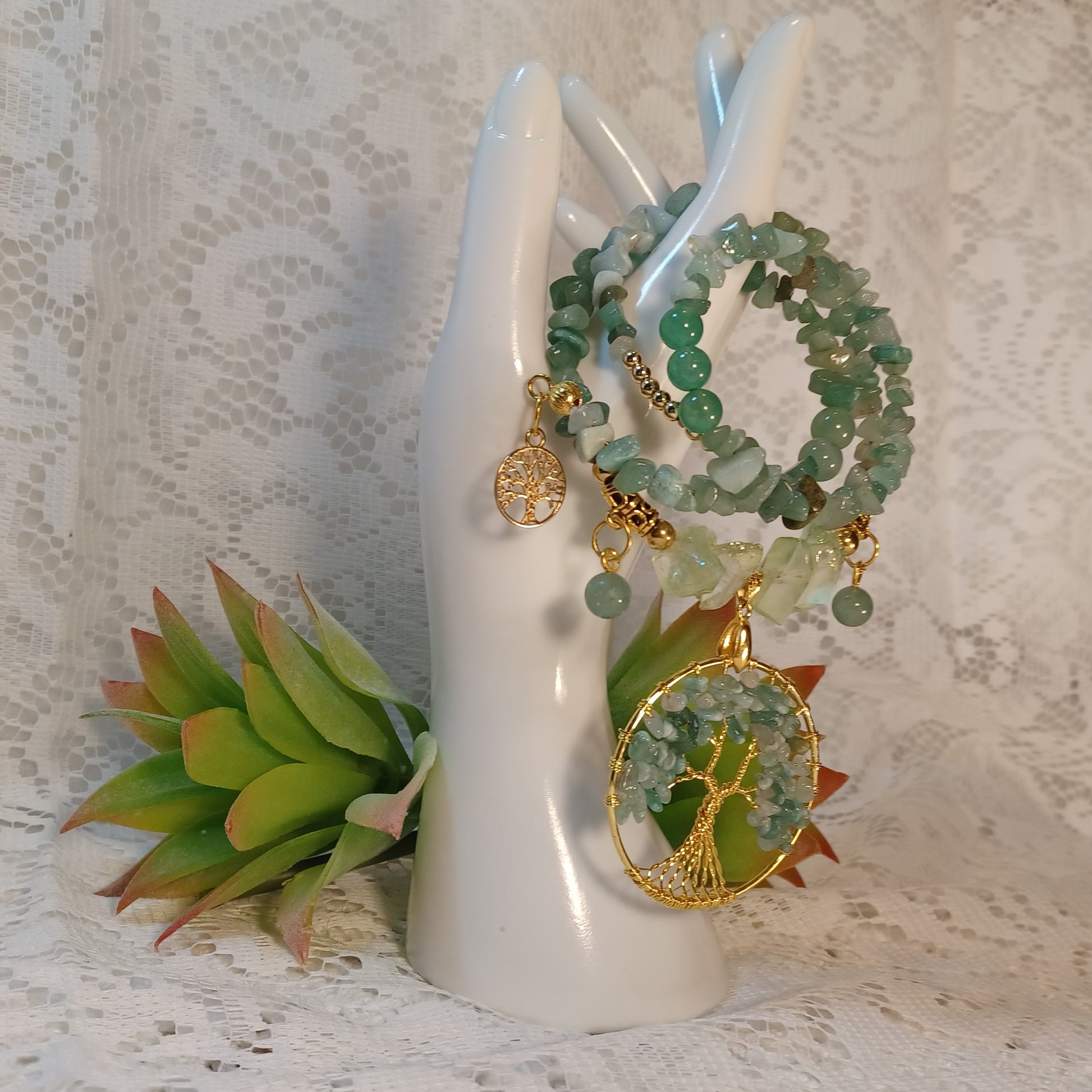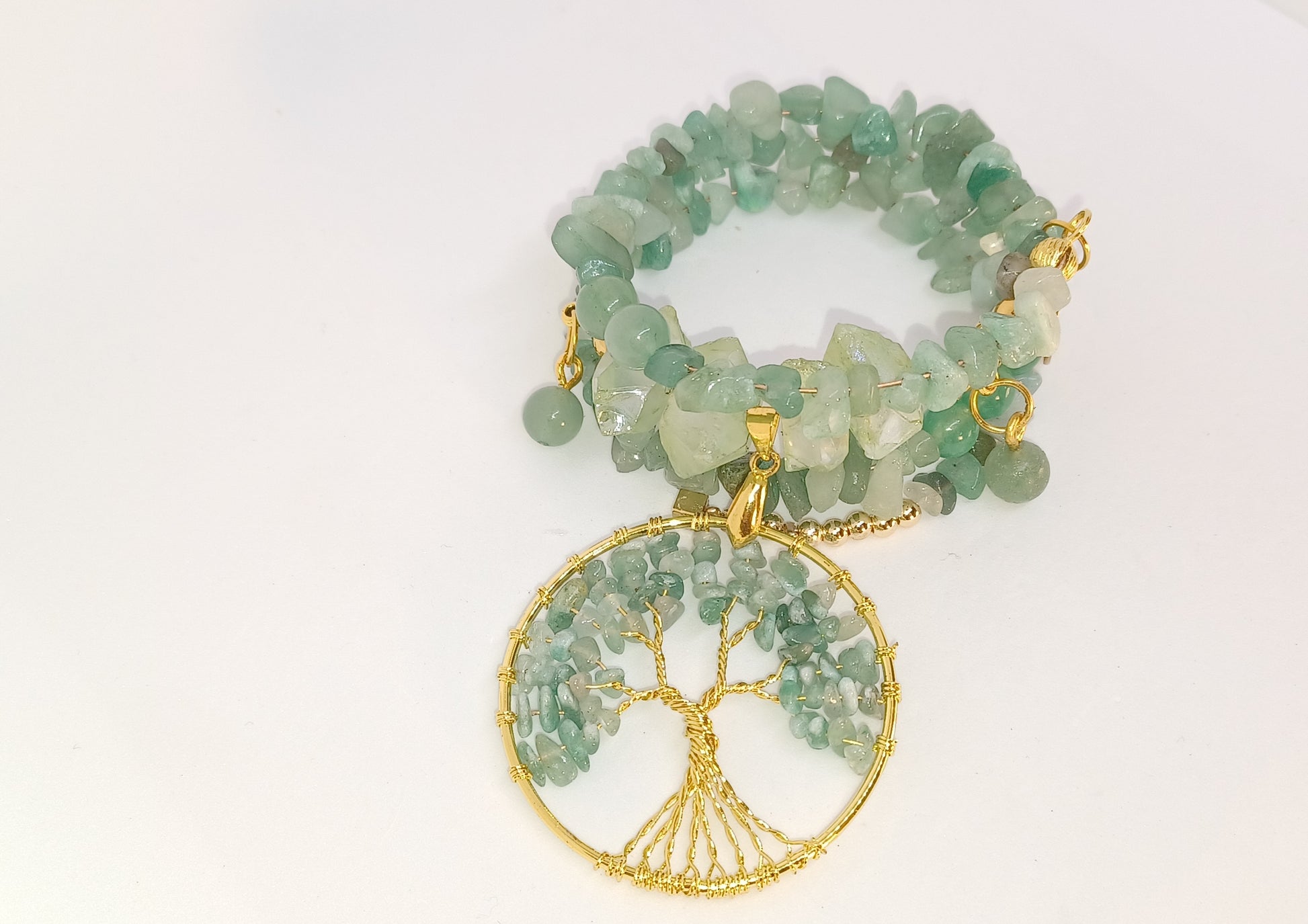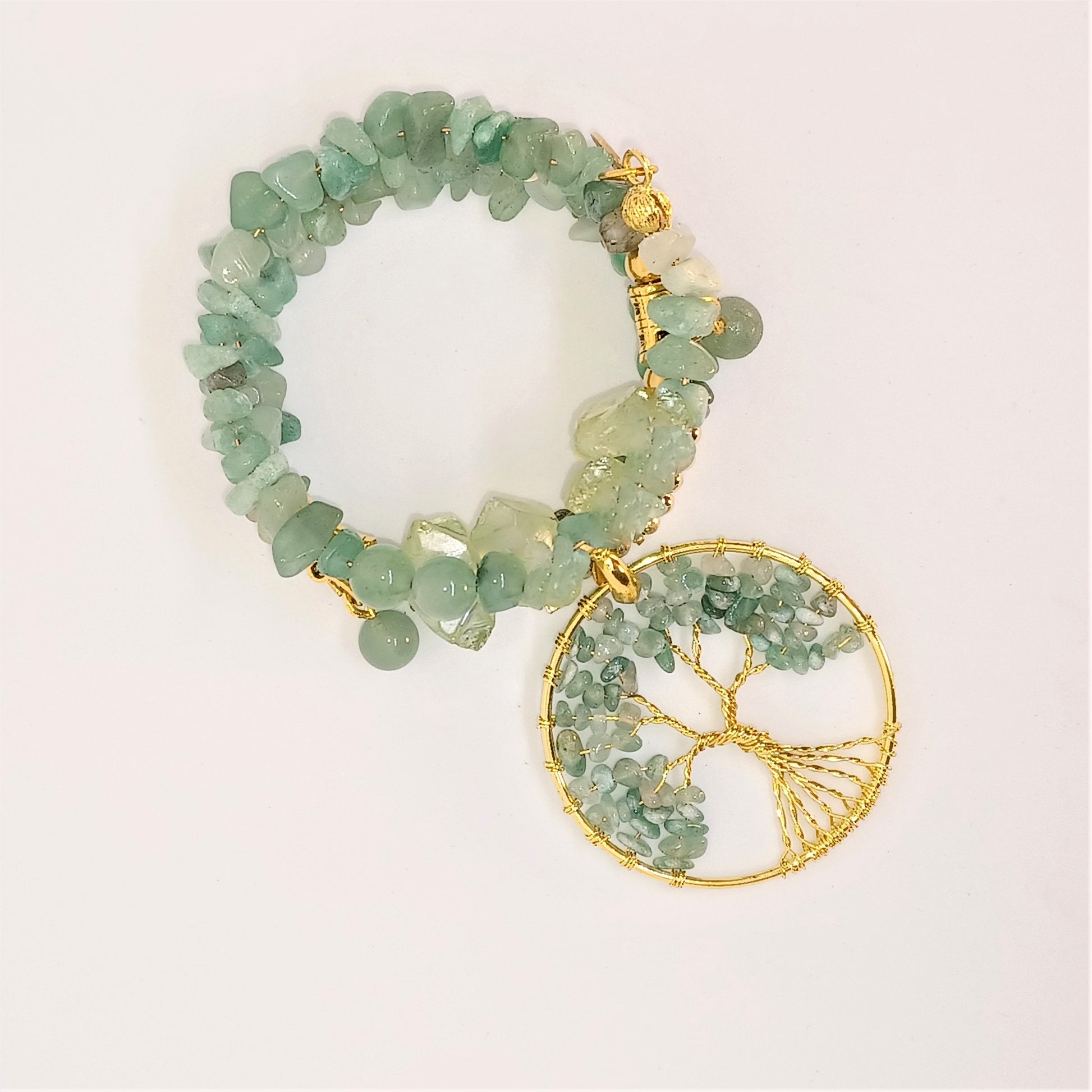 A multilayer wrap bracelet with Adventurine stone nuggets, and Natural stone beads including faceted fire Agate beads. Natural stones are attached to the sides of the piece with gold bails. There is a Tree of Life Pendant attached to the front with green Adventurine beads entwined in the gold branches. Pulling it all together are four Himalayan Reiki stones in a soft green, gold beads, and a Tree of Life gold charm. This piece is soft and gentle in color and can be worn on any and all occasions.
