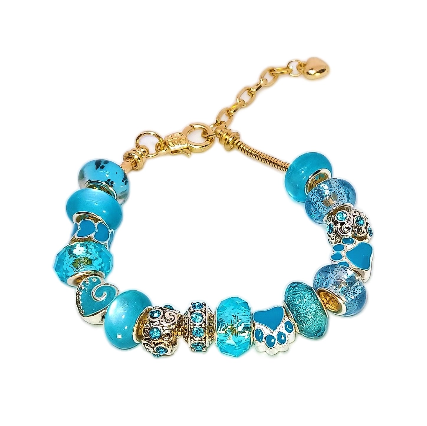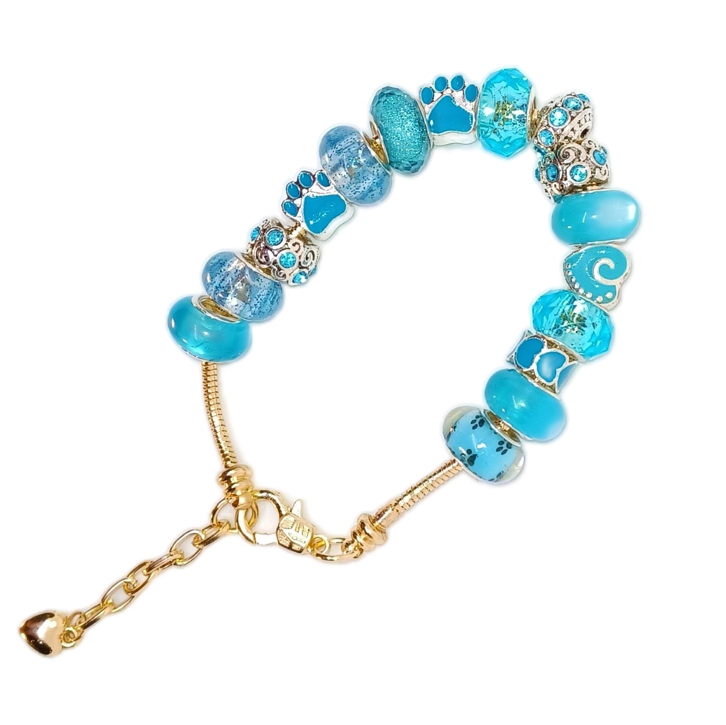 A lampwork beaded bracelet comprised of colorful blue beads. In addition, this piece has silver beads with blue rhinestones, paw prints and hearts. Beaded onto a sturdy gold snake chain with an extension and a gold heart charm keeps the beads secure. It is approximately 6.75 to 7.25inches in length. When measuring the wrist add approximately .5inches to the length due to the larger beads.