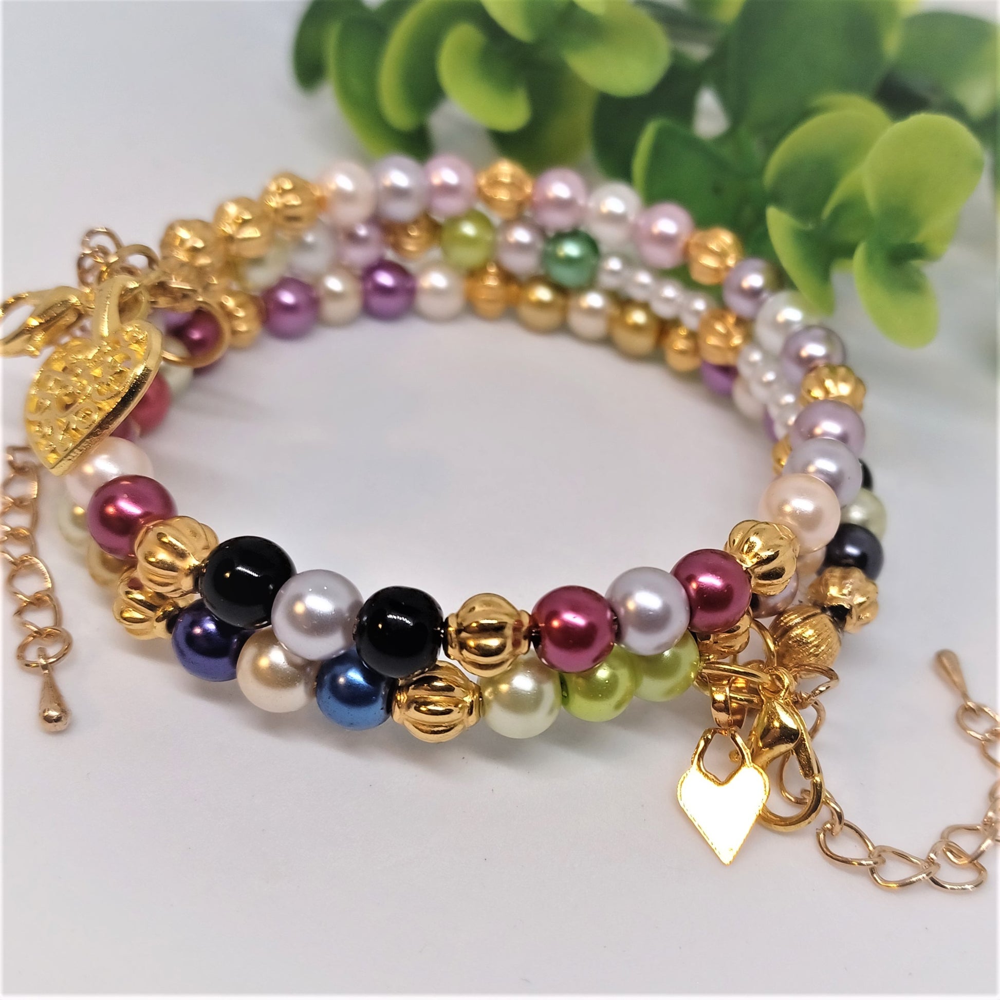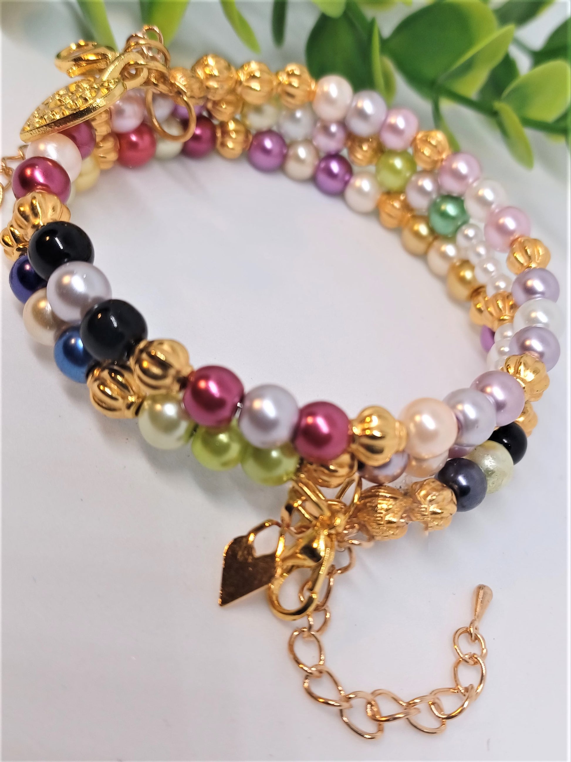 A multicolor glass pearl bracelet with three strands of colorful beads. Numerous pearls, with gold beads mixed in, makes this bracelet shine as a beautiful piece of jewelry. Oyster shells secure the bracelet at both ends along with two extensions. In addition, there are two lobster clasps that can be used for bracelet size adjustment and security. Memory wire is used to conform the bracelet to the wrist and maintains the bracelets shape. This piece can be worn on any and all occasions.