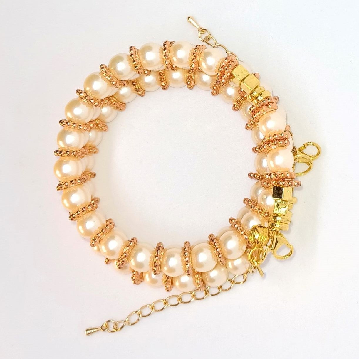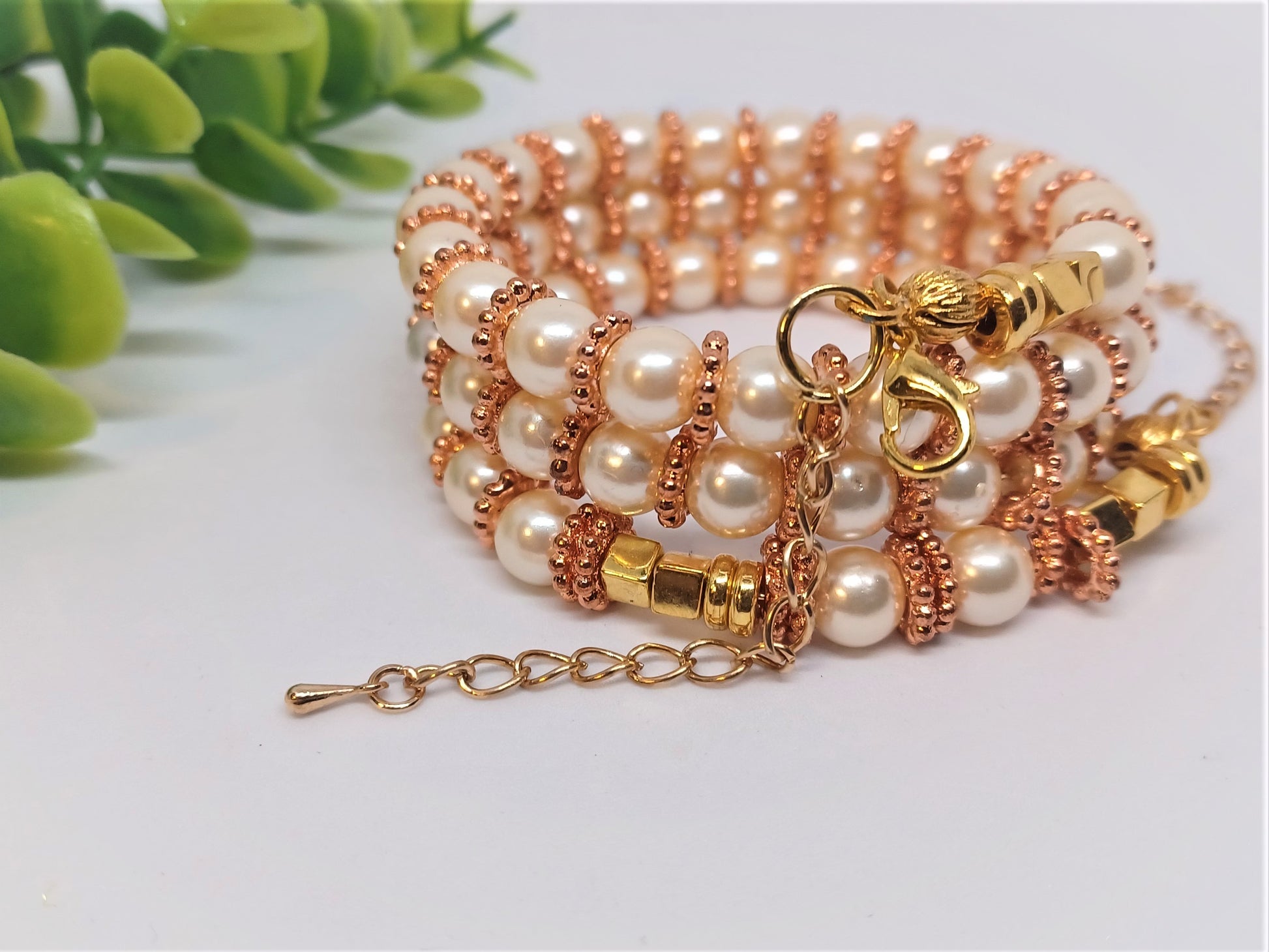 A multilayer bracelet with three layers of pearls and copper beads. The piece is secured with oyster shell terminators at each end with an addition of two gold extensions. Copper and white pearls combined make a beautiful piece of jewelry. This bracelet will go well with any accessories and can be worn for any and all occasions.