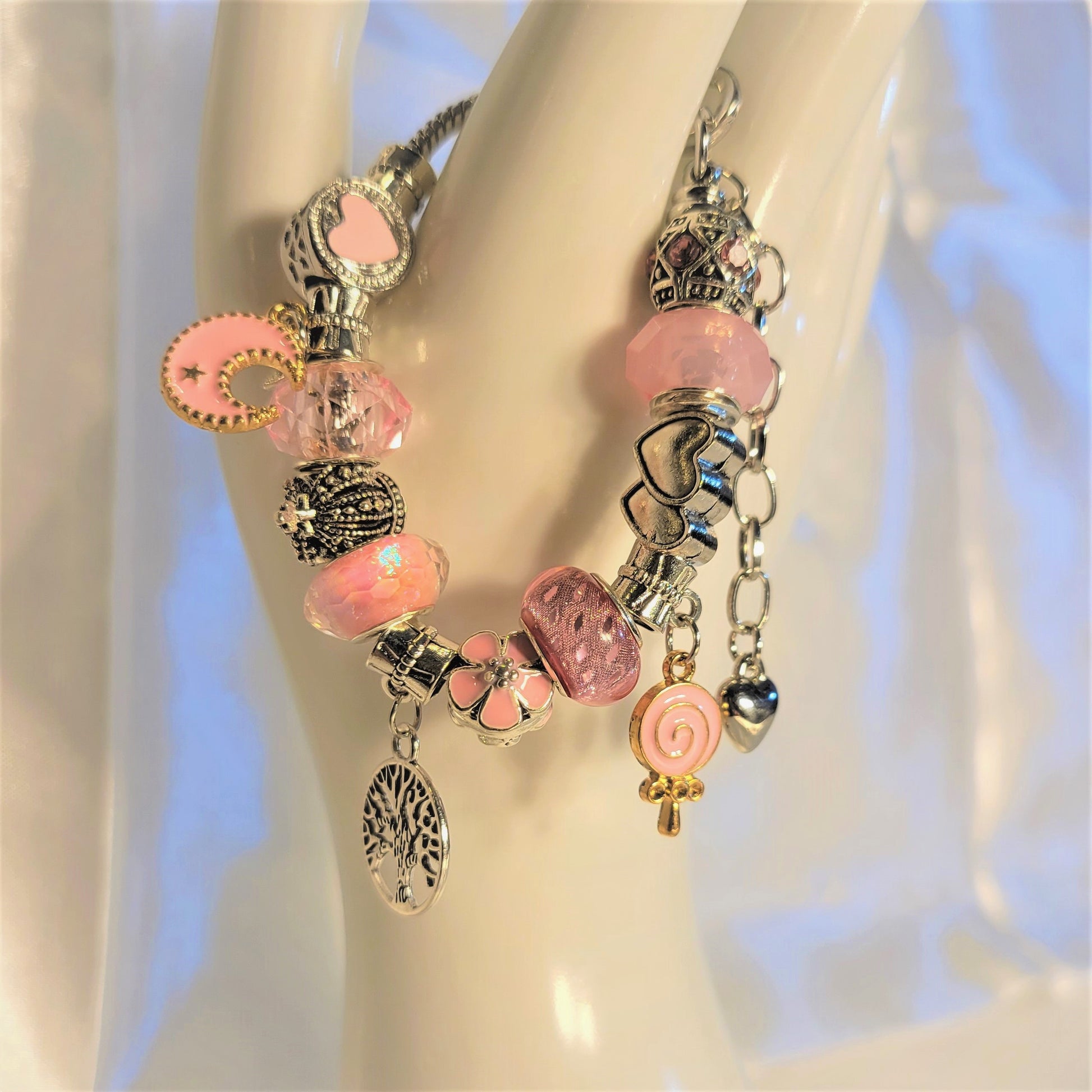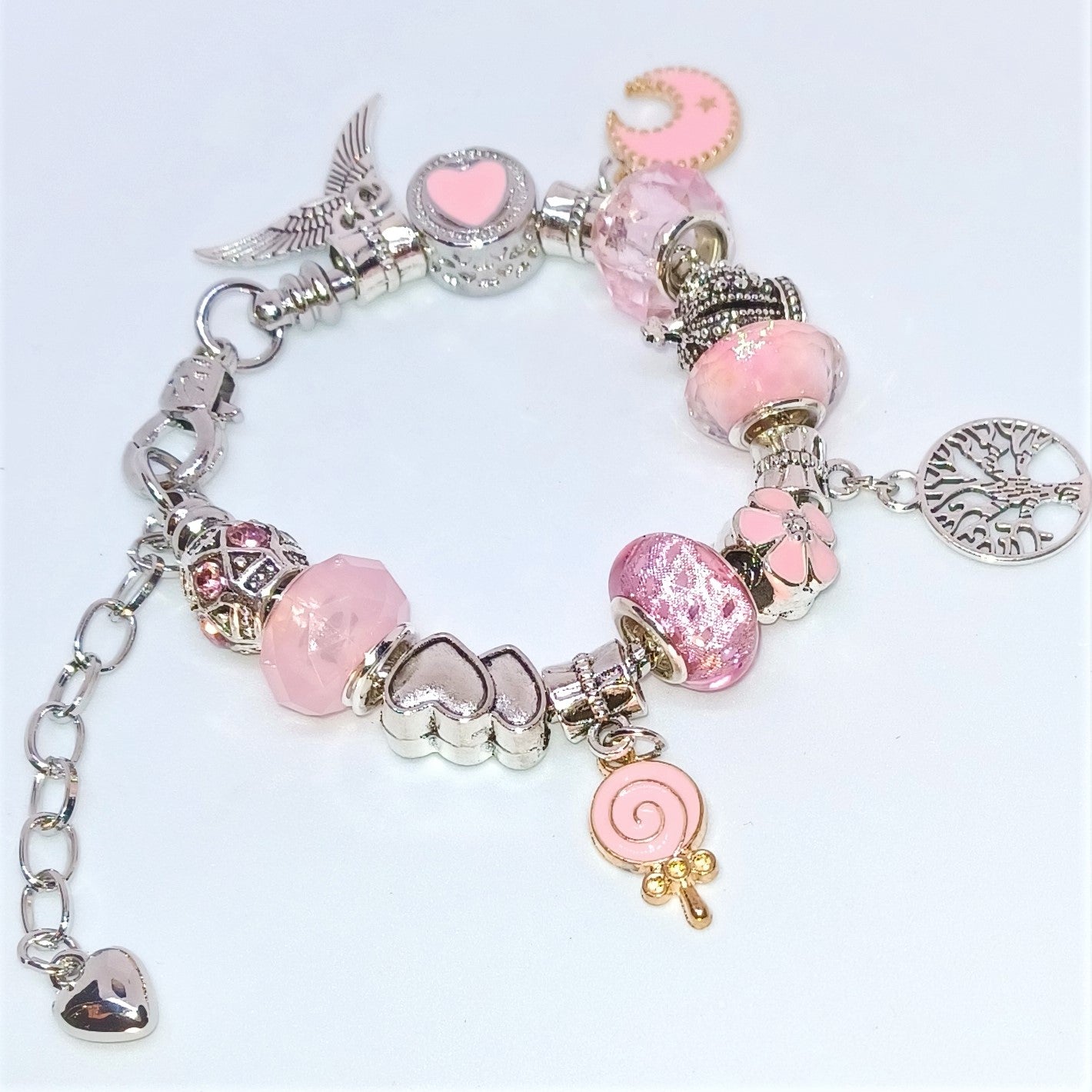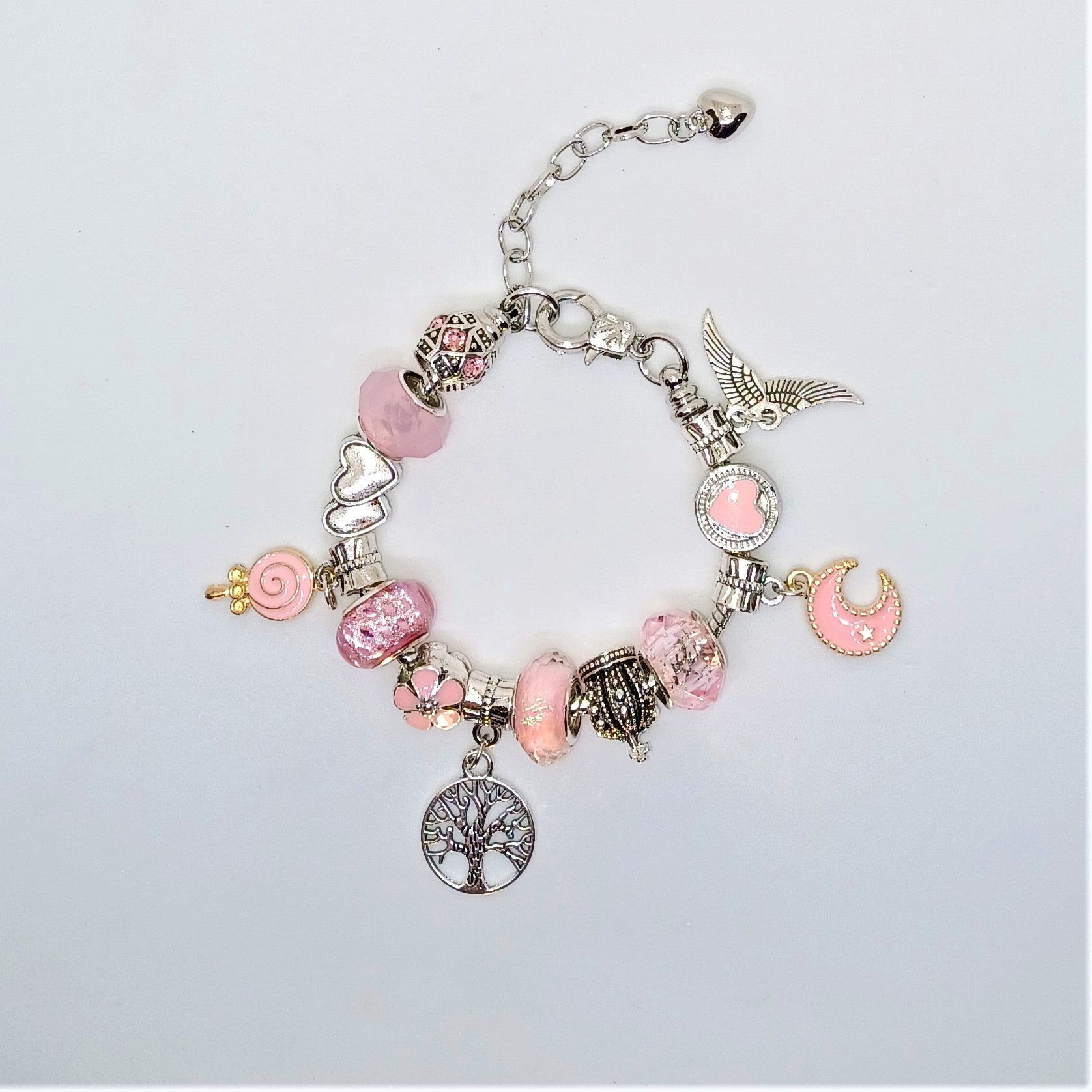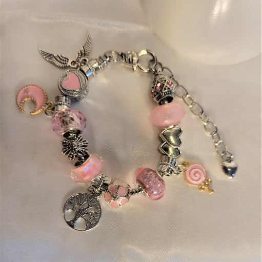 A pretty in pink lampwork beaded bracelet with a silver heart bead at the end of an extension, and pink accented silver beads. There are charms attached including a Tree of Life, a pink lollipop, a pink crescent moon, and silver wings. The bracelet is beaded on a silver snake chain. The bracelet is 5 to 6inches in length and has a diameter of 1.5 to 1.75inches.