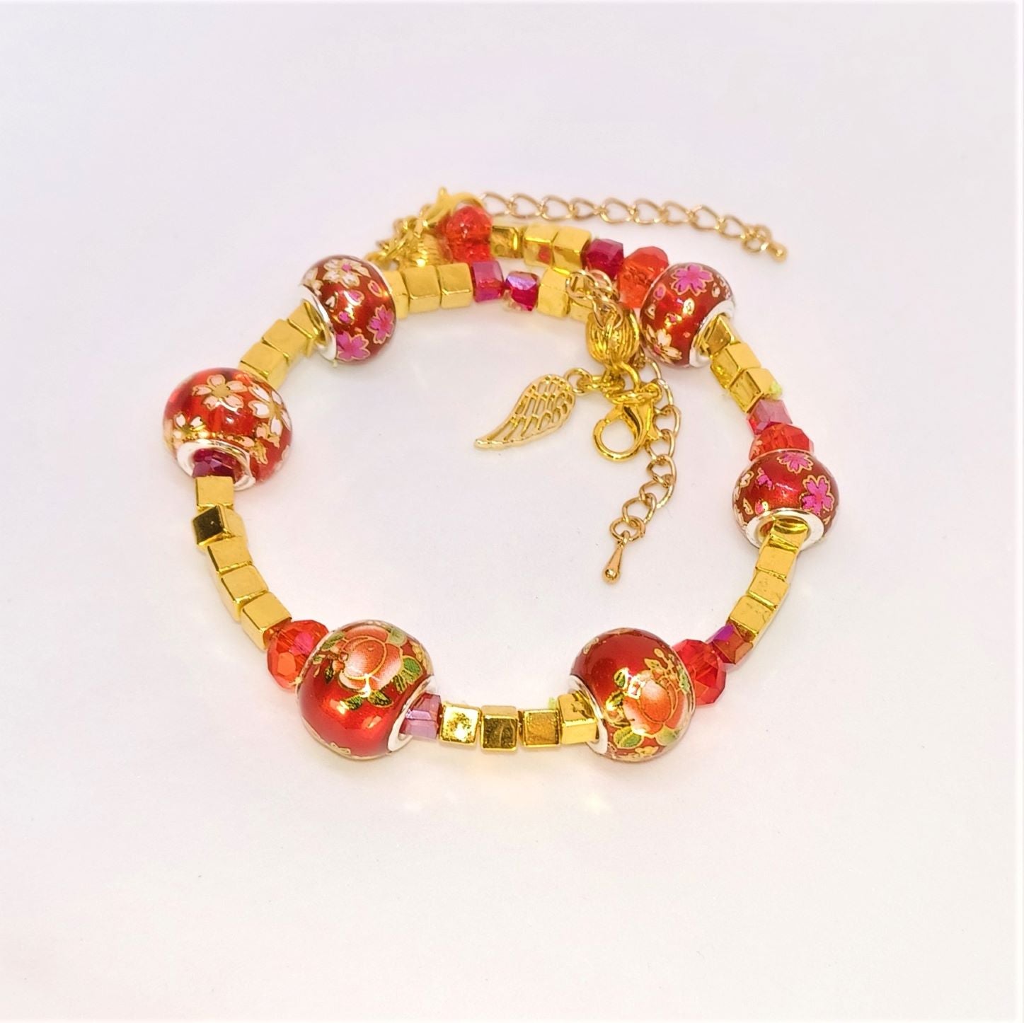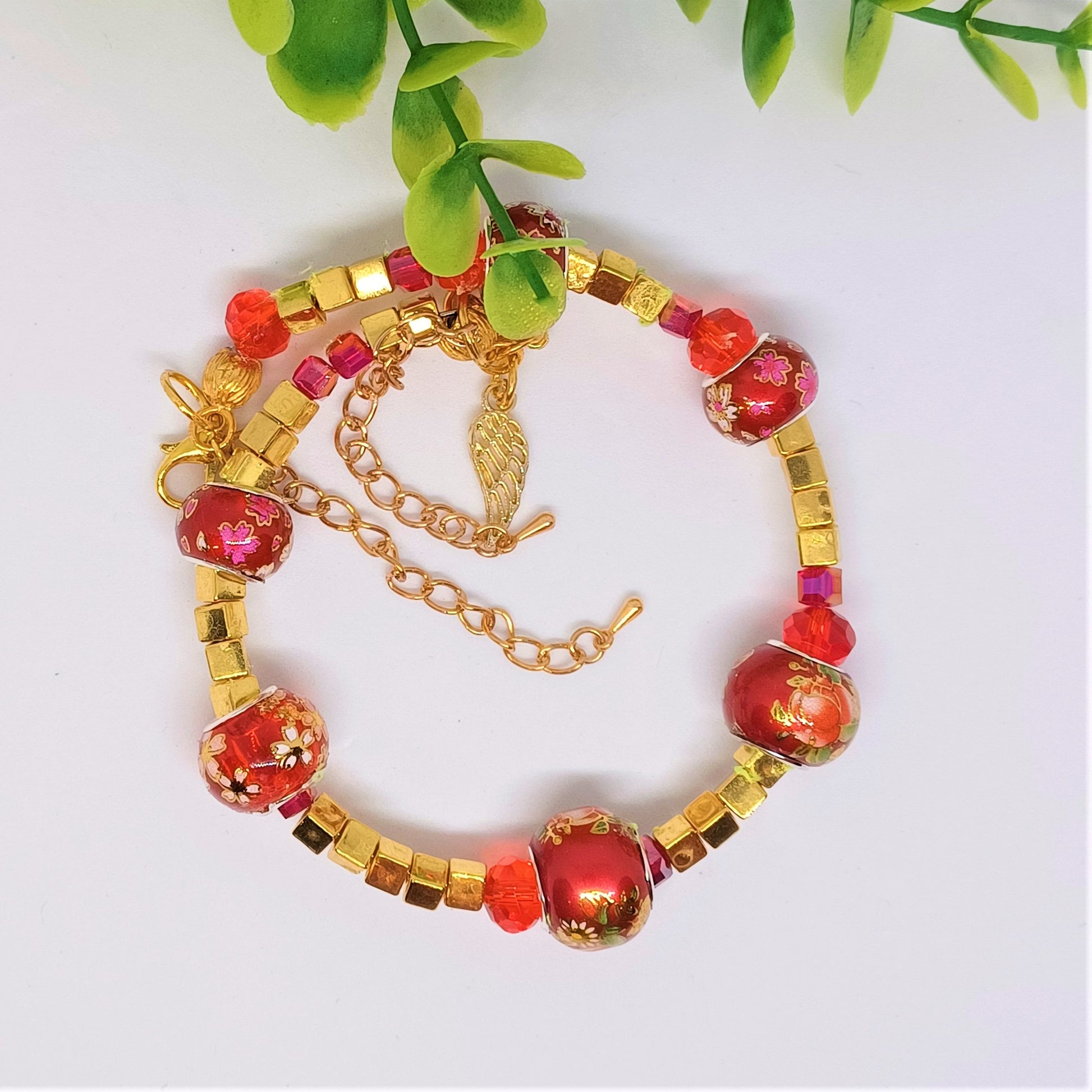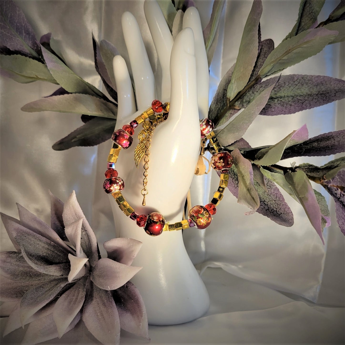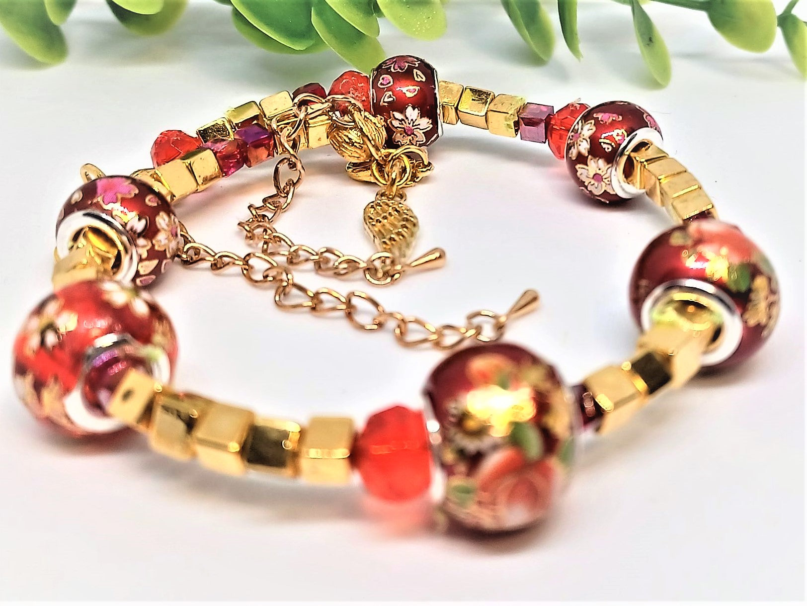 The remarkable red in jewelry! A single layer bracelet with red Murano beads with gold, green and white hand painted flower buds. It is accented with red Czech crystal beads, red cube shaped crystal beads and gold cubed spacer beads. It is perfect for any and all occasions as well as for the Holidays. A gold leaf charm is attached. An elegant piece full of stunning color.