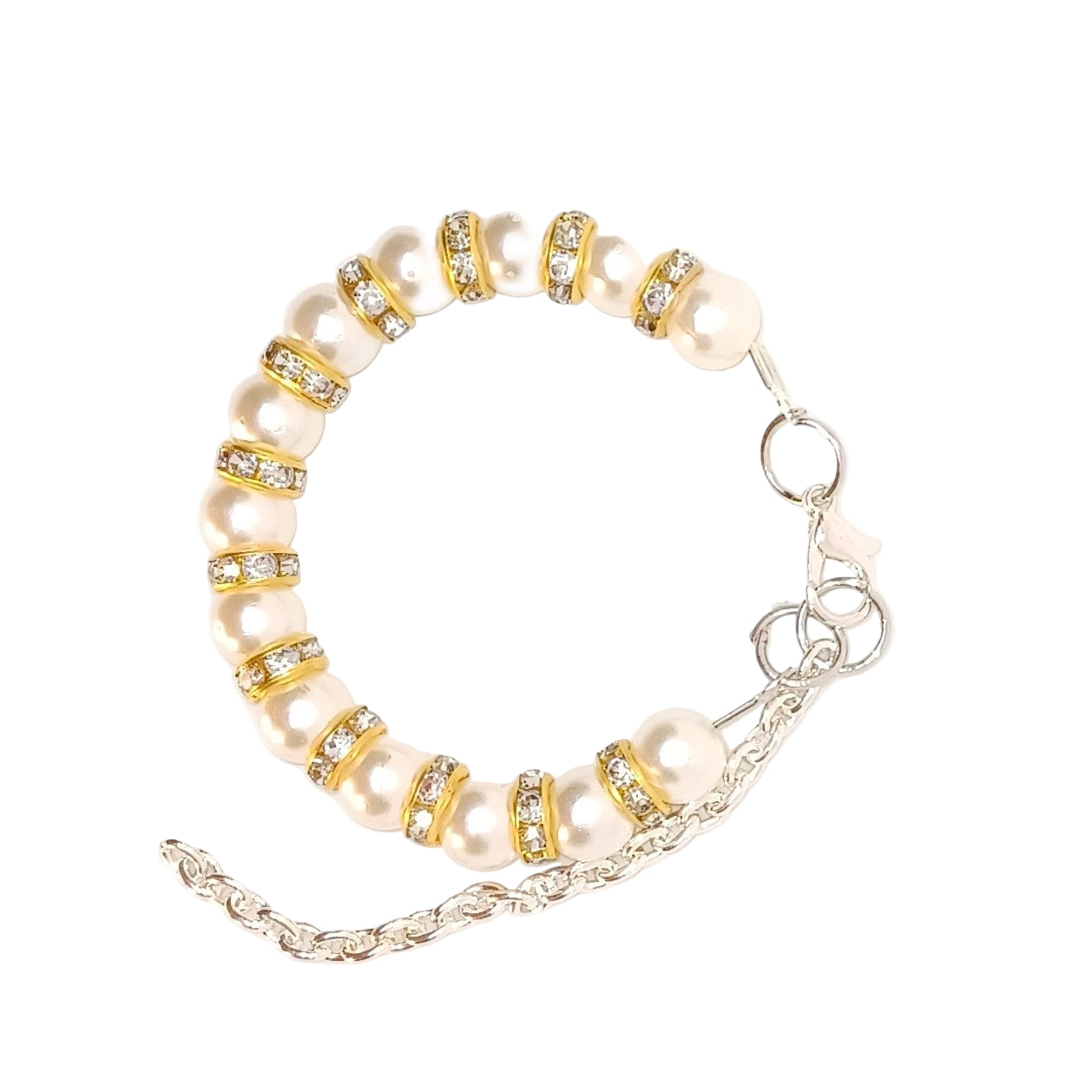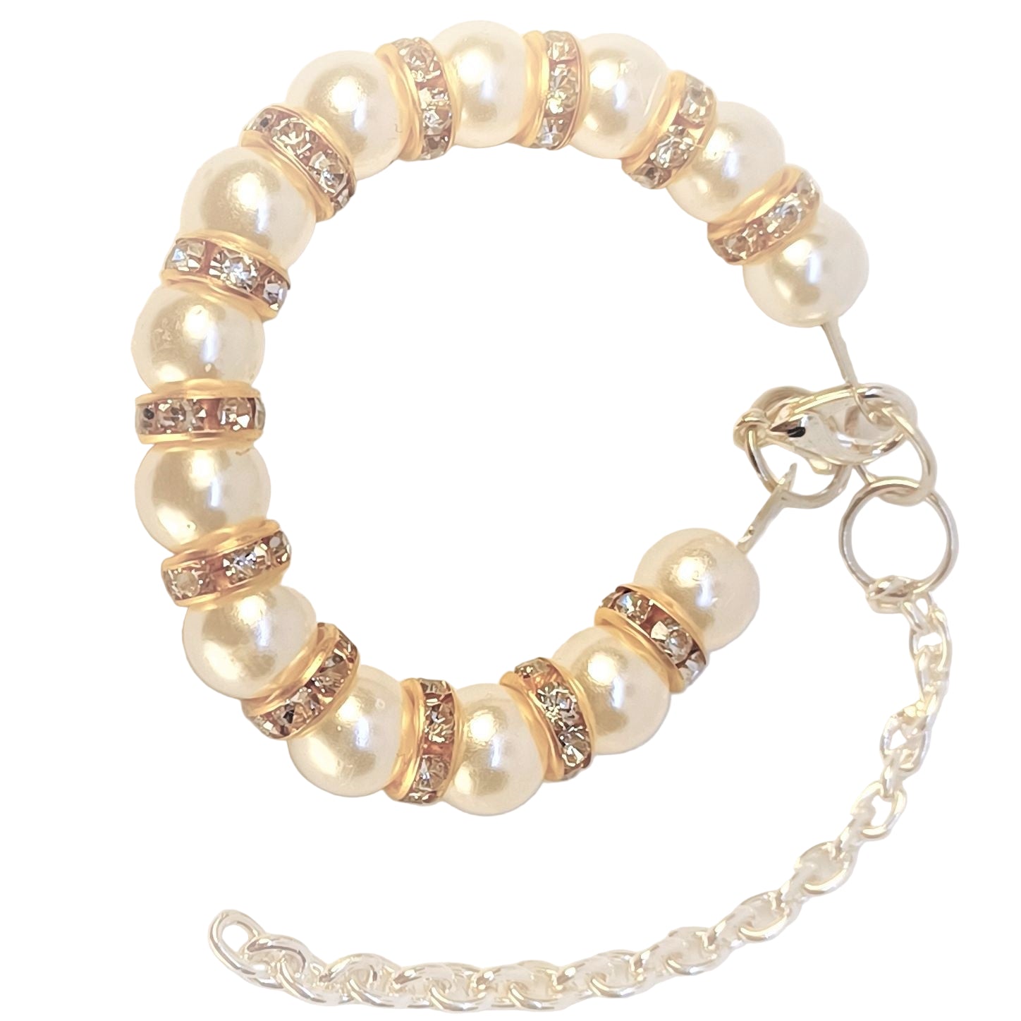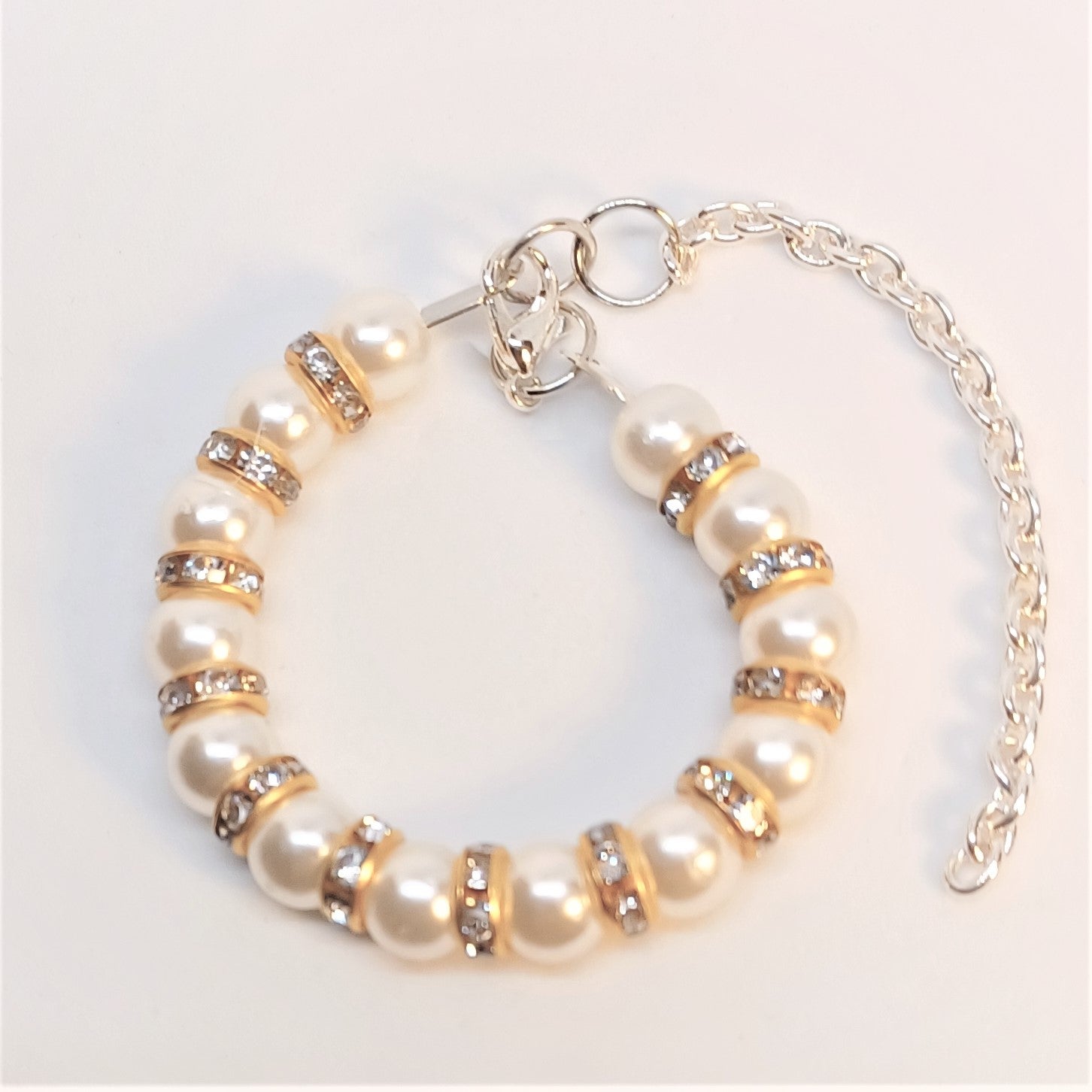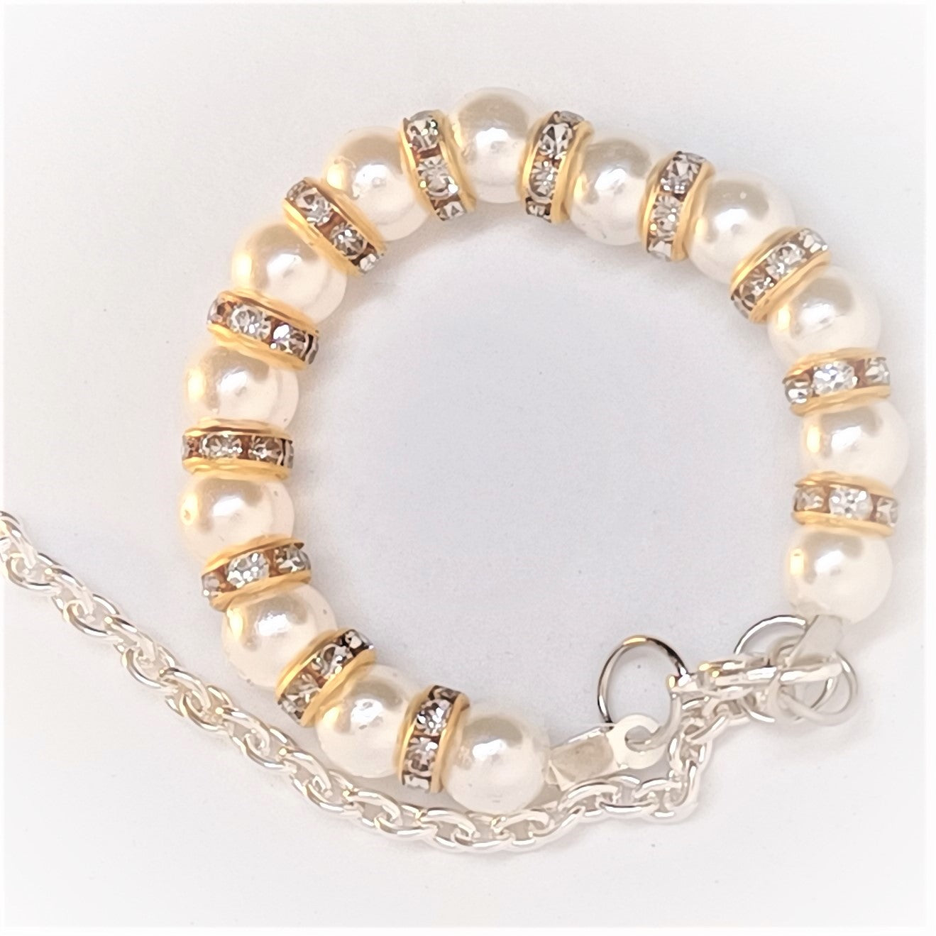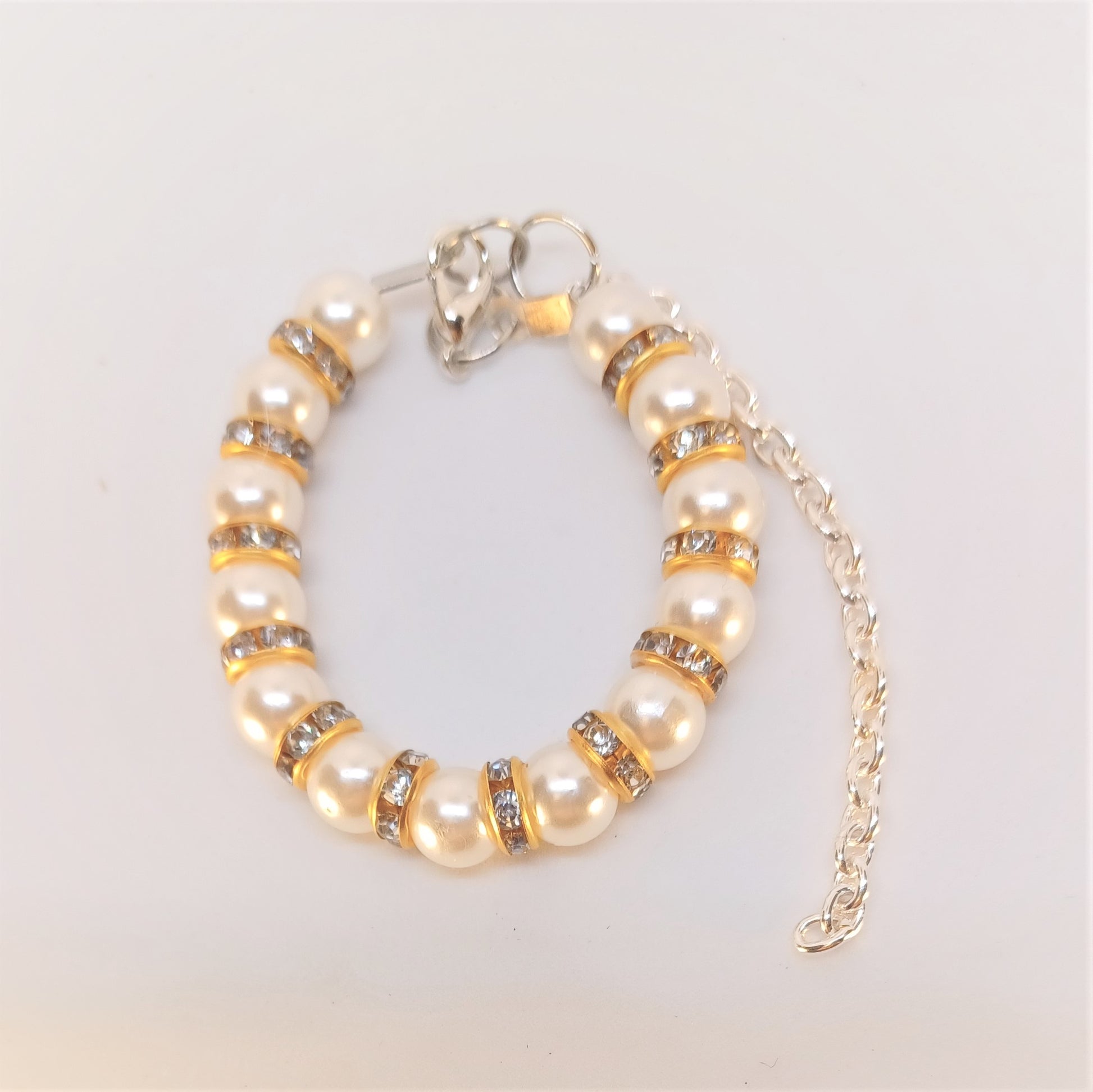 A small, but very elegant pearl bracelet, on an elastic stretch cord, with gold rhinestone beads next to each pearl. The length of this piece is 5inches and it has an approximate diameter of 1 to 1.5 inches. This is our smallest bracelet. It has a silver lobster clasp and a silver extension for adjustable sizing.