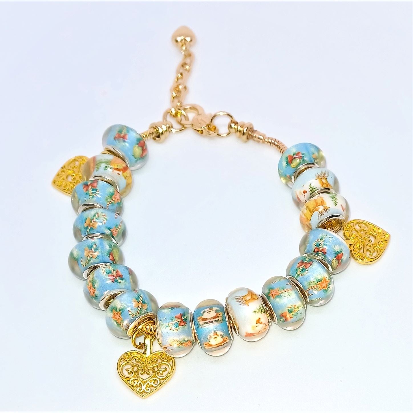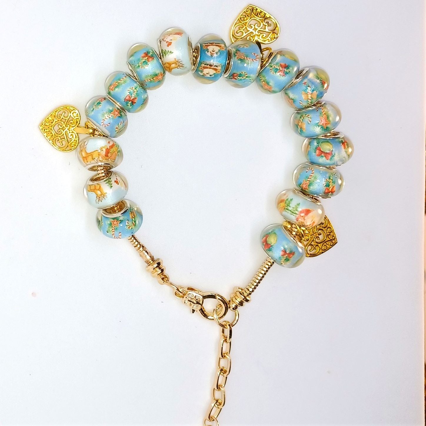A lampwork beaded bracelet with blue lampwork beads on a silver snake chain bracelet. There is an extension with a silver heart charm. Also included are three gold heart charms. The bracelet has a winter theme with snow, snowmen, reindeer, fur trees, candycanes and holly with ribbon. The bracelet is approximately 6.25 to 7.25inches in length.