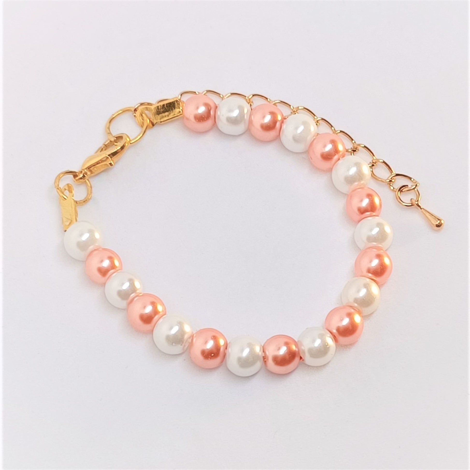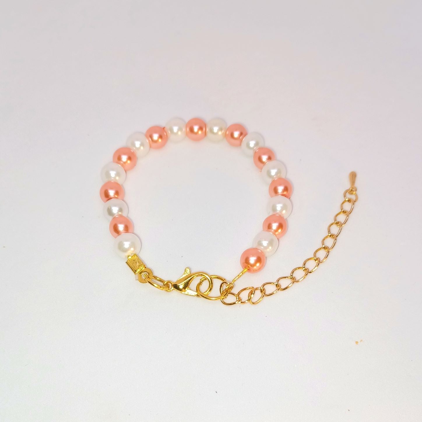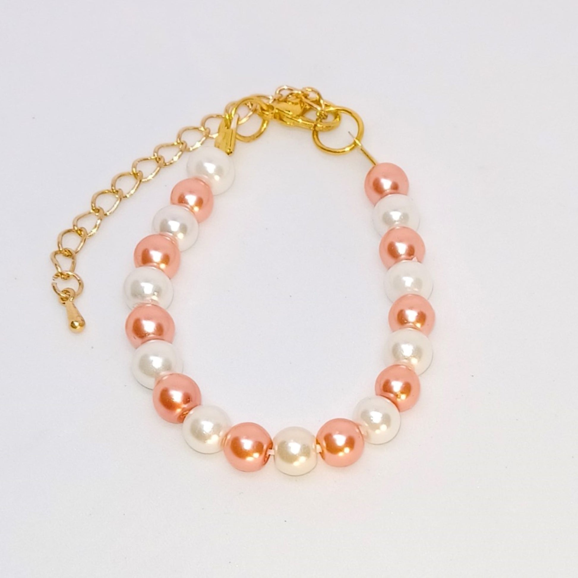 A dainty and soft toned pearl bracelet with pink and white pearls. The length is approximately 5.5inches and the diameter is approximately 1.5inches. This piece is beaded on a stretch cord. In addition, it has a gold extension for adjustment of fit and a gold lobster clasp.