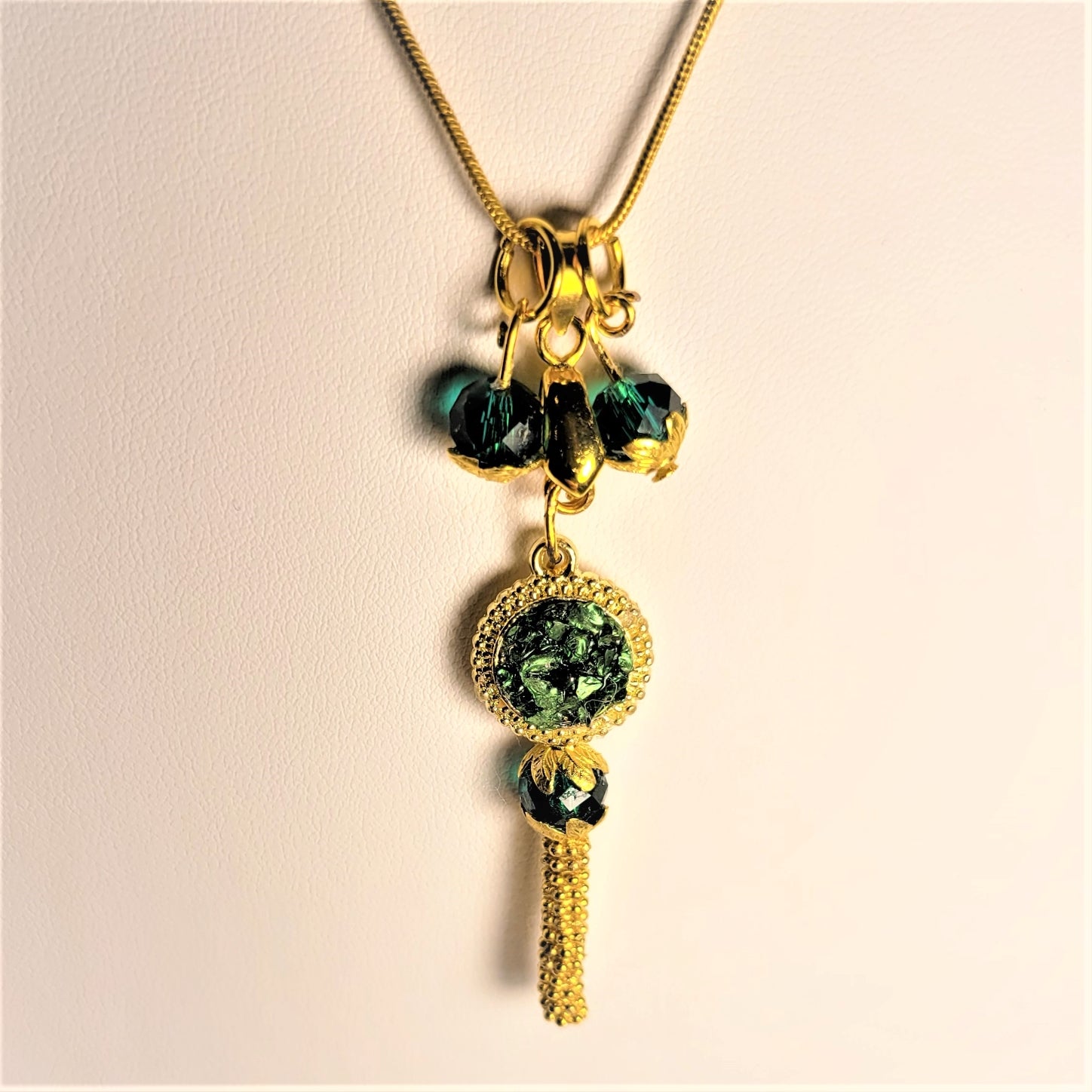 A pretty drop pendant necklace on a gold plated 18in snake chain. The drop includes a gold finished brass, single sided, side beaded focal which contains druzy in a pretty green. Attached is a drop stack of gold daisy wheel beads. Also, there are Czech emerald crystal beads with gold bead caps around the focal and daisy stacked beads. Attached to the snake chain are two gold extensions and a lobster clasp for adjustment of fit, comfort and security. The total length of the chain with focal attached is 11.75in.