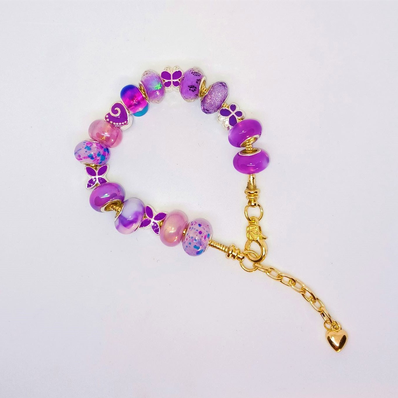 A pretty purple and pink toned lampwork bead bracelet. There are charm like beads in silver with a purple heart, flower buds and butterflies. The lampwork beads are colorful with different accents that shine. Beaded on a gold snake chain bracelet with an extension secures the beads in place and allows for some adjustment in size. The piece is approximately 7.5inches in length