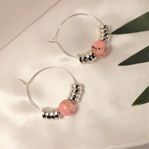 A set of silver plated 20mm hoop earrings with pink Howlite stone beads. The beads are surrounded by round silver spacer beads that add a great accent and shine.