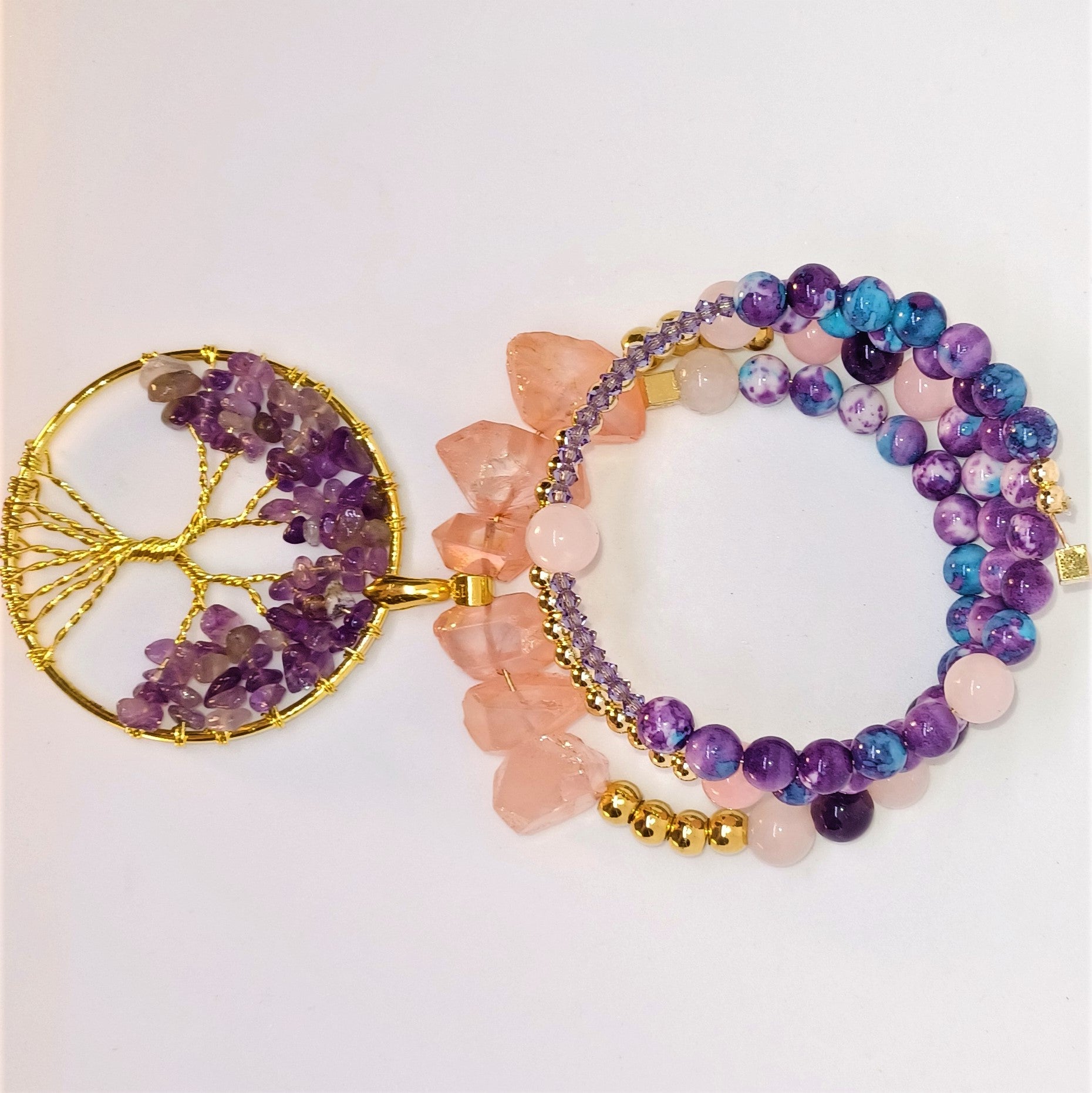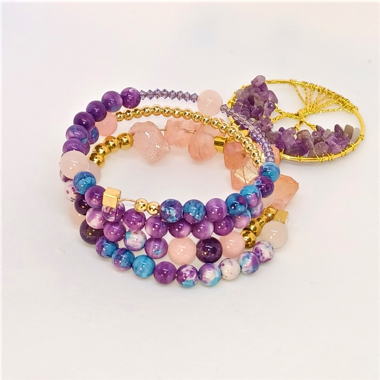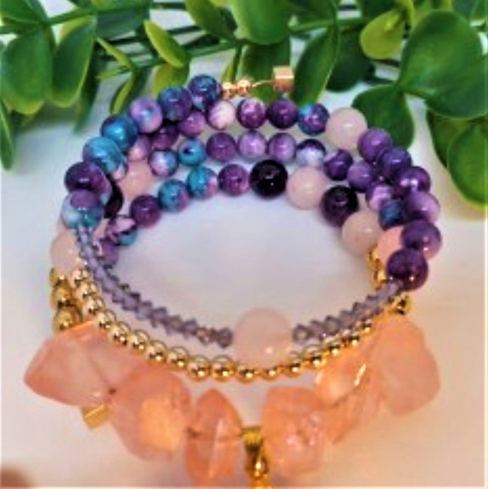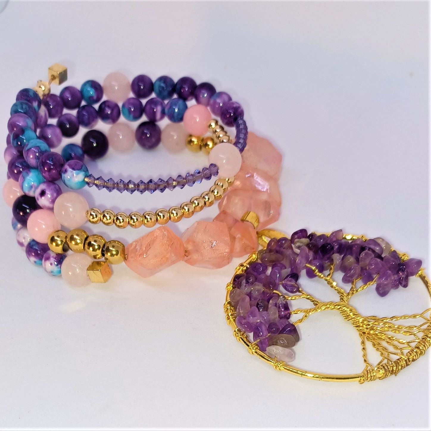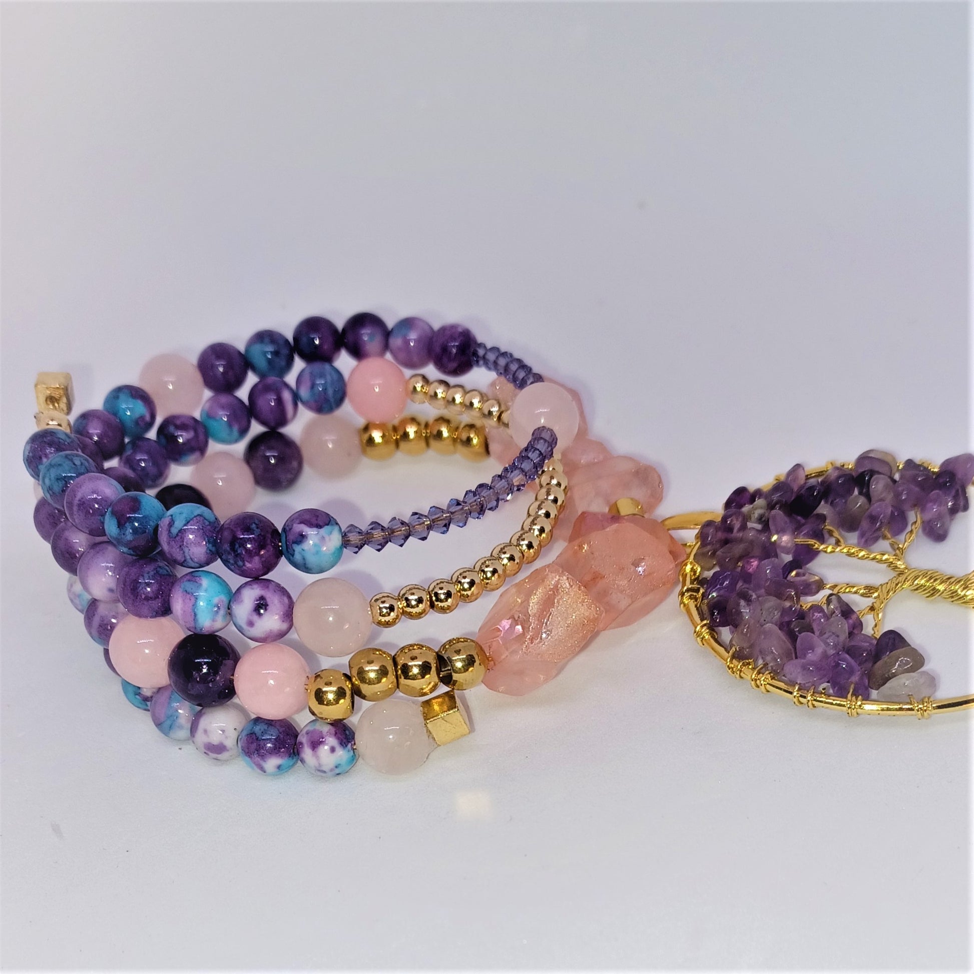 A Strawberry Hill Forever Multilayer Wrap Bracelet with beautiful multicolored Rainbow Tigers Eye mixed with Sea Sediment Jasper Beads and accented with soft pink natural stone beads. With the addition of light pink Himalayan Reike beads this piece has outstanding color. A Tree of Life Pendant attached to the front adds a personal touch of elegance. Small purple Preciosa beads on the first strand make this piece of jewelry a statement piece to be admired. Beaded with memory wire that conforms to the wrist maintains the shape of the bracelet. There are gold cubed end terminators at both ends of the strand of beads. This bracelet will hold its place in time and be appropriate for any and all occasions.