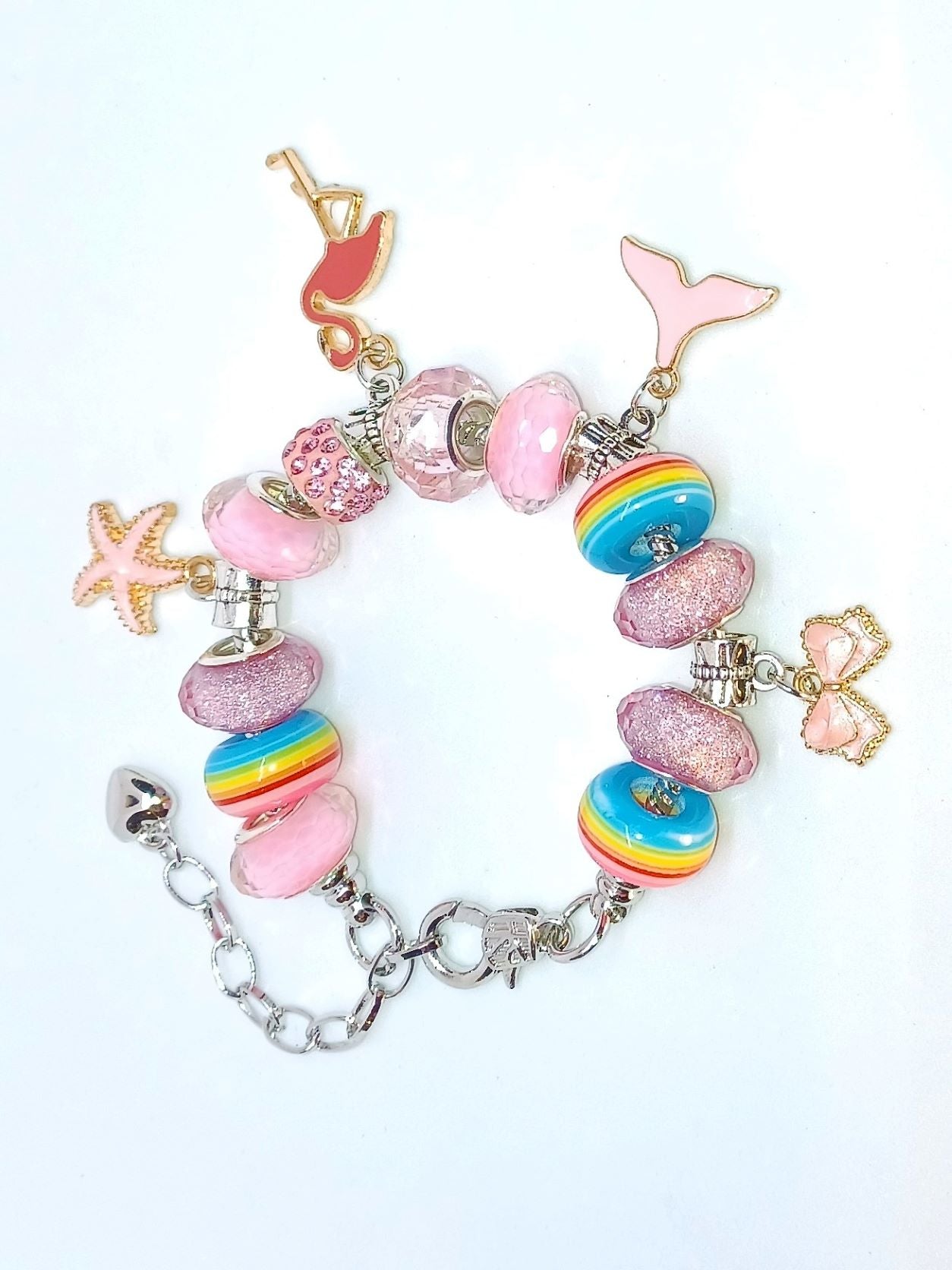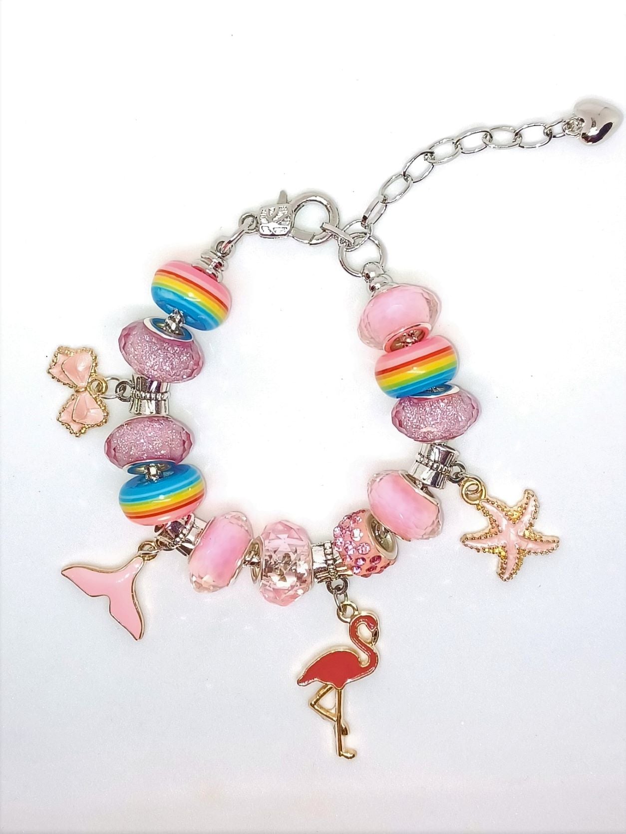 A tiny bracelet that will thrill a little girl! Comprised of pretty pink lampwork beads and silver beads this piece is special. In addition, there are charms made up of a pink and gold flamingo, pink and gold fish tails, a pink and gold starfish and a pink and gold bow. Beaded on a silver snake chain with an extension with a silver heart this bracelet is approximately 5inches in length and 1.5inches in diameter.