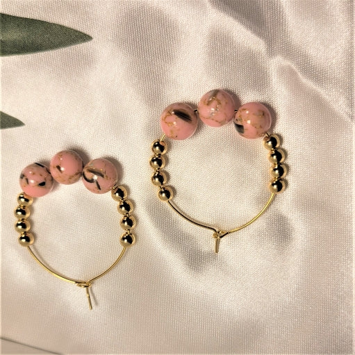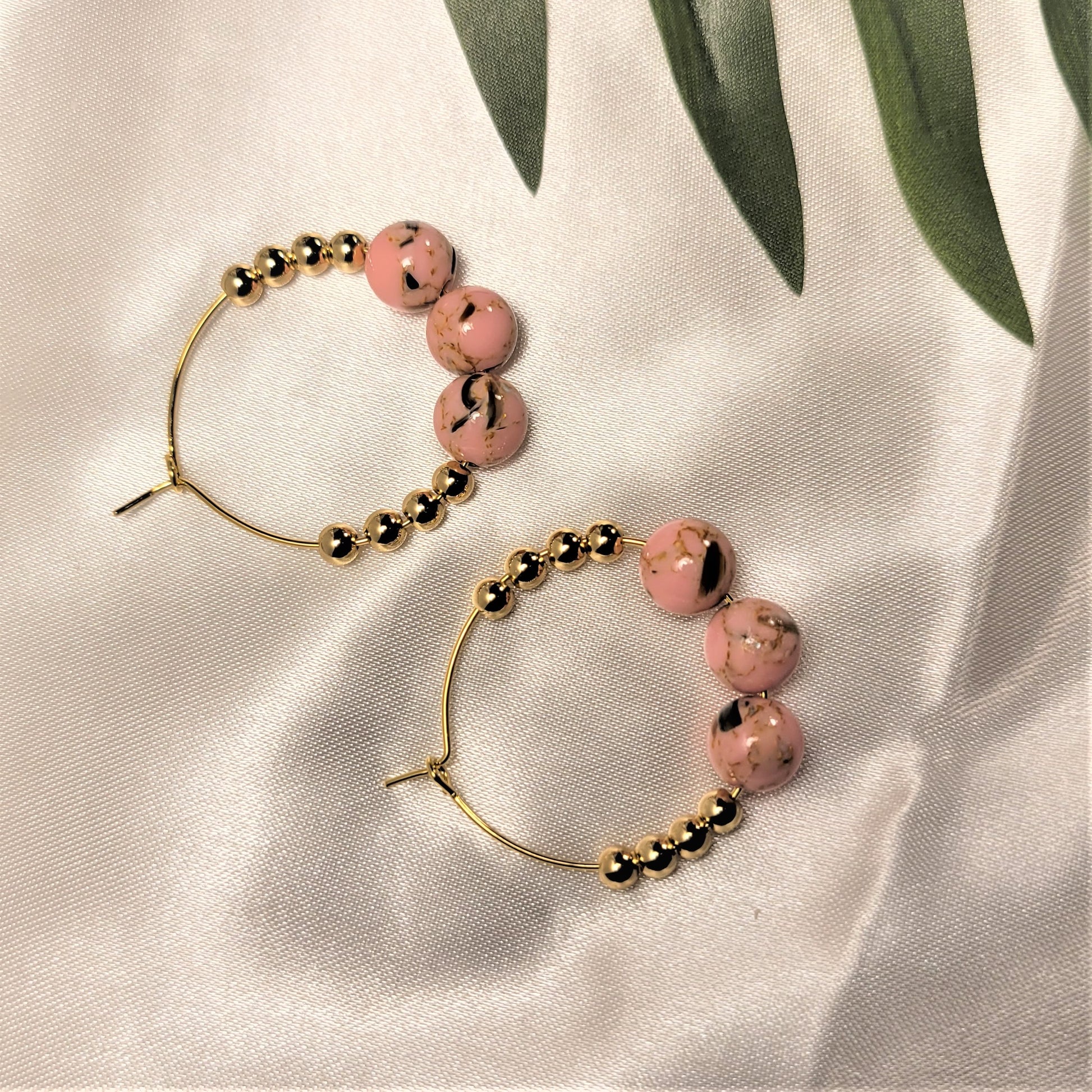 A set of 18K gold plated hoop earrings, 25mm in size, with three pretty pink 8mm Howlite stones each, and surrounded by gold round beads. Earrings that will make anyone feel like a million and looking great