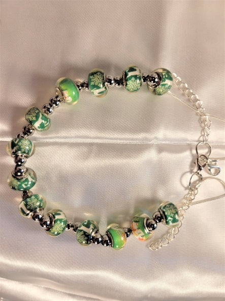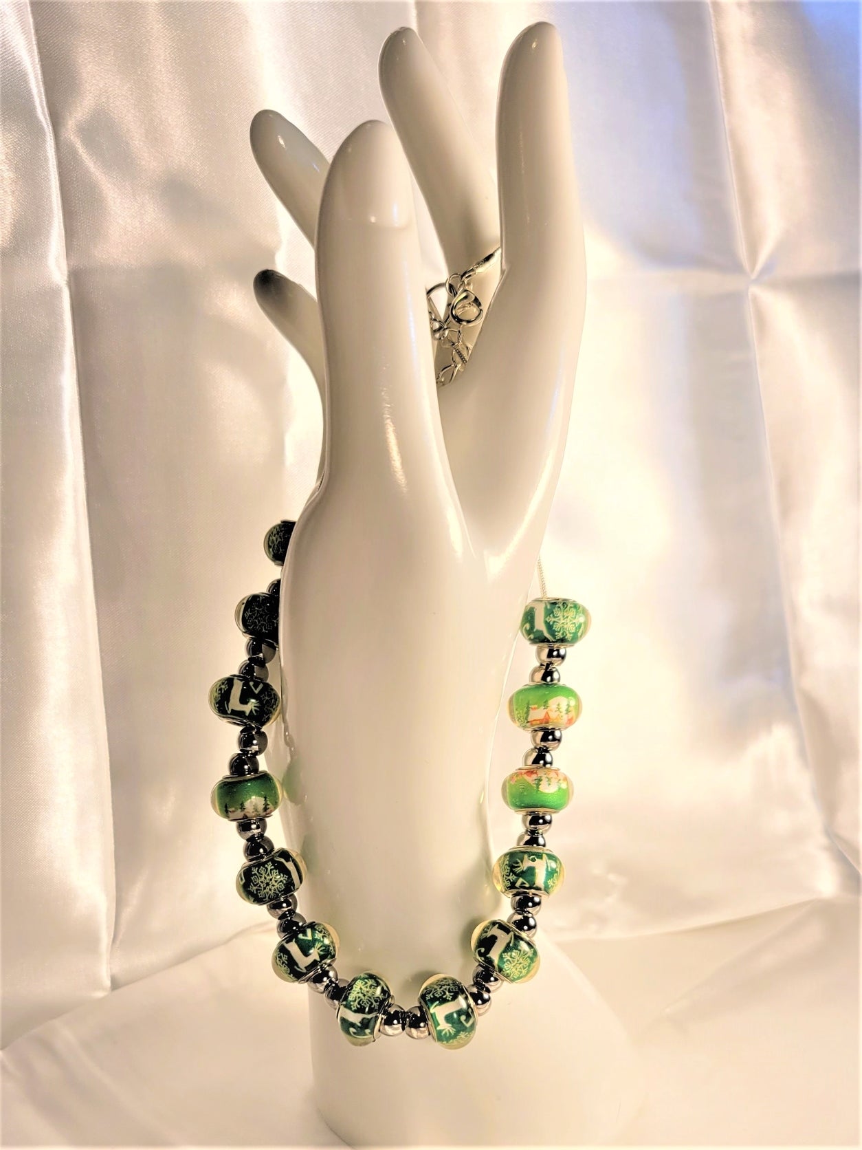 A lampwork beaded necklace with green beads accented with a white winter theme including snowflakes and deer. There are silver round beads added throughout that add shine and color to the lampwork beads.The necklace is beaded on a silver plated necklace that is 16inches in length. The piece has two silver extensions and two lobster clasps for adjustment in size and security.